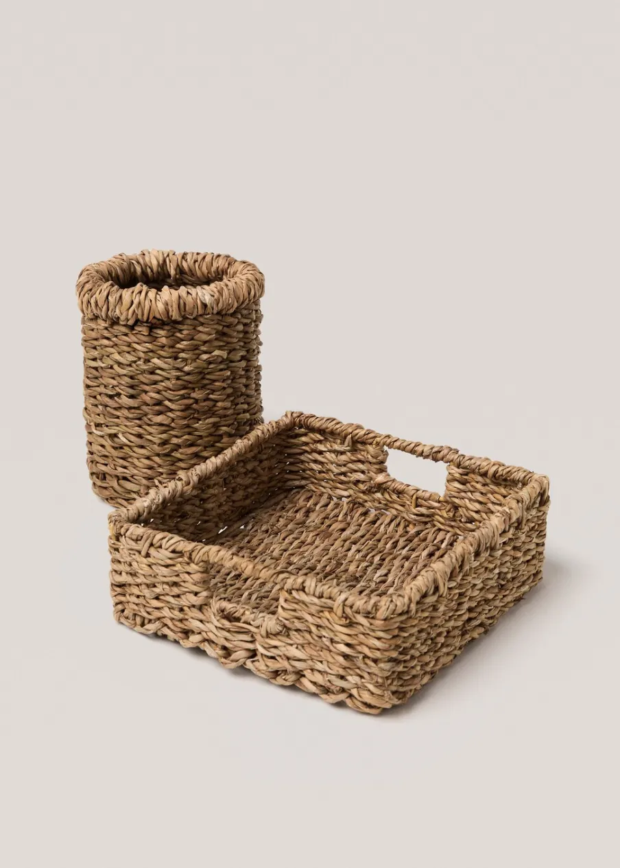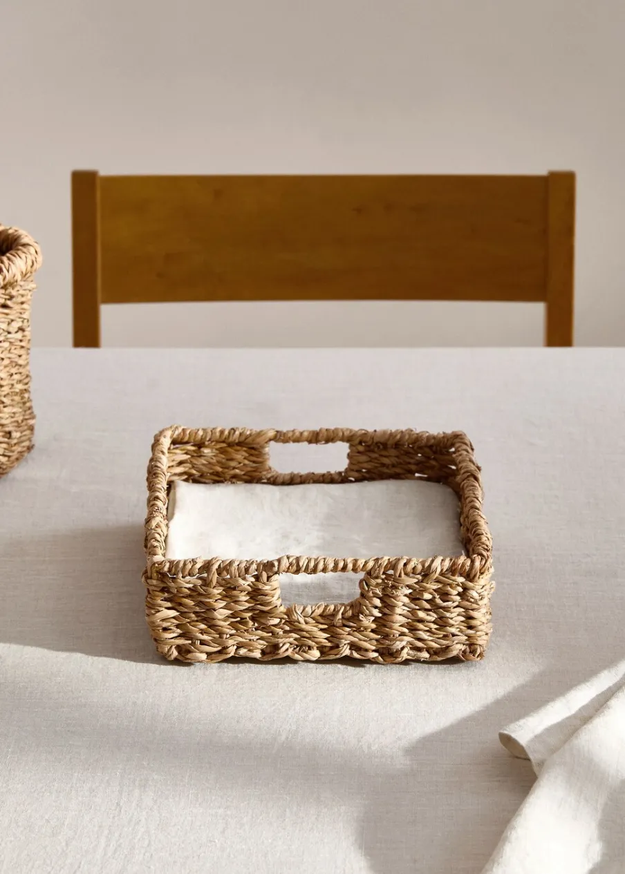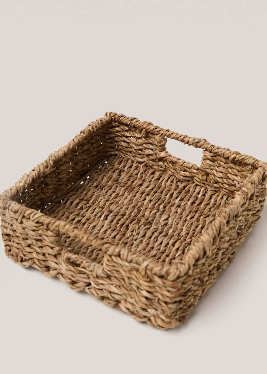 Wyrób ręczny. Tkanina z naturalnego włókna. Wykonana ręcznie z naturalnego i w 100% zrównoważonego materiału: alg morskich. Idealna do przechowywania drobnych przedmiotów w dowolnym pokoju w domu. Wymiary: 22 x 22 x 6 cm.