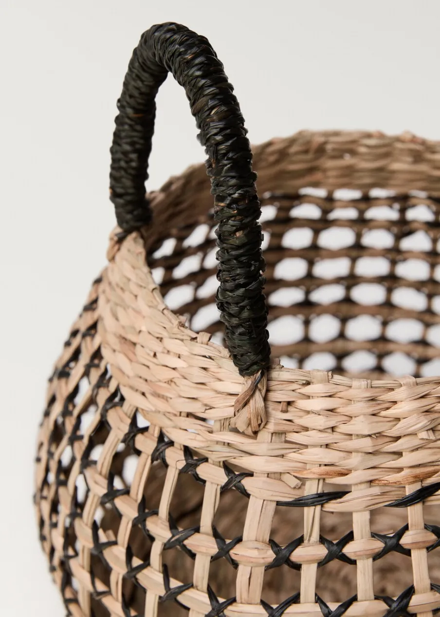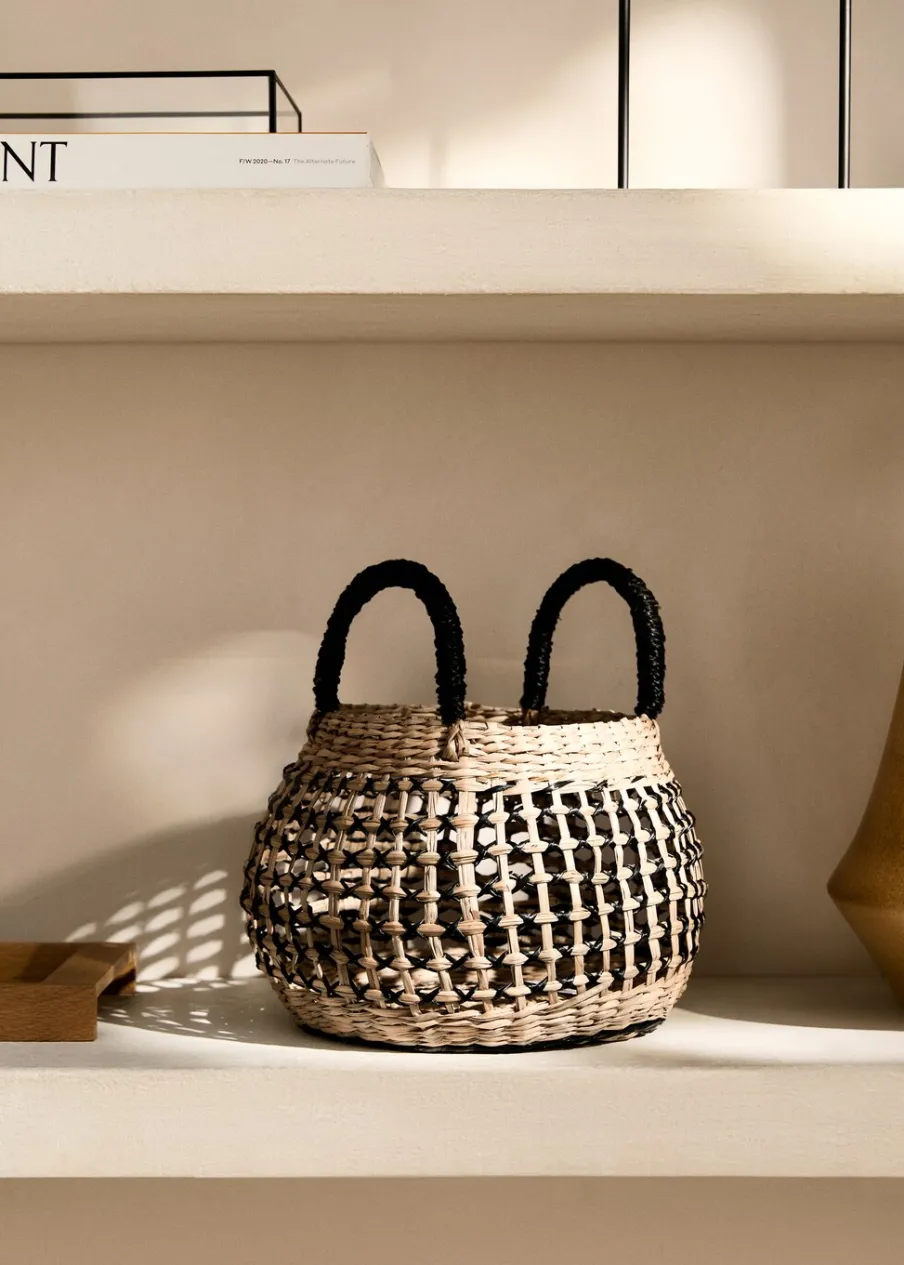 Przedmiot dekoracyjny. 100% alga. Wysokość: 17 cm. Podwójny uchwyt. Dwukolorowy deseń. Nasz koszyk nie tylko jest praktycznym sposobem na utrzymanie porządku w domu, ale także doda ciepłego charakteru i tekstury do wystroju wnętrza. Idealny wybór do połączenia z różnymi stylami dekoracji. Połączenie funkcjonalności i elegancji.