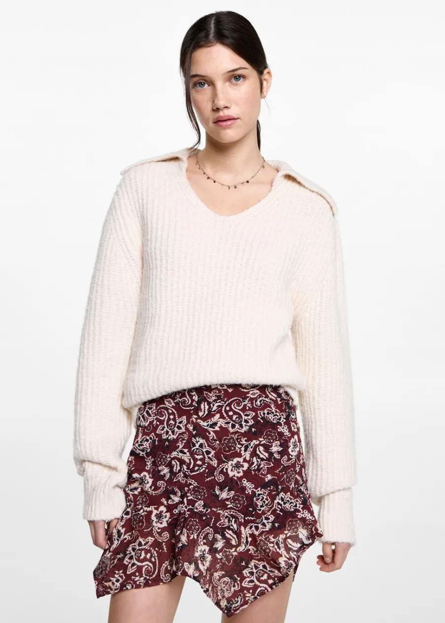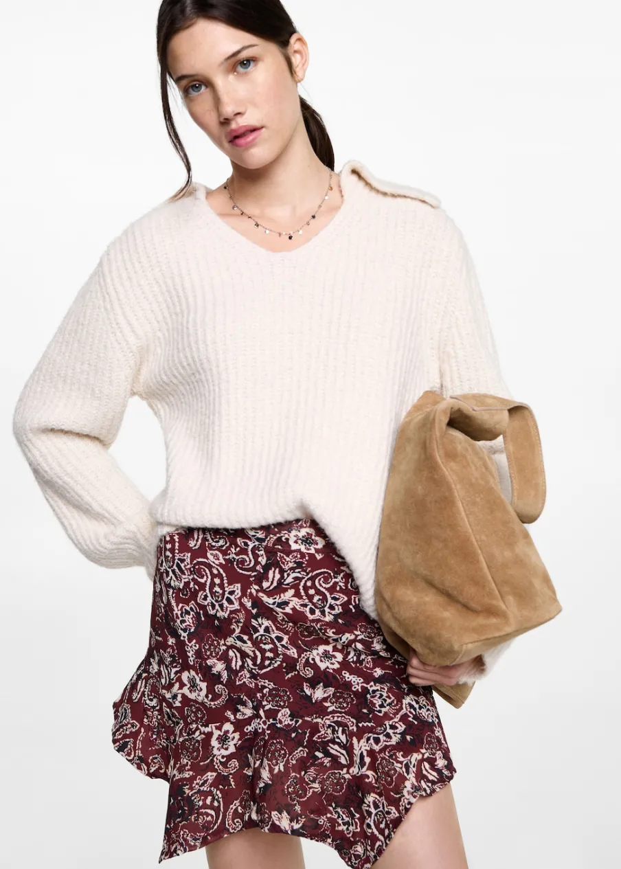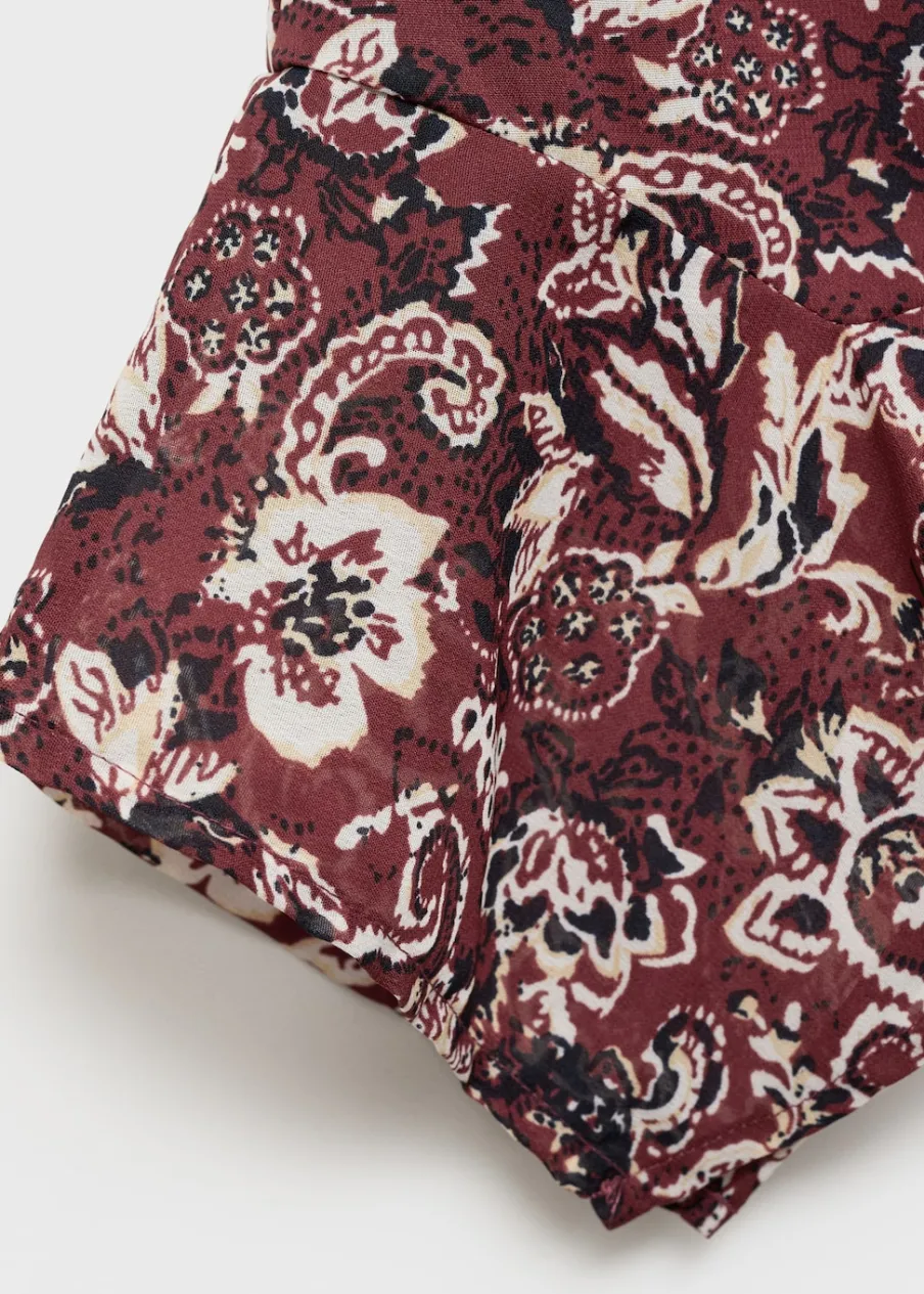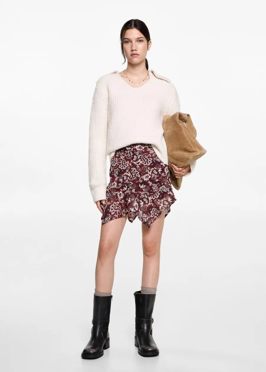 Lejąca tkanina. Nadruk. Asymetryczny krój. Krótki krój. Kryte zapięcie na zamek z boku. Modelka ma 172 cm wzrostu i nosi rozmiar M.