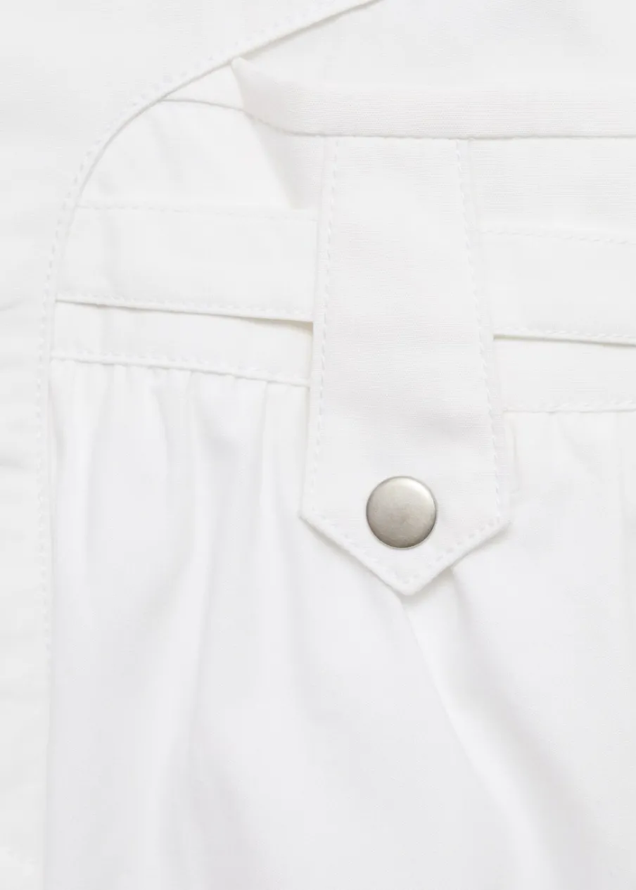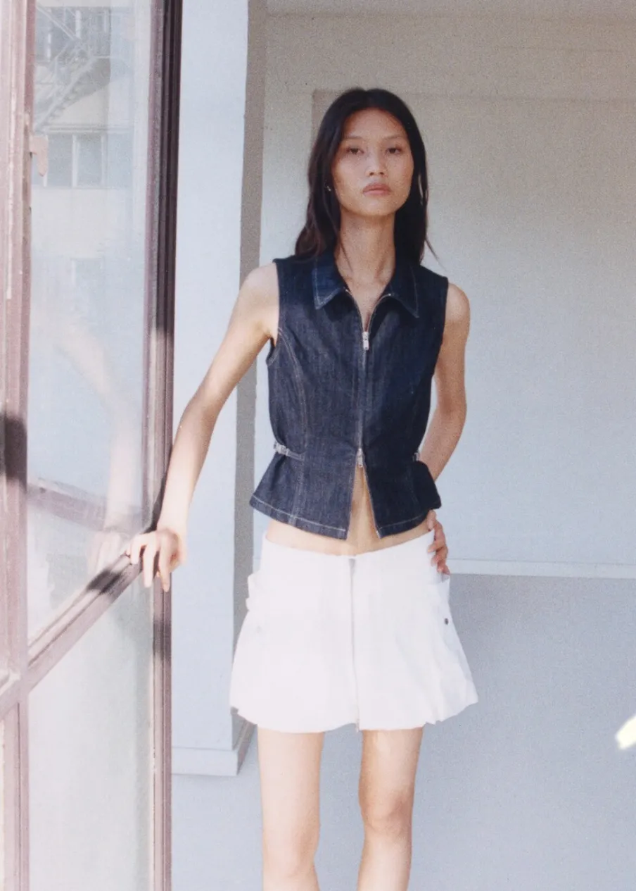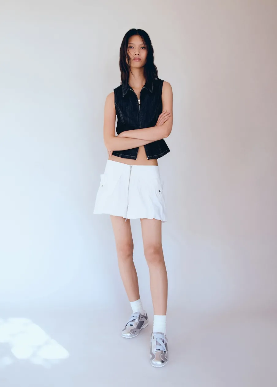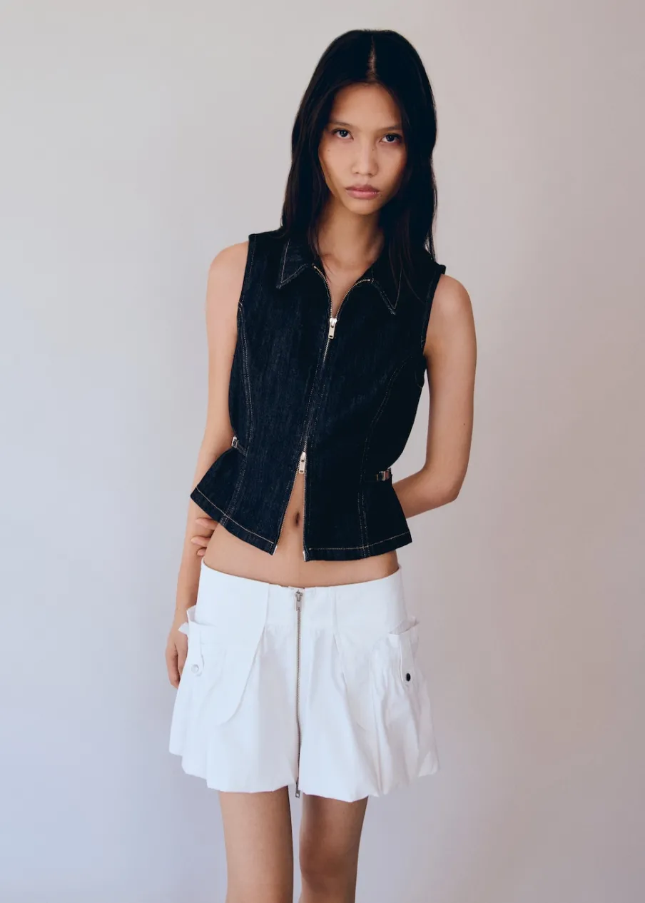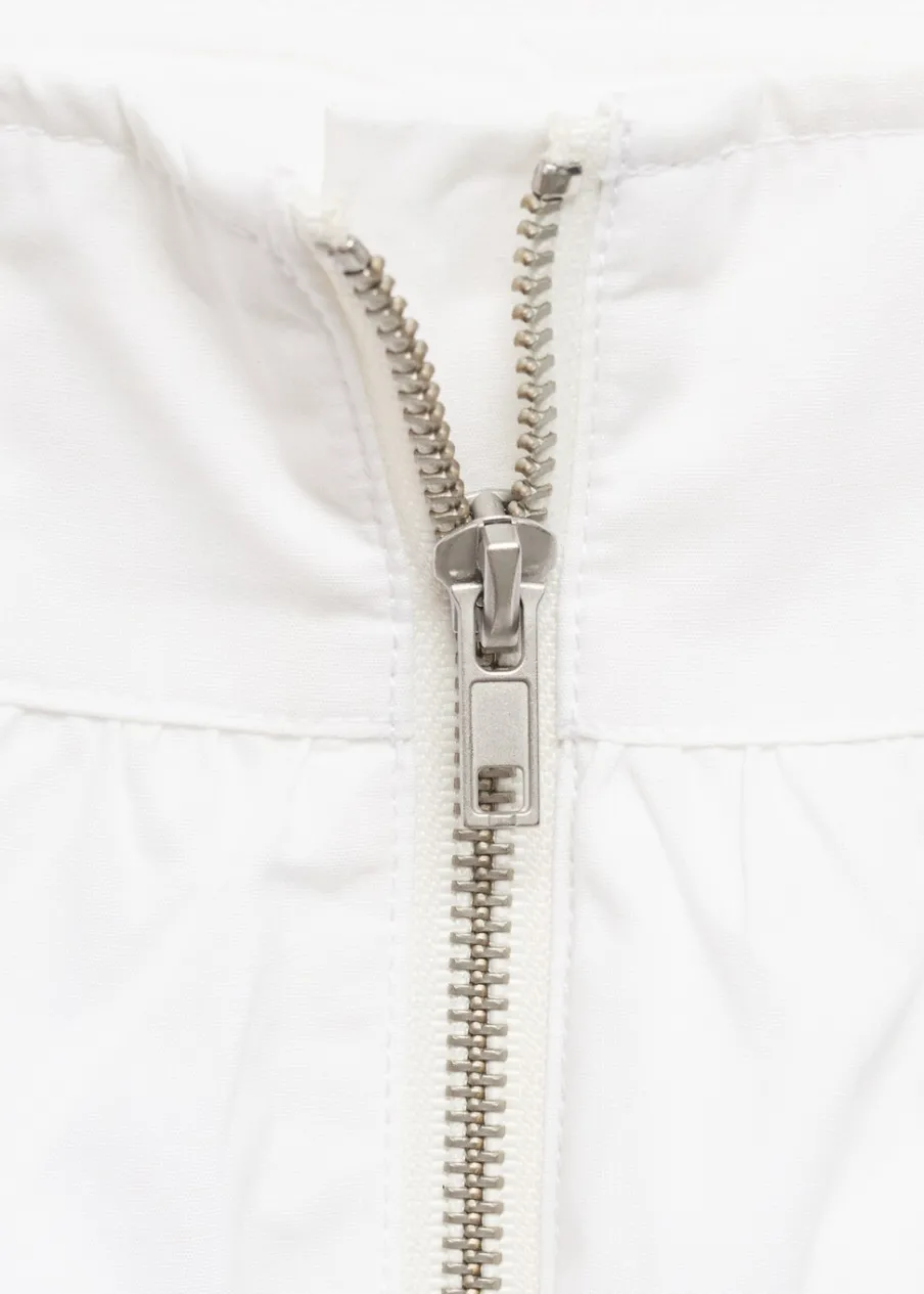 Fason bombka. Krótki krój. Niski stan. Zapięcie na suwak. Metalowy element. Modelka ma 178 cm wzrostu i nosi rozmiar S/36. Tkanina z 100% bawełny.