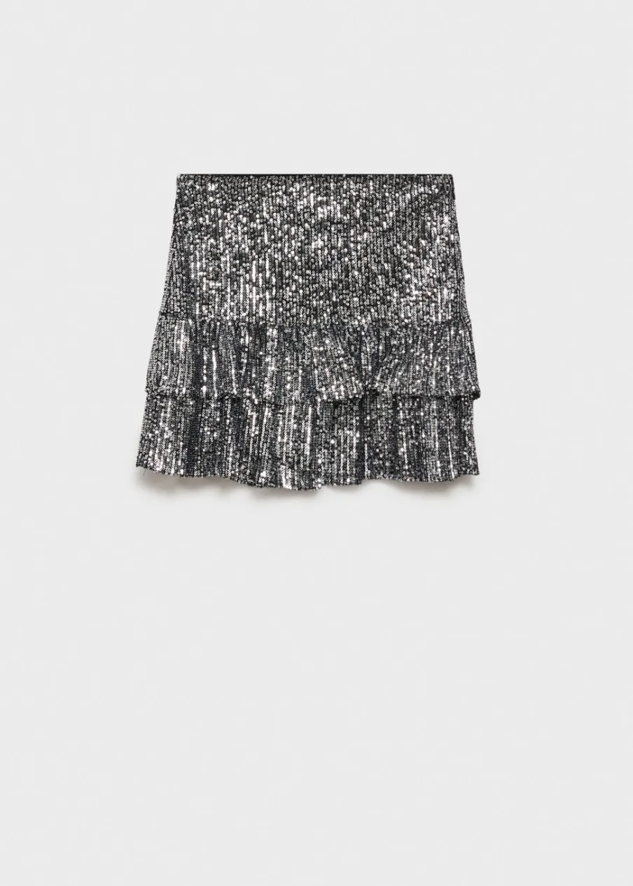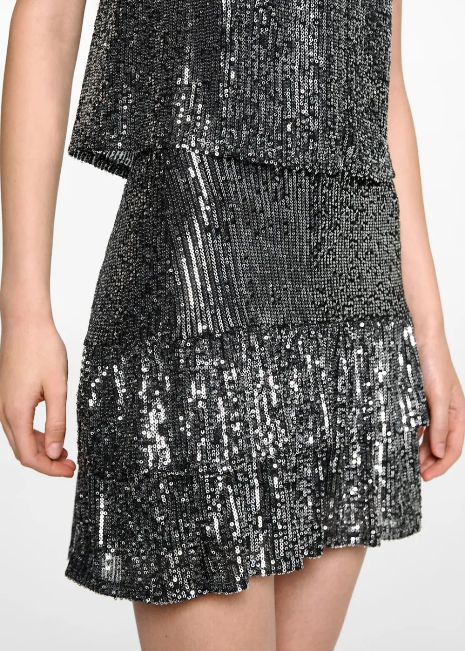 Zapięcie z boku. Krótki krój. Tkanina z cekinami. Model z falbankami. Modelka ma 172 cm wzrostu i nosi rozmiar M. Total look. Kolekcja wieczorowa i imprezowa. Party Collection.