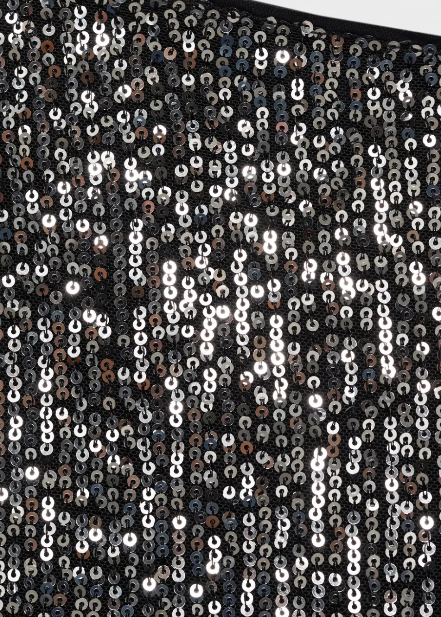 OpisZapięcie z boku. Krótki krój. Tkanina z cekinami. Model z falbankami. Modelka ma 172 cm wzrostu i nosi rozmiar M….