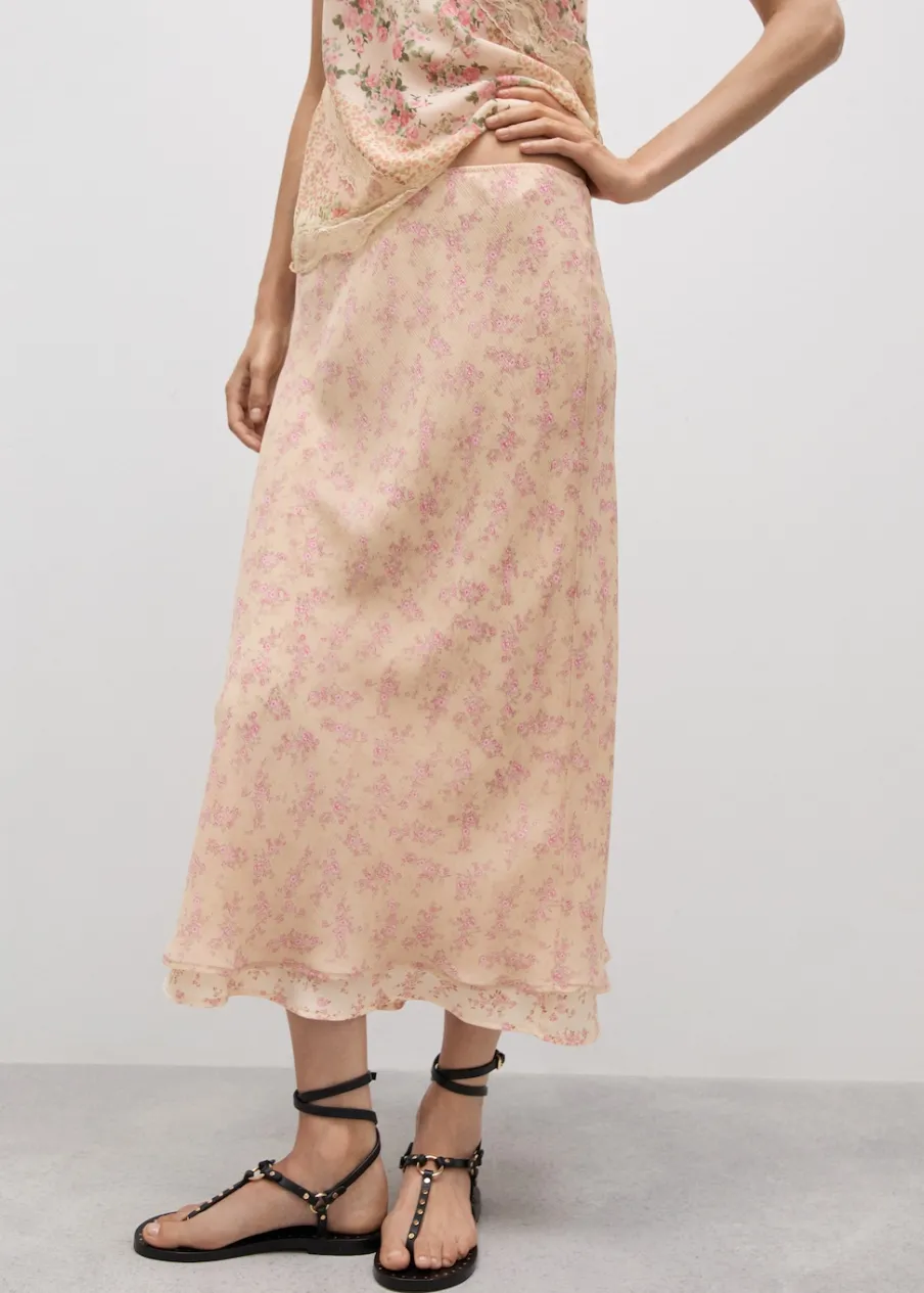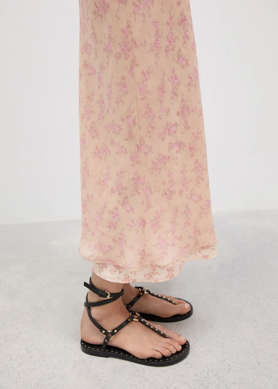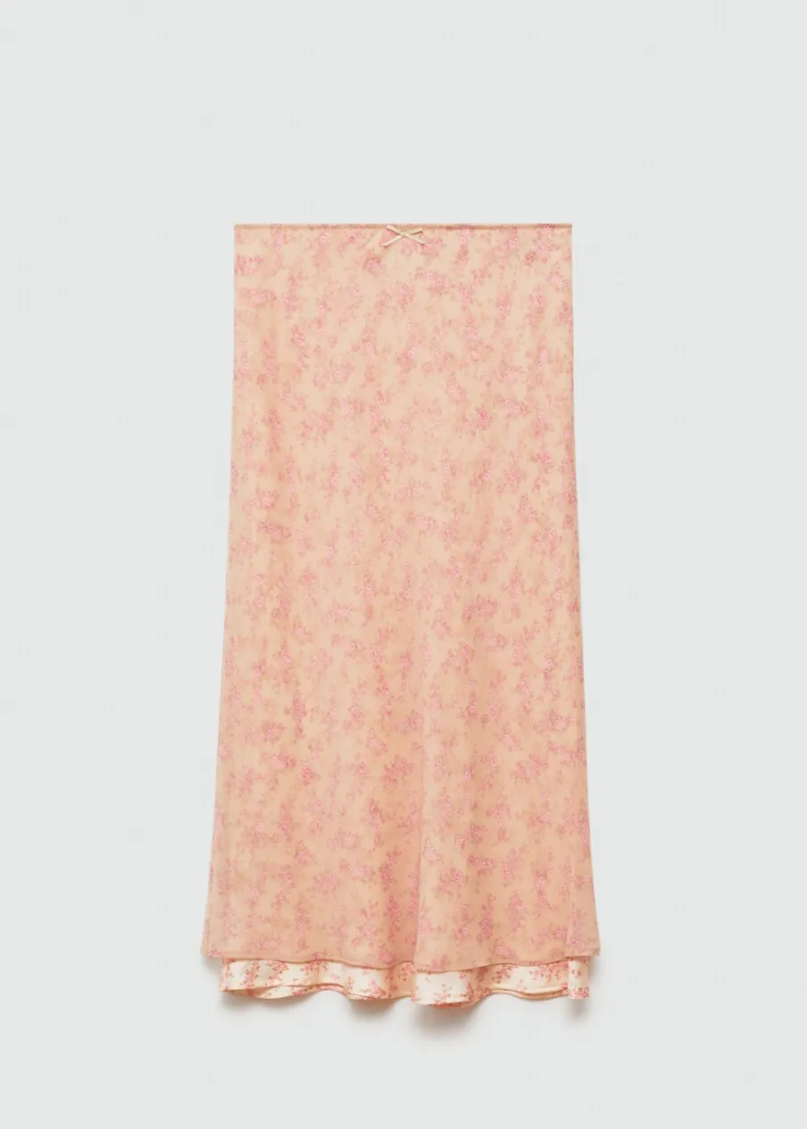 Lejąca tkanina. Model prosty. Model długi. Kwiatowy wzór. Elastyczny pas. Ozdobna kokardka. Wewnętrzna podszewka. Kolekcja wizytowa.