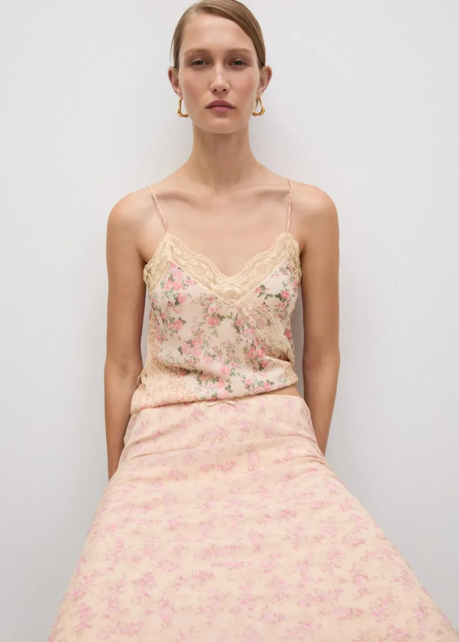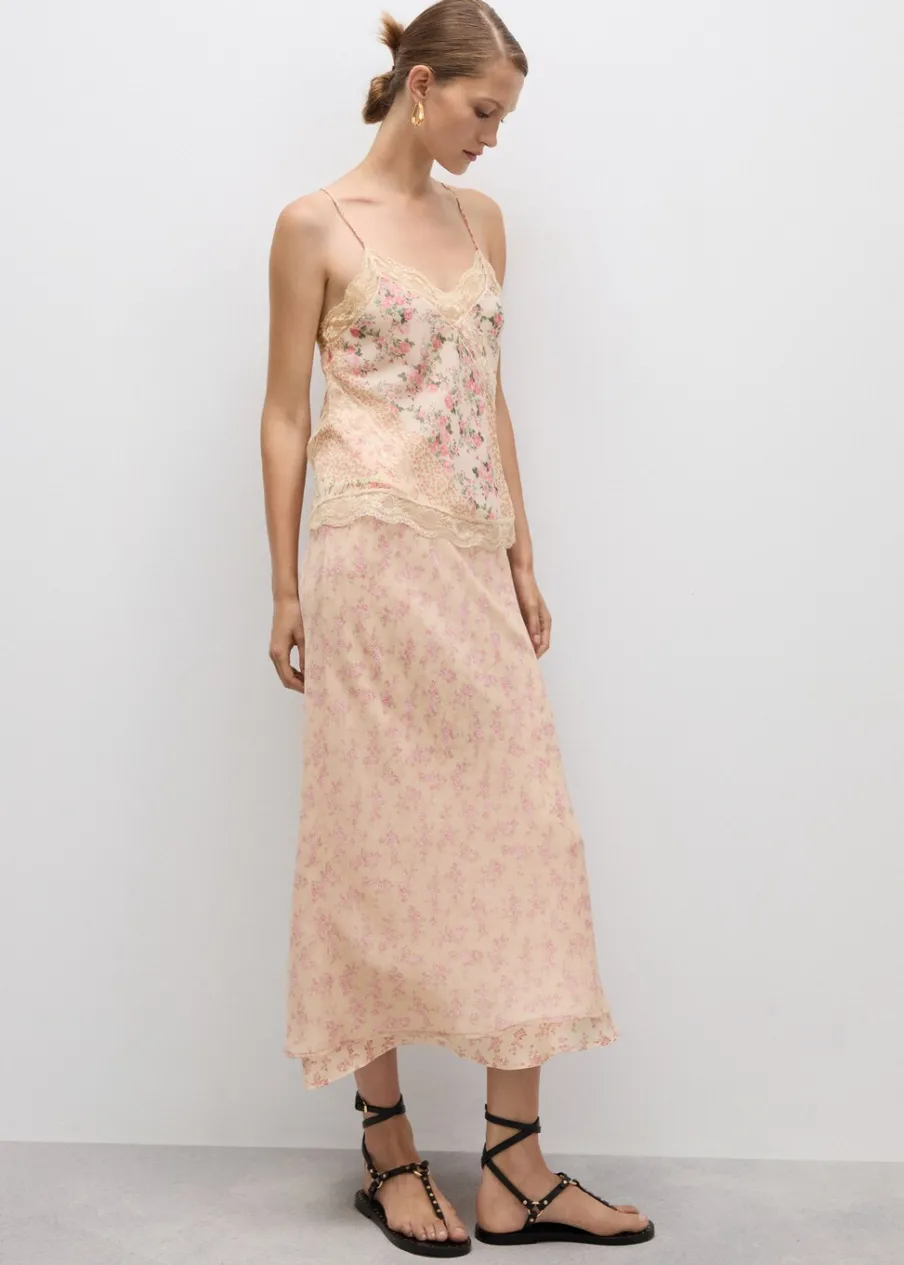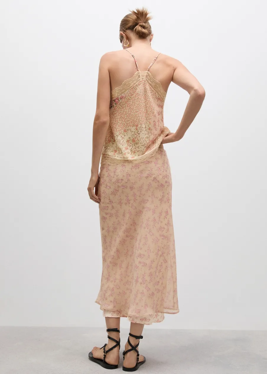 Lejąca tkanina. Model prosty. Model długi. Kwiatowy wzór. Elastyczny pas. Ozdobna kokardka. Wewnętrzna podszewka. Kolekcja wizytowa.