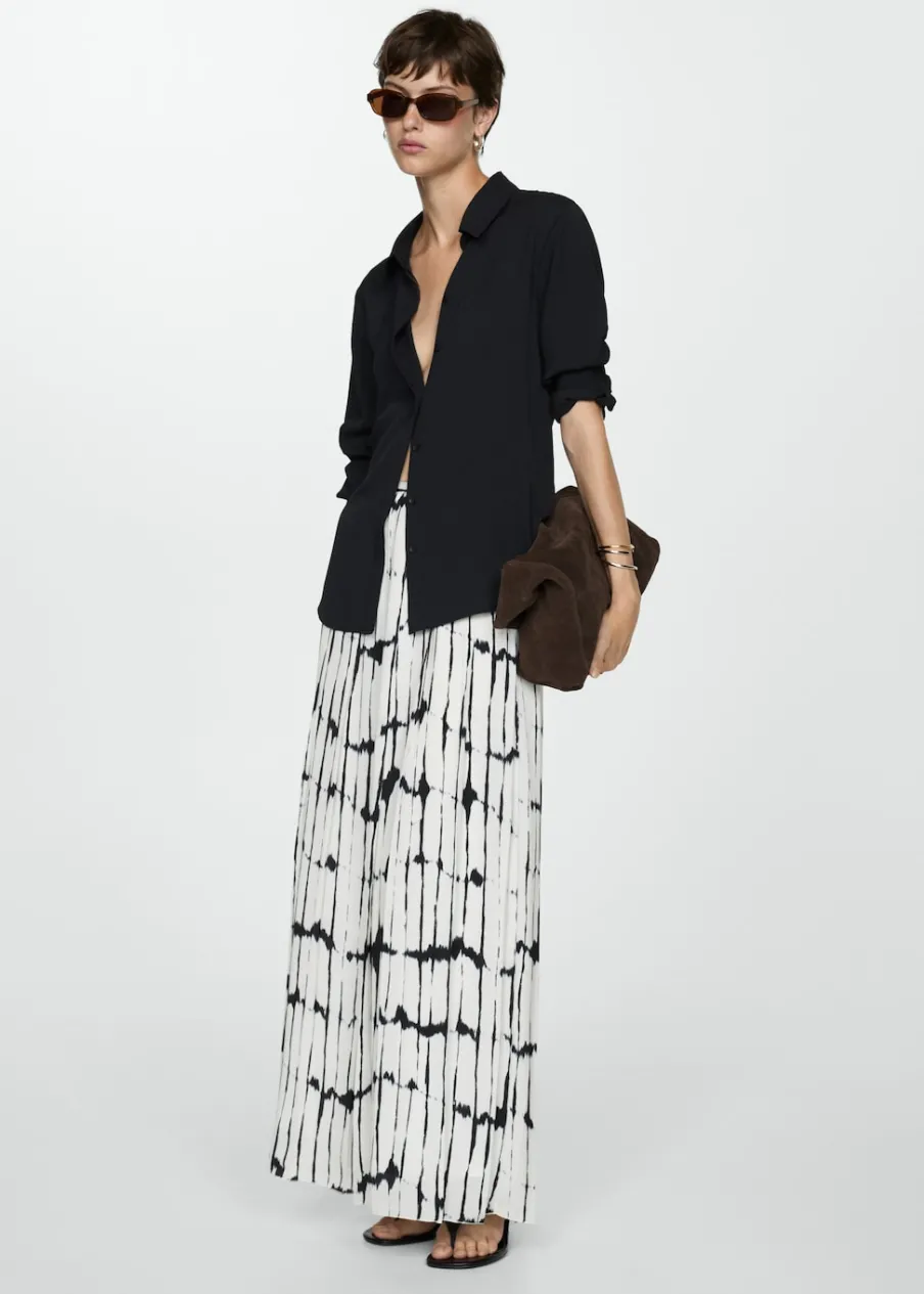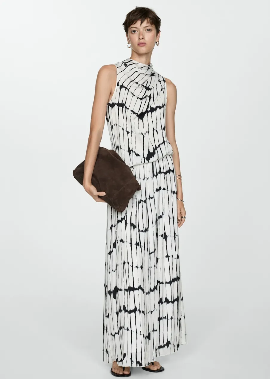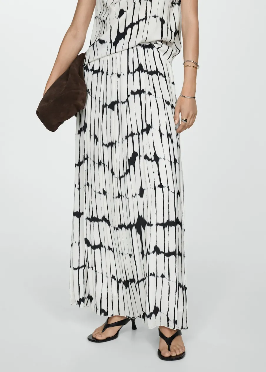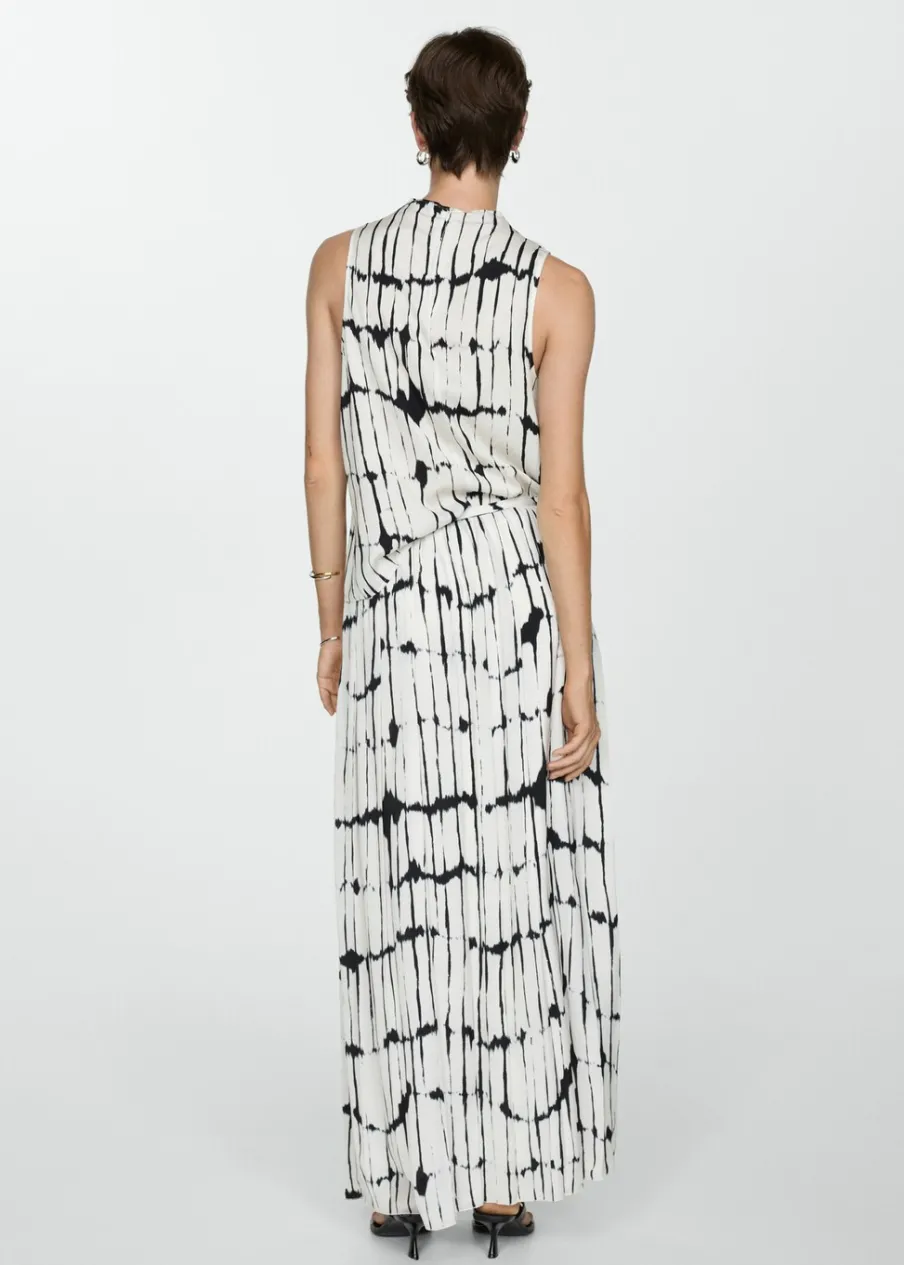 Lejąca tkanina. Model długi. Model prosty. Wzór w pasy. Kryte zapięcie na zamek z boku. Total look.