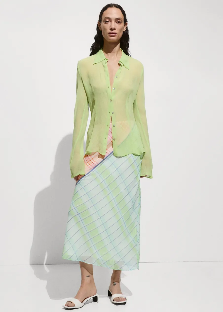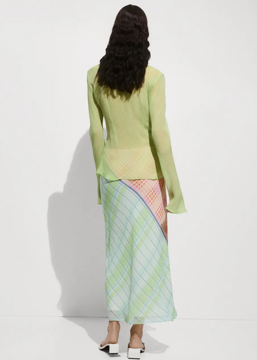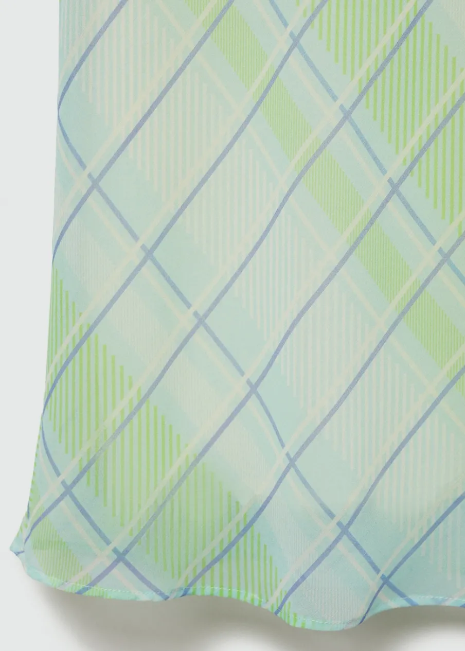 OpisLejąca tkanina. Model prosty. Model długi. Wzór w kratę. Elastyczny pas. Bez zapięcia. Wewnętrzna podszewka.