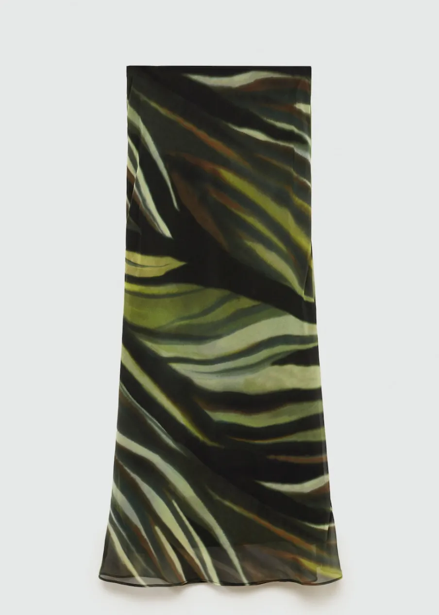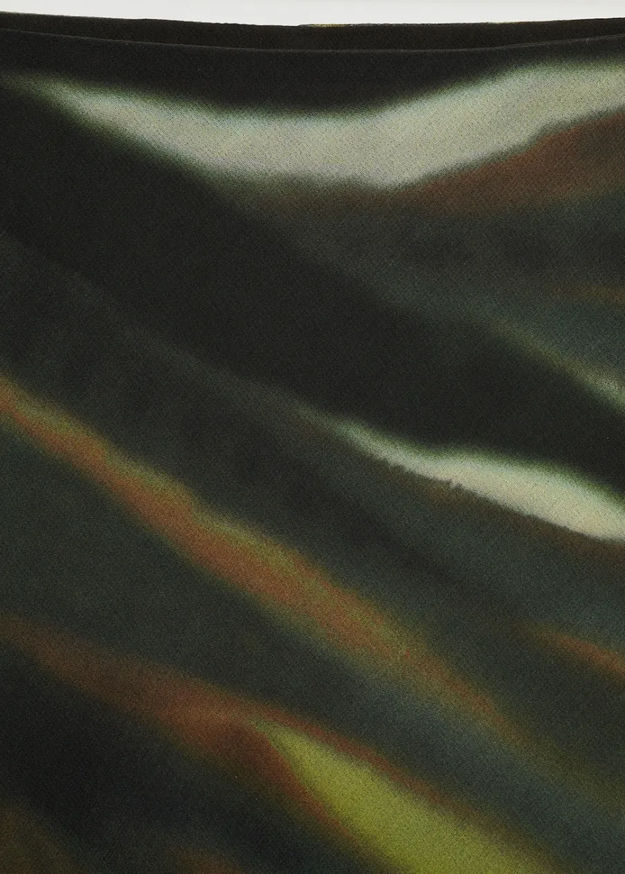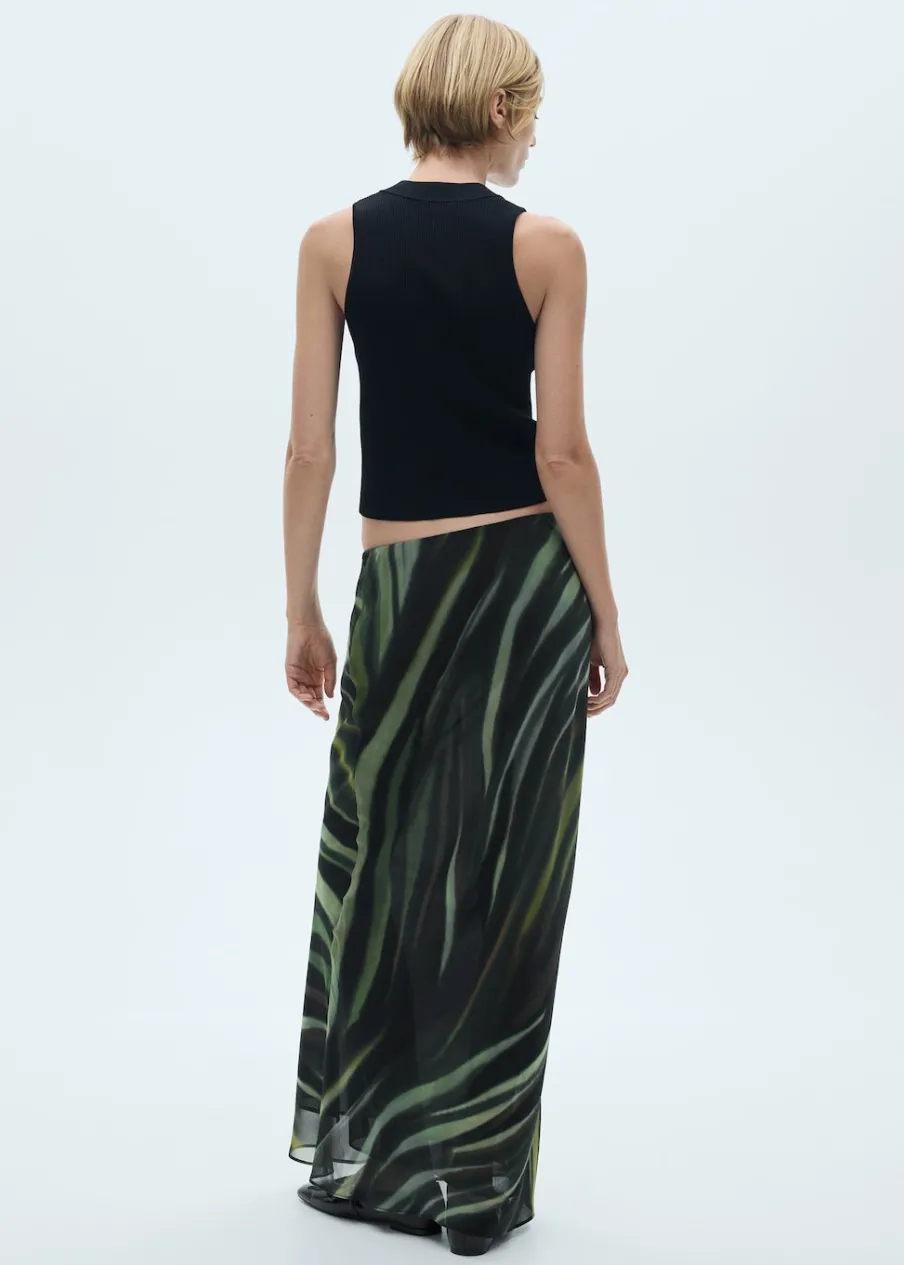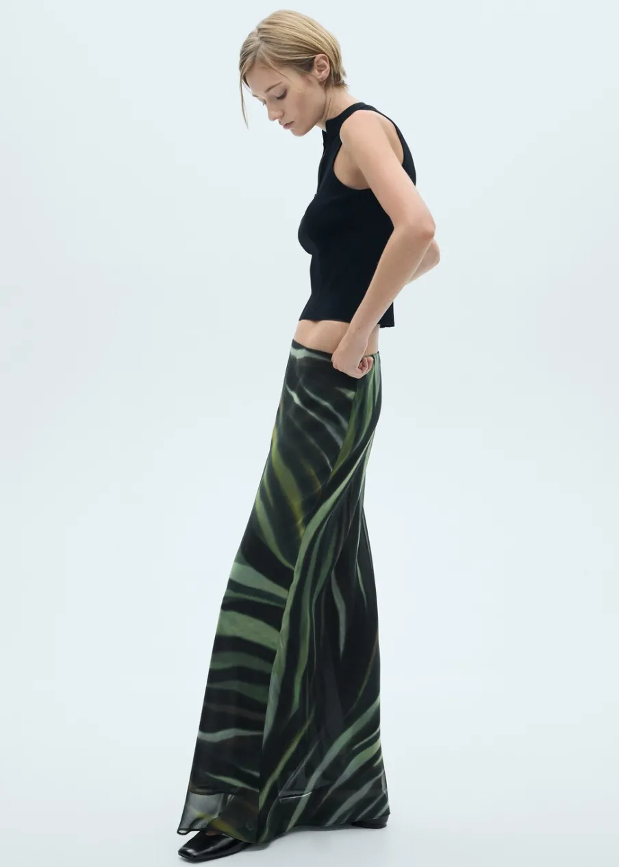 Lejąca tkanina. Niski stan. Model prosty. Model długi. Model wcięty. Nadruk. Elastyczny pas. Bez zapięcia. Modelka ma 181 cm wzrostu i nosi rozmiar S/36.