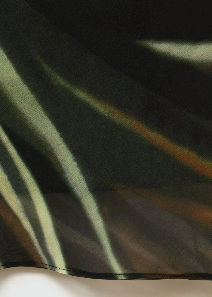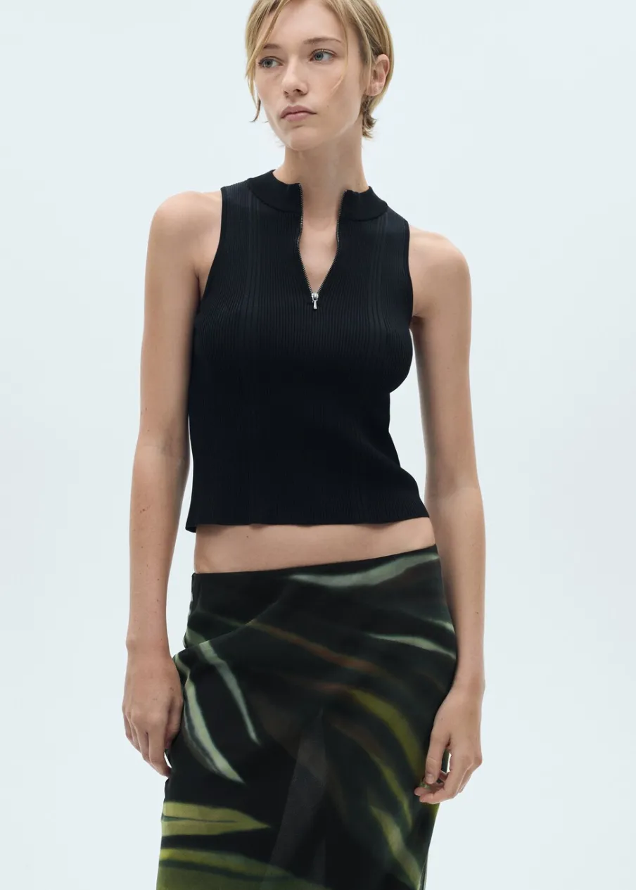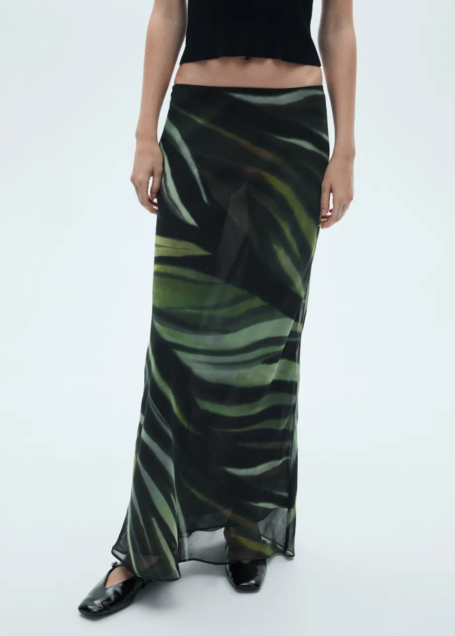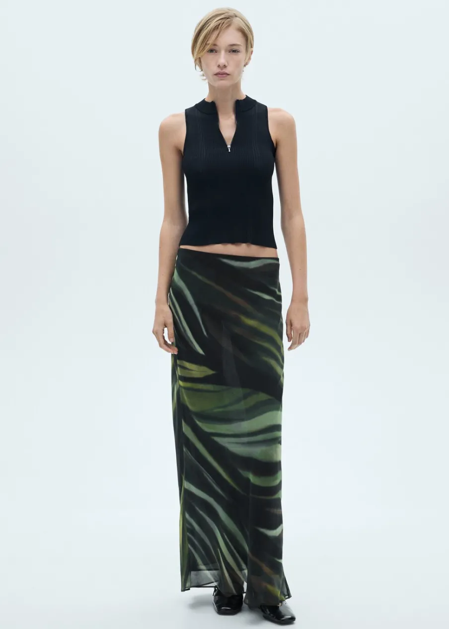 Lejąca tkanina. Niski stan. Model prosty. Model długi. Model wcięty. Nadruk. Elastyczny pas. Bez zapięcia. Modelka ma 181 cm wzrostu i nosi rozmiar S/36.