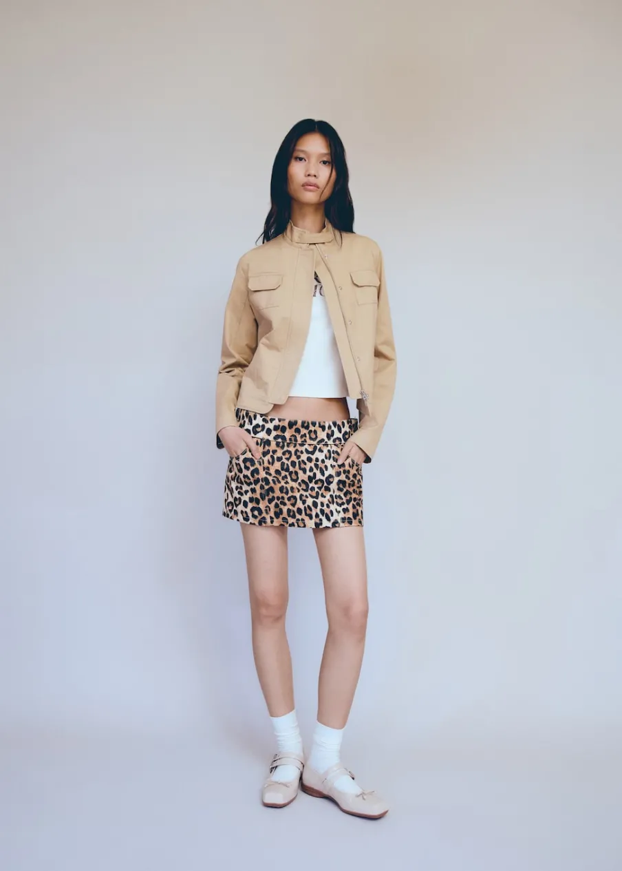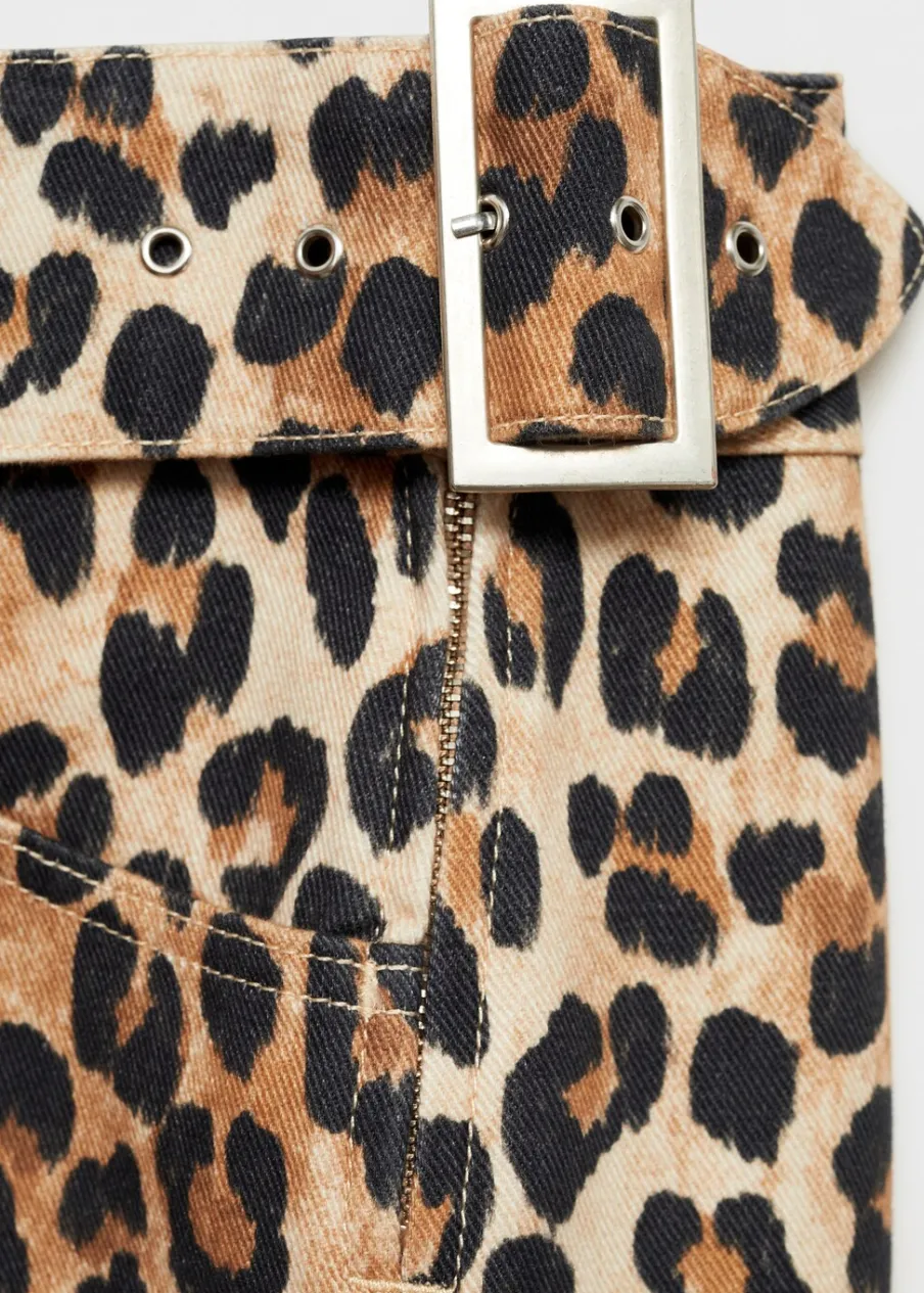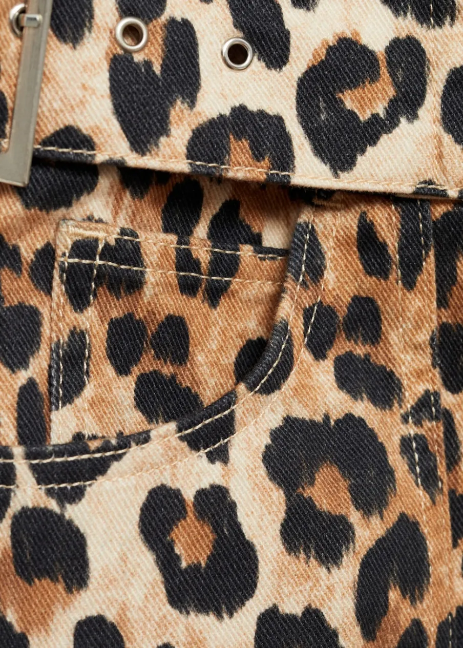 OpisJeansowy styl. Krótki krój. Niski stan. Wzór w lamparcie cętki. Szlufki. Pięć kieszeni. Odpinany pasek. Zapię…