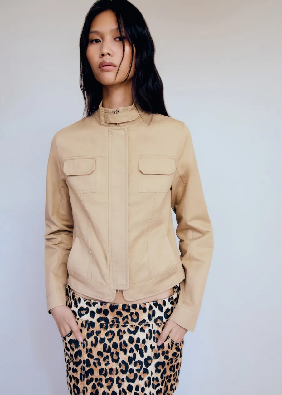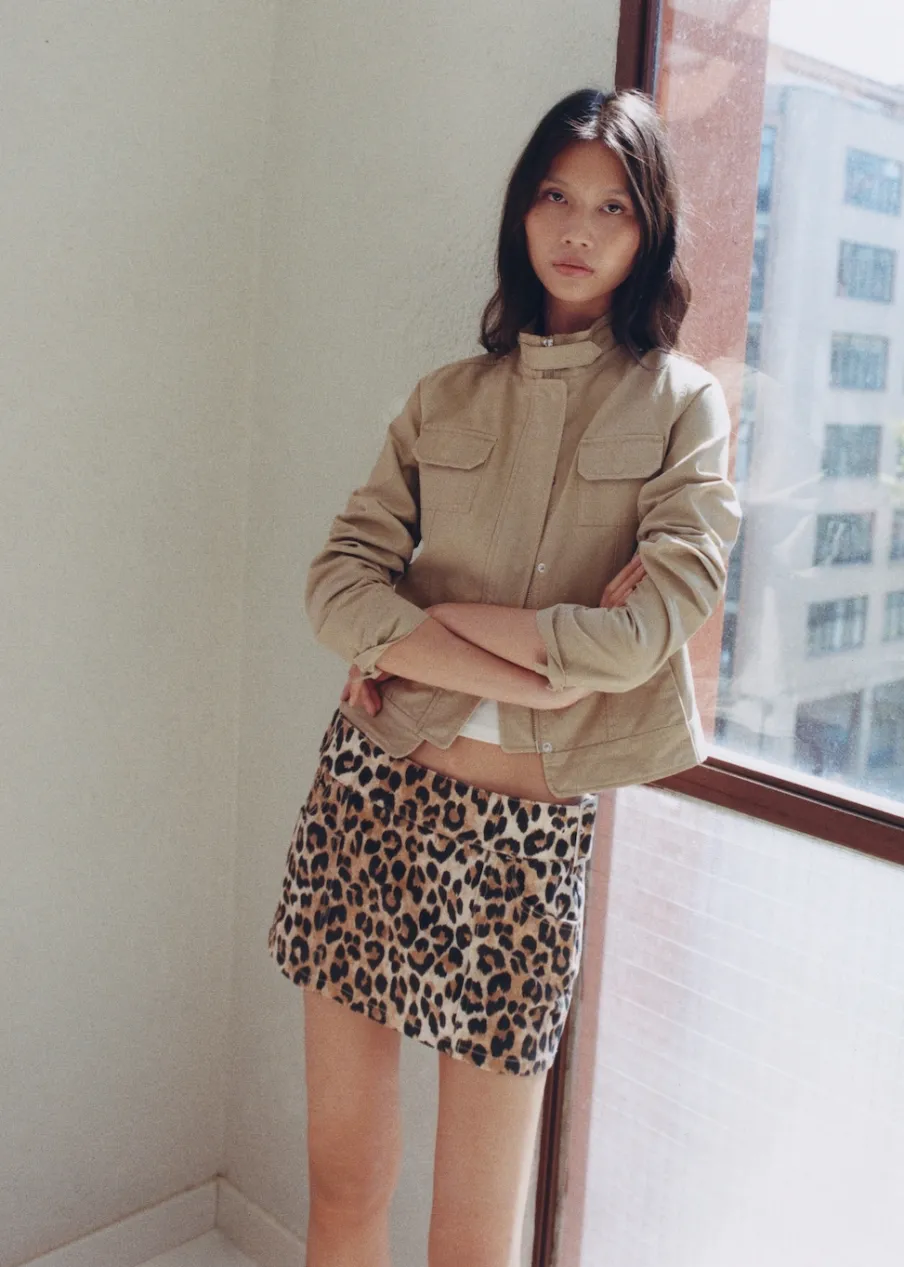 Jeansowy styl. Krótki krój. Niski stan. Wzór w lamparcie cętki. Szlufki. Pięć kieszeni. Odpinany pasek. Zapięcie na suwak i guzik. Modelka ma 178 cm wzrostu i nosi rozmiar S/36.