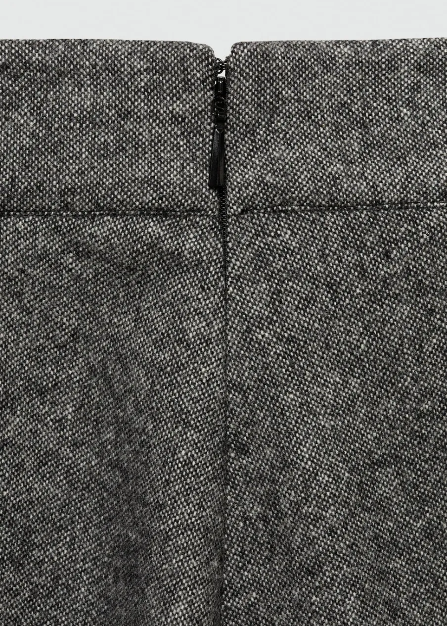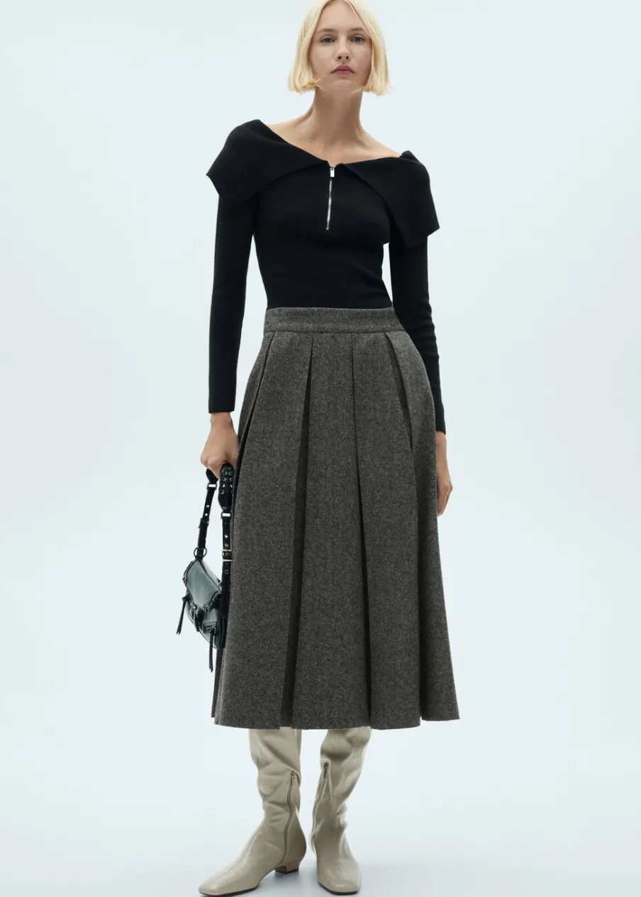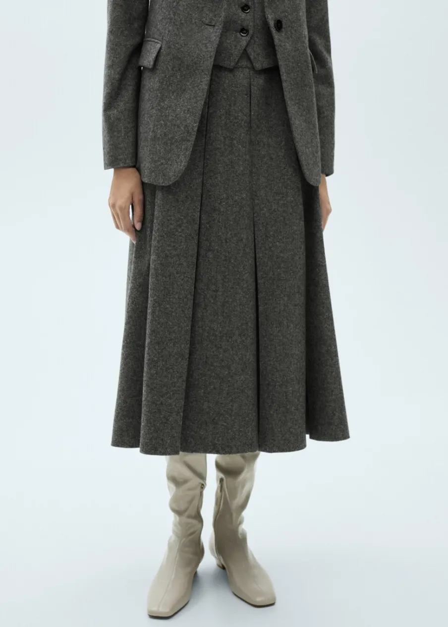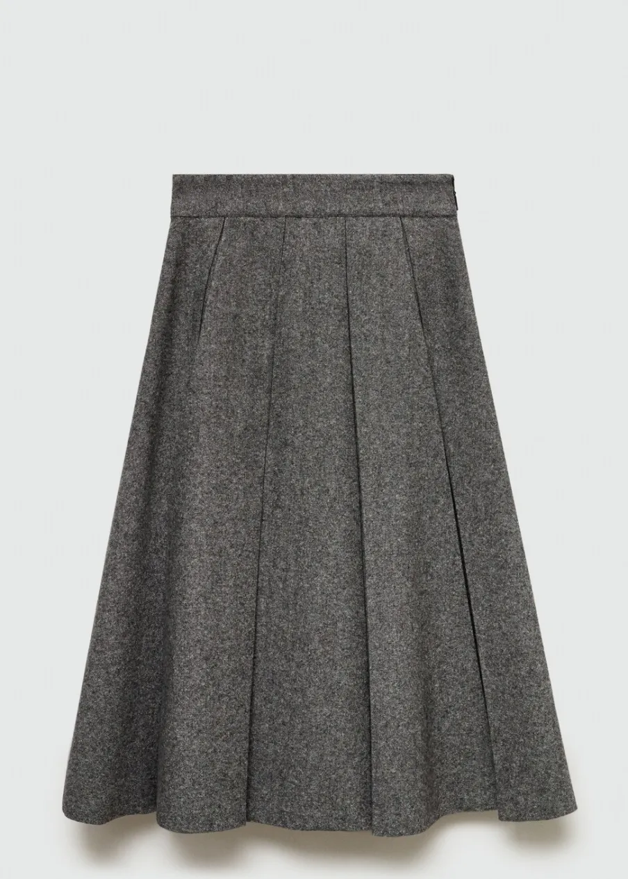 Tkanina mieszanka wełny. Melanżowa tkanina. Fason z zakładkami. Model evasé. Krój do kolan. Średni stan. Zapięcie z tyłu na kryty suwak. Modelka ma 179 cm wzrostu i nosi rozmiar S/36.