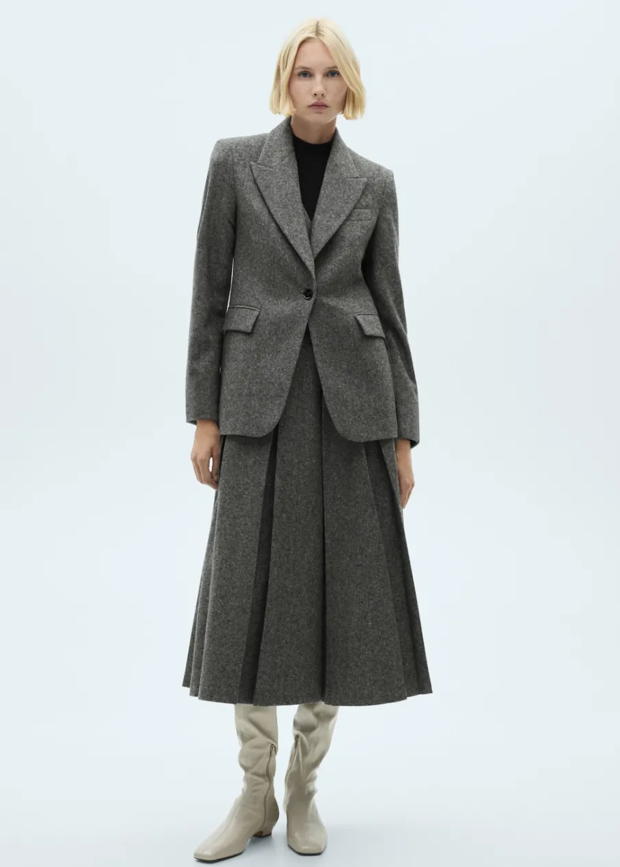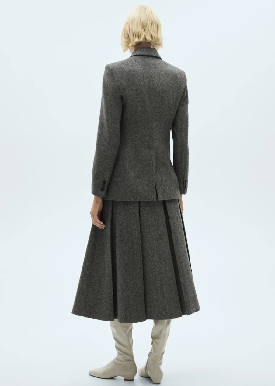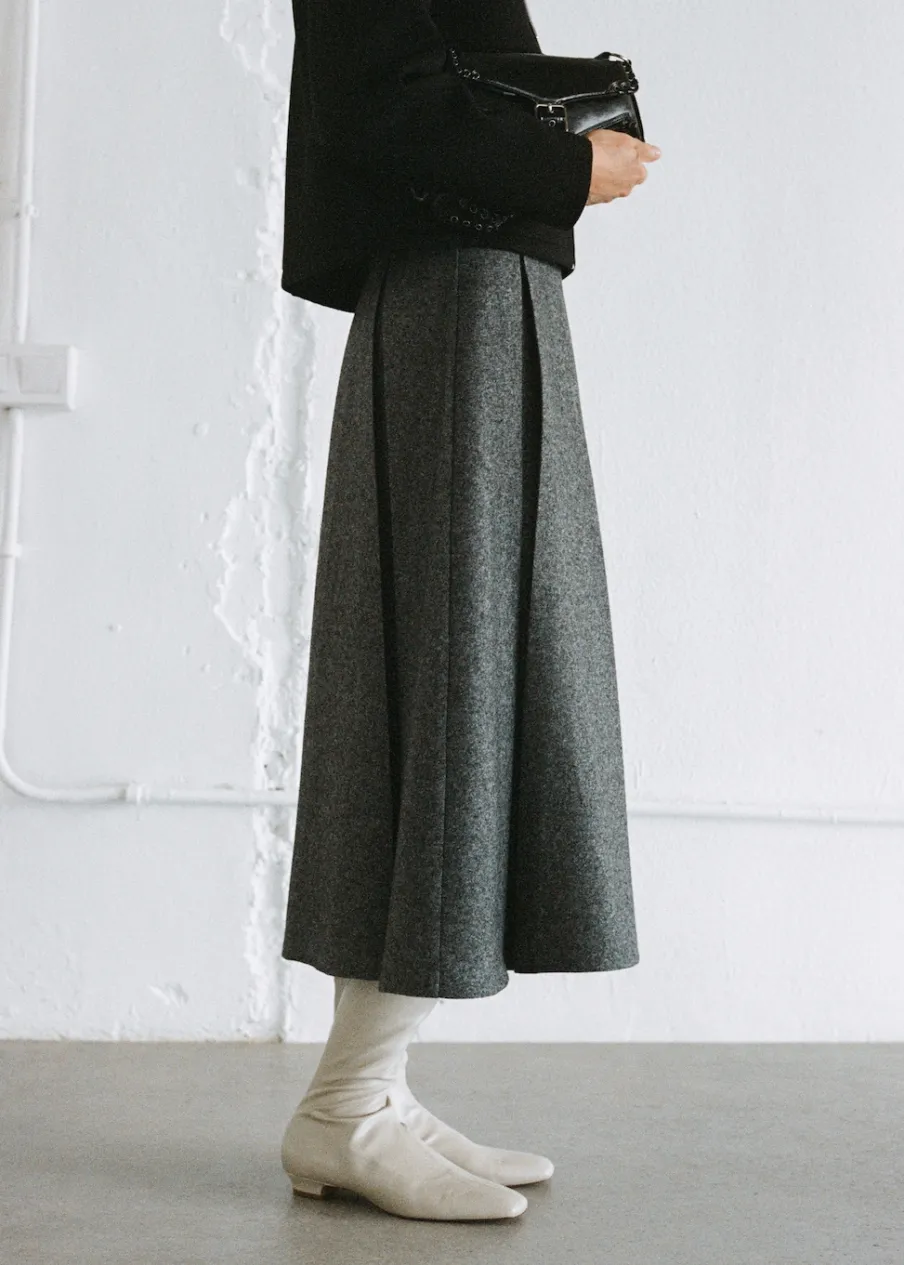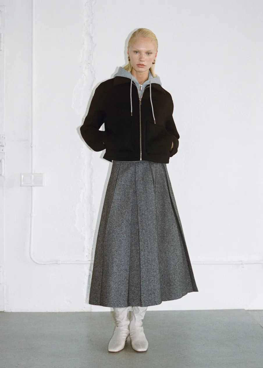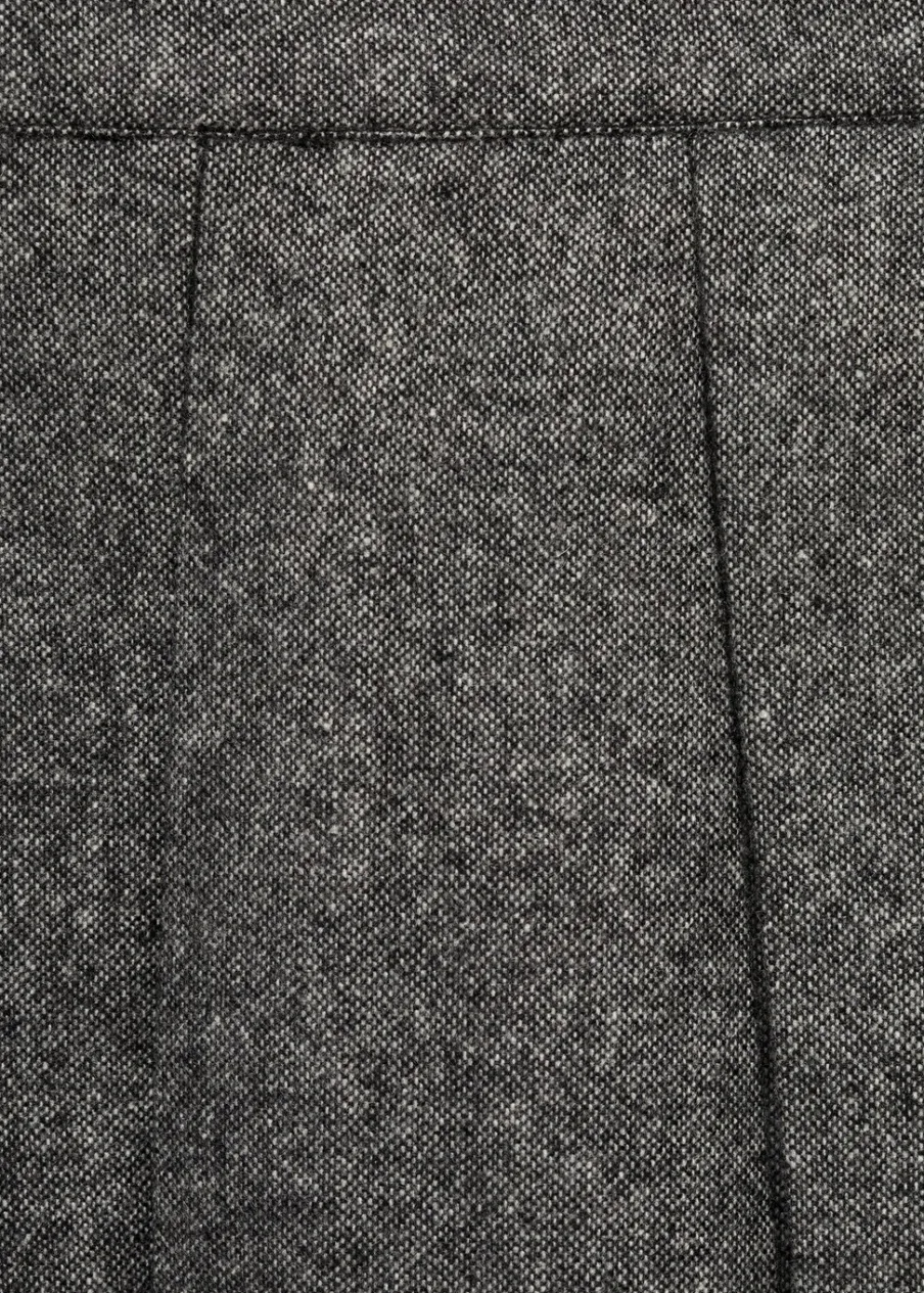 Tkanina mieszanka wełny. Melanżowa tkanina. Fason z zakładkami. Model evasé. Krój do kolan. Średni stan. Zapięcie z tyłu na kryty suwak. Modelka ma 179 cm wzrostu i nosi rozmiar S/36.