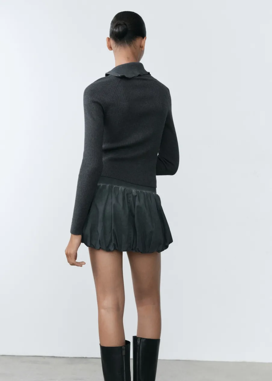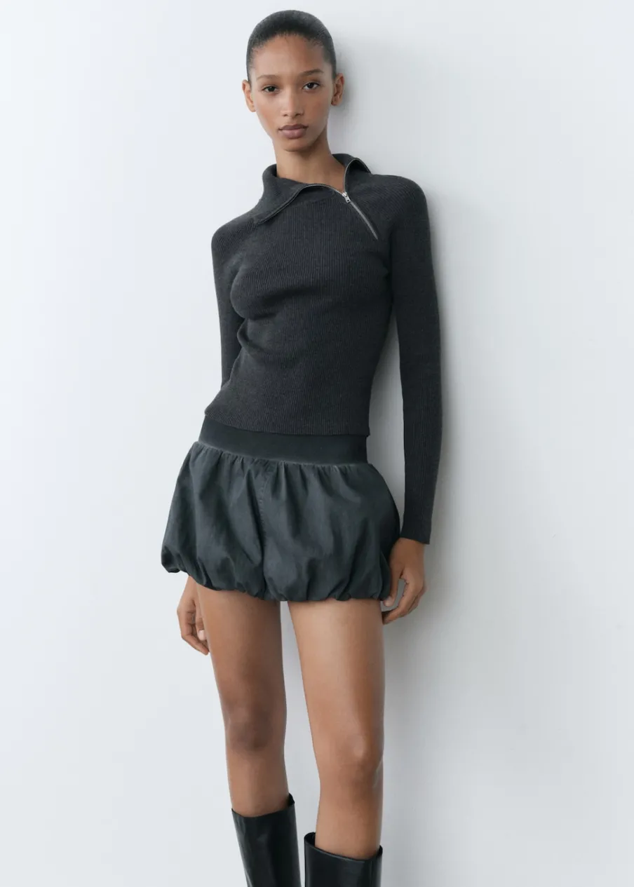 Niski stan. Model evasé. Krótki krój. Bez zapięcia. Elastyczny pas. Fason bombka. Modelka ma 178 cm wzrostu i nosi rozmiar S/36.