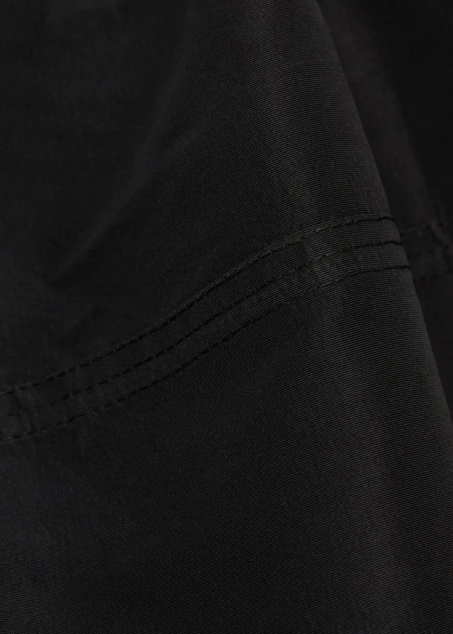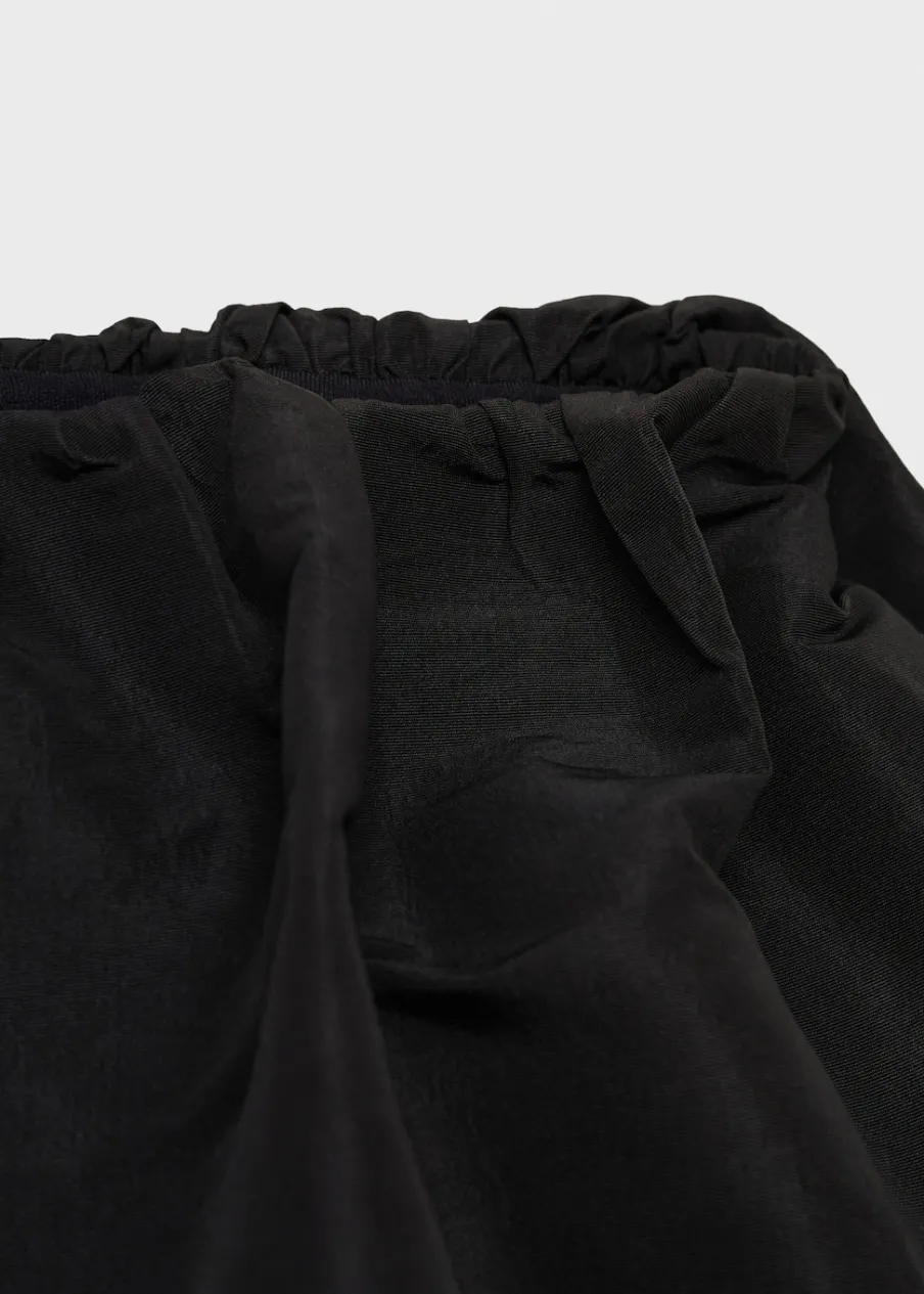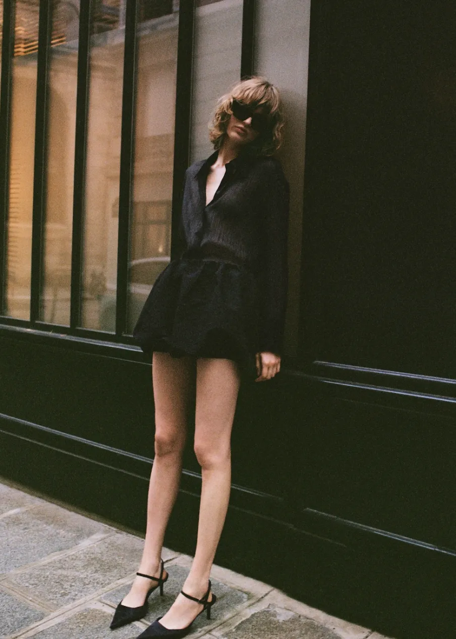 Rövid szabás, evasé modell, alacsony derékmagasság, gumírozott derék, zár nélkül, a modell 1,77 cm magas és S/36 méretet visel, parti és ünnepi kollekció.