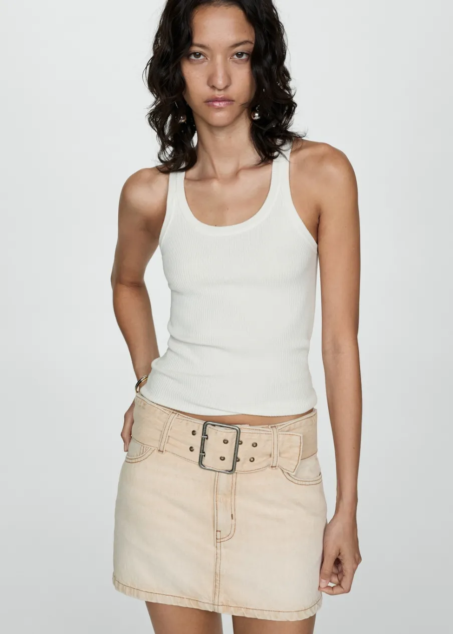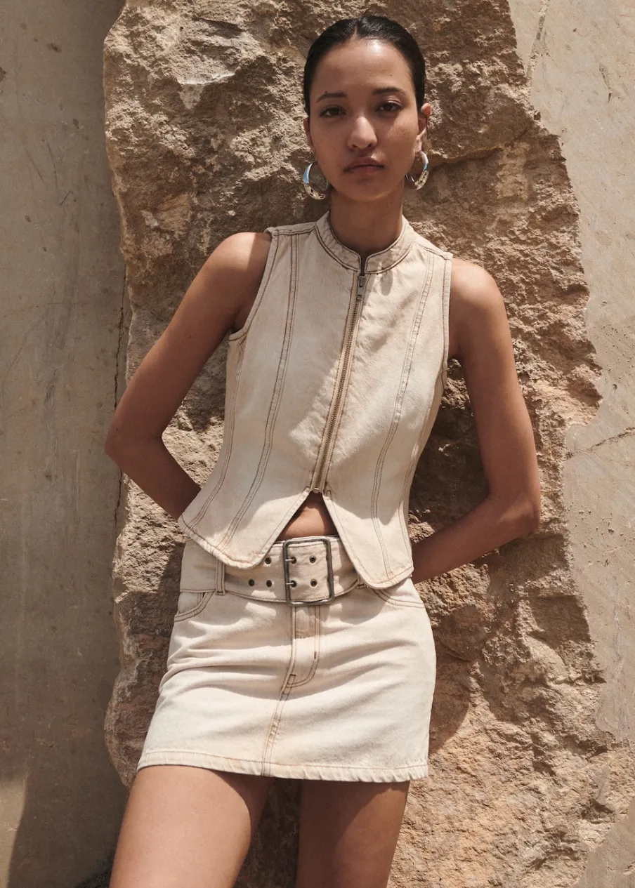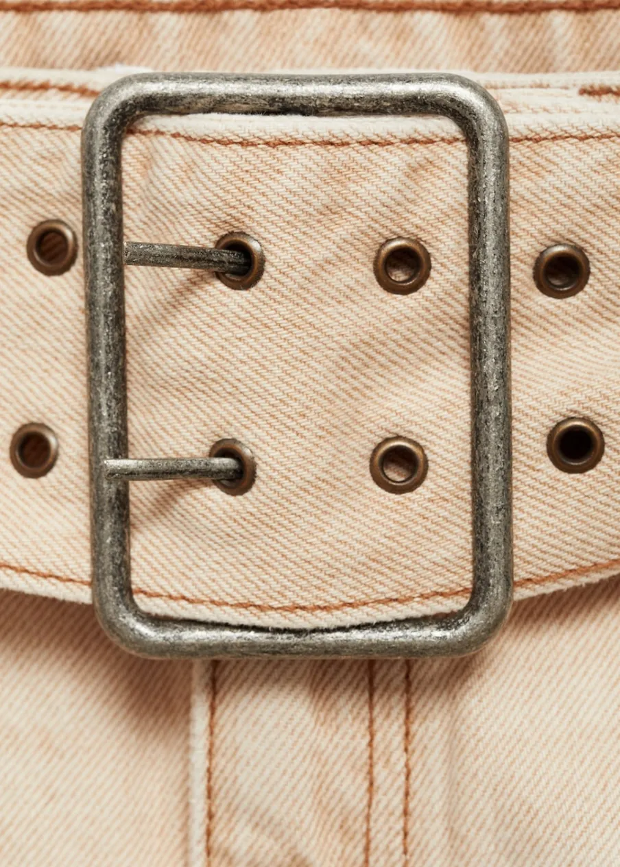 Tkanina bawełniana w dżinsowym stylu. Niski stan. Model prosty. Krótki krój. Pięć kieszeni. Szlufki. Zapięcie na suwak i guzik. Dekoracyjny pasek. Total look.