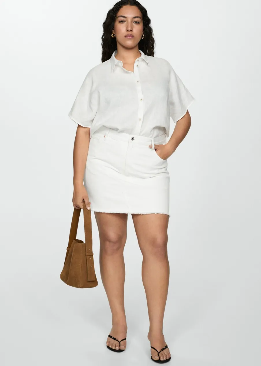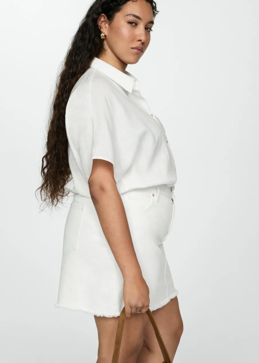 Tkanina bawełniana w dżinsowym stylu. Podwyższony stan. Krótki krój. Model prosty. Dwie kieszenie z przodu. Kieszeń na bilon. Dwie kieszenie nakładane z tyłu. Dostępne w Plus Size. Zapięcie na zamek i guzik z przodu.