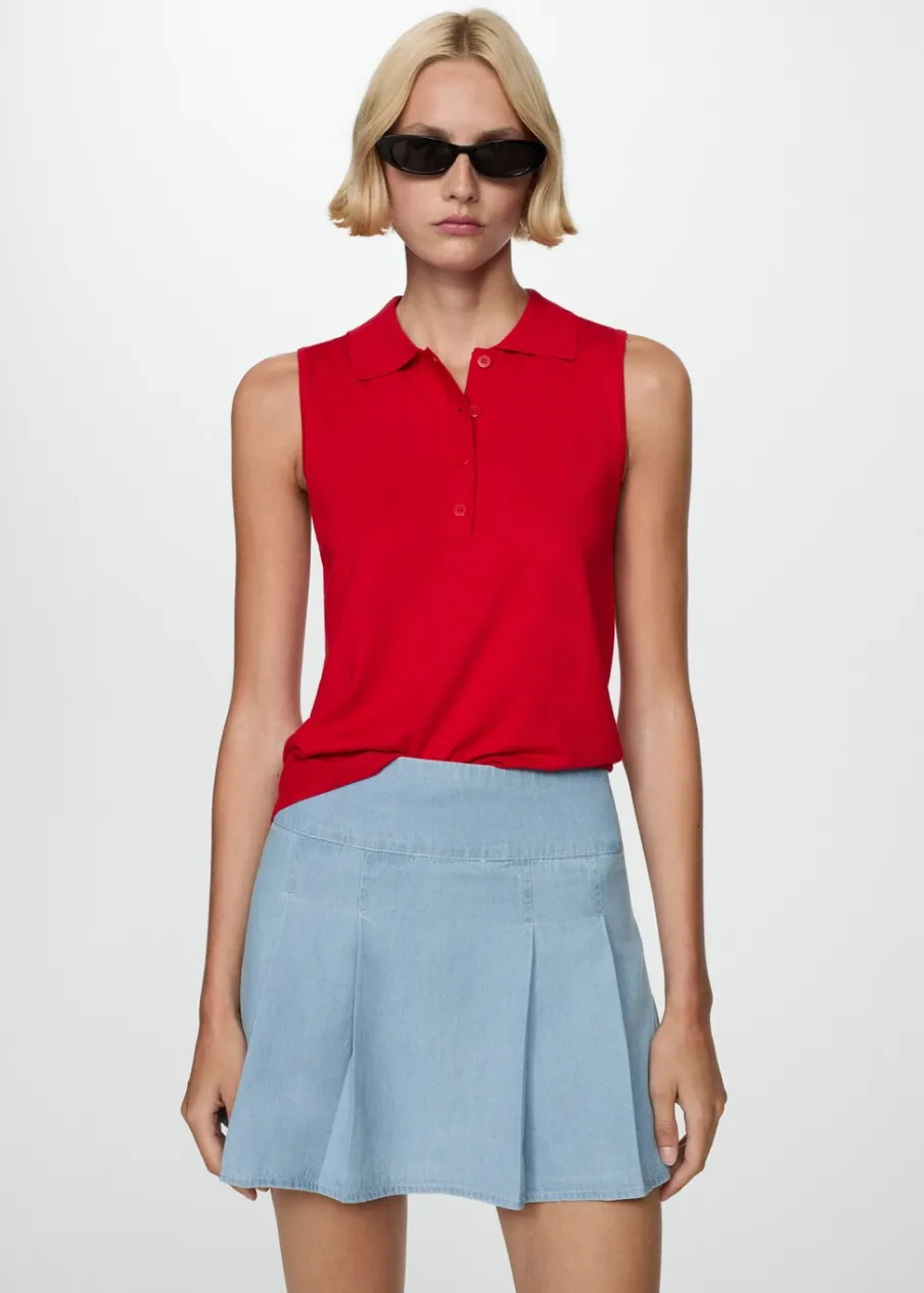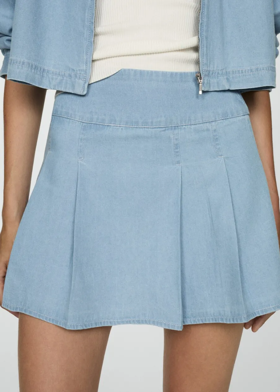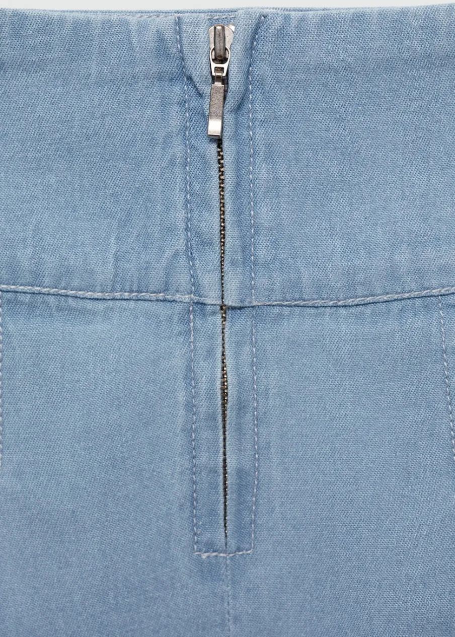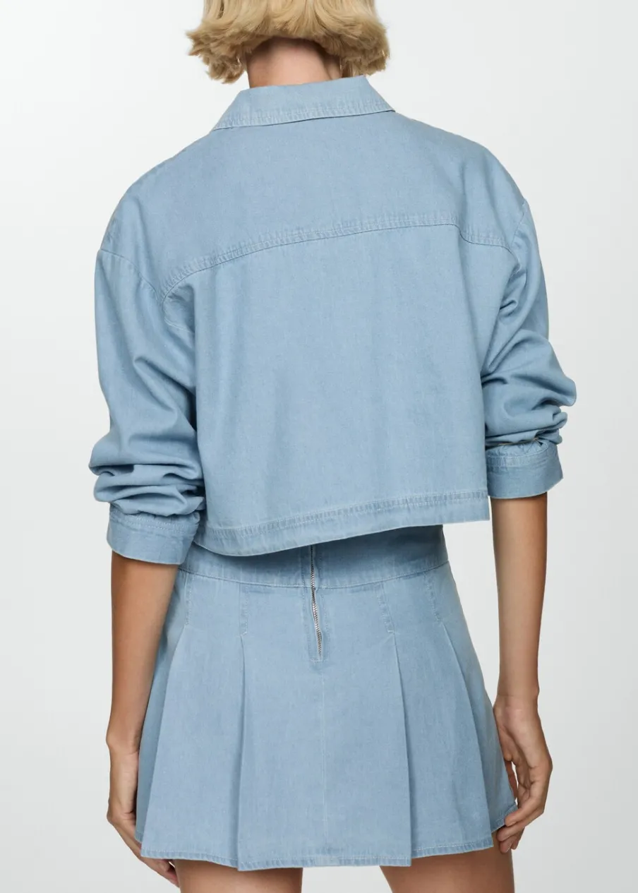 Tkanina bawełniana w dżinsowym stylu. Krótki krój. Model prosty. Fason z zakładkami. Zapięcie z tyłu na suwak.