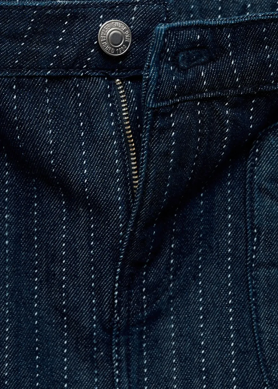 Tkanina bawełniana w dżinsowym stylu. Krótki krój. Deseń w prążki. Niski stan. Dwie kieszenie zapinane na suwak. Ozdobne szwy. Zapięcie na zamek i guzik z przodu. Model wcięty.