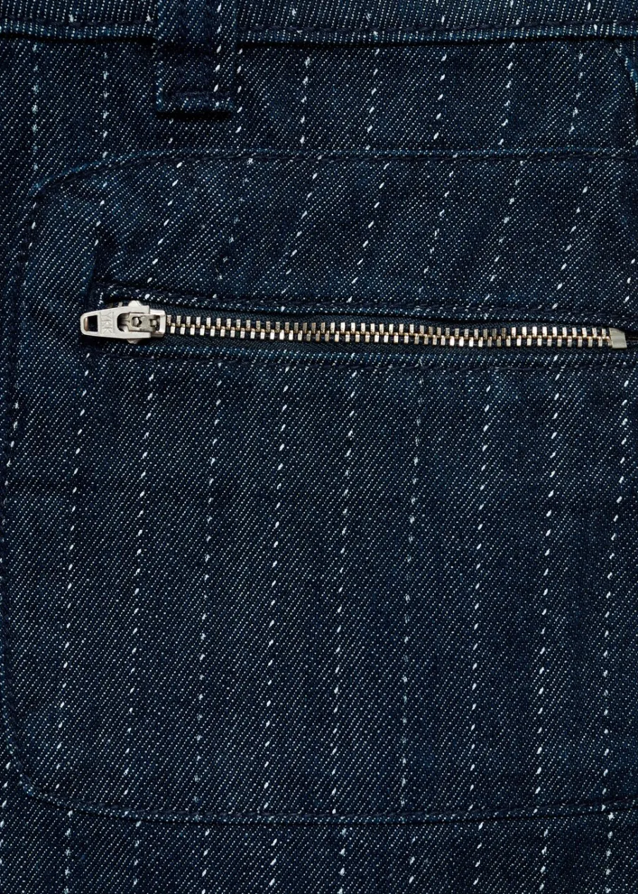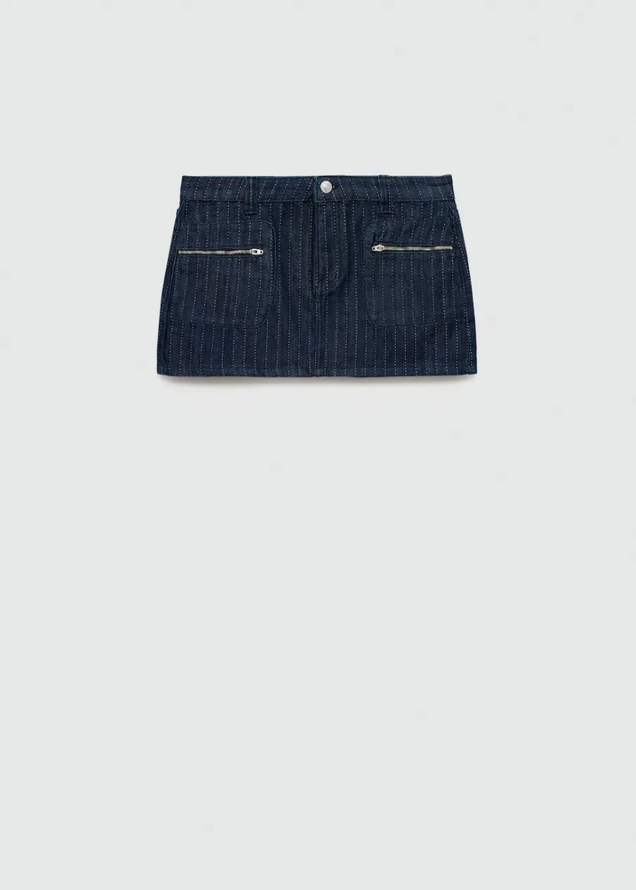OpisTkanina bawełniana w dżinsowym stylu. Krótki krój. Deseń w prążki. Niski stan. Dwie kieszenie zapinane na suw…