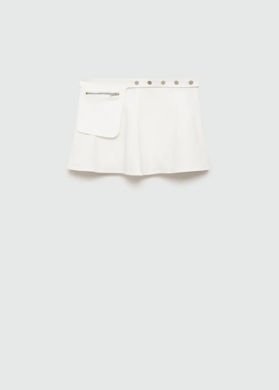 Rozmiar mini. Krótki krój. Model prosty. Ozdobna kieszeń z przodu. Boczne zapięcie na suwak. Zapięcie na zatrzaski z przodu. Odpinany pasek.