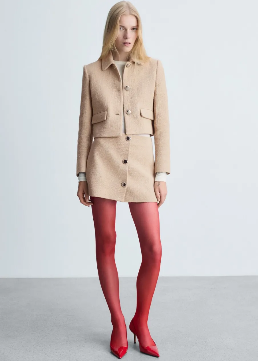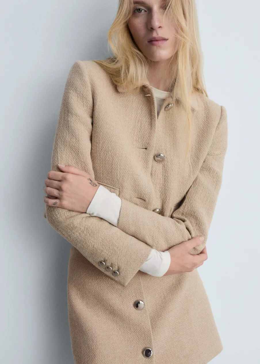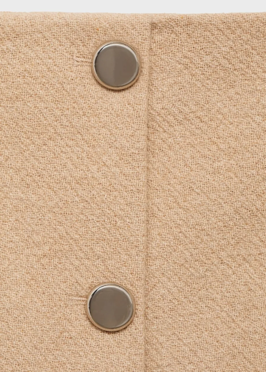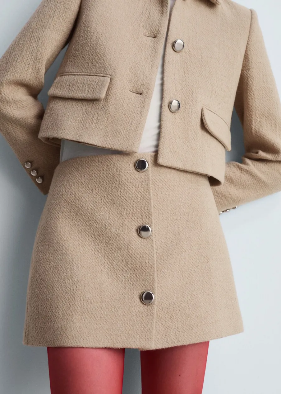 Bekevert pamut anyag, oldalt záródik, könnyű anyag, csak bélésanyag, rövid szabás, egyenes szabású modell, hátul rejtett cipzárral, dekoratív gombok, total look, a modell 1,78 cm magas és S/36 méretet visel.