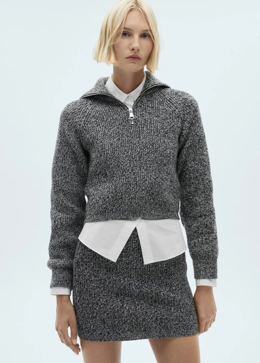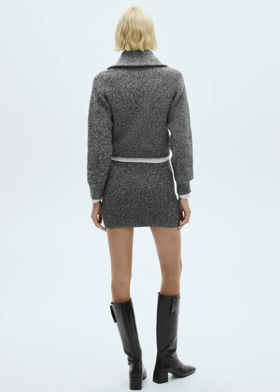 Średni stan. Model prosty. Krótki krój. Elastyczny pas. Bez zapięcia. Wyłącznie online. Total look. Modelka ma 179 cm wzrostu i nosi rozmiar S/36. Dzianinowa tkanina. Melanżowa tkanina.