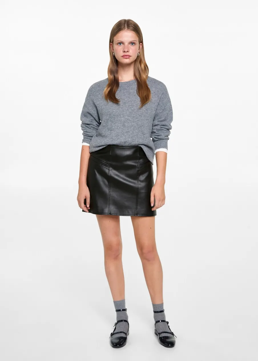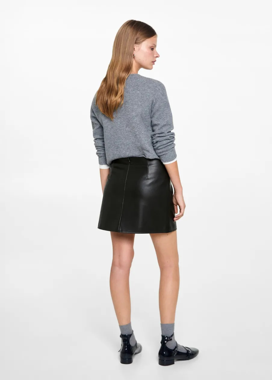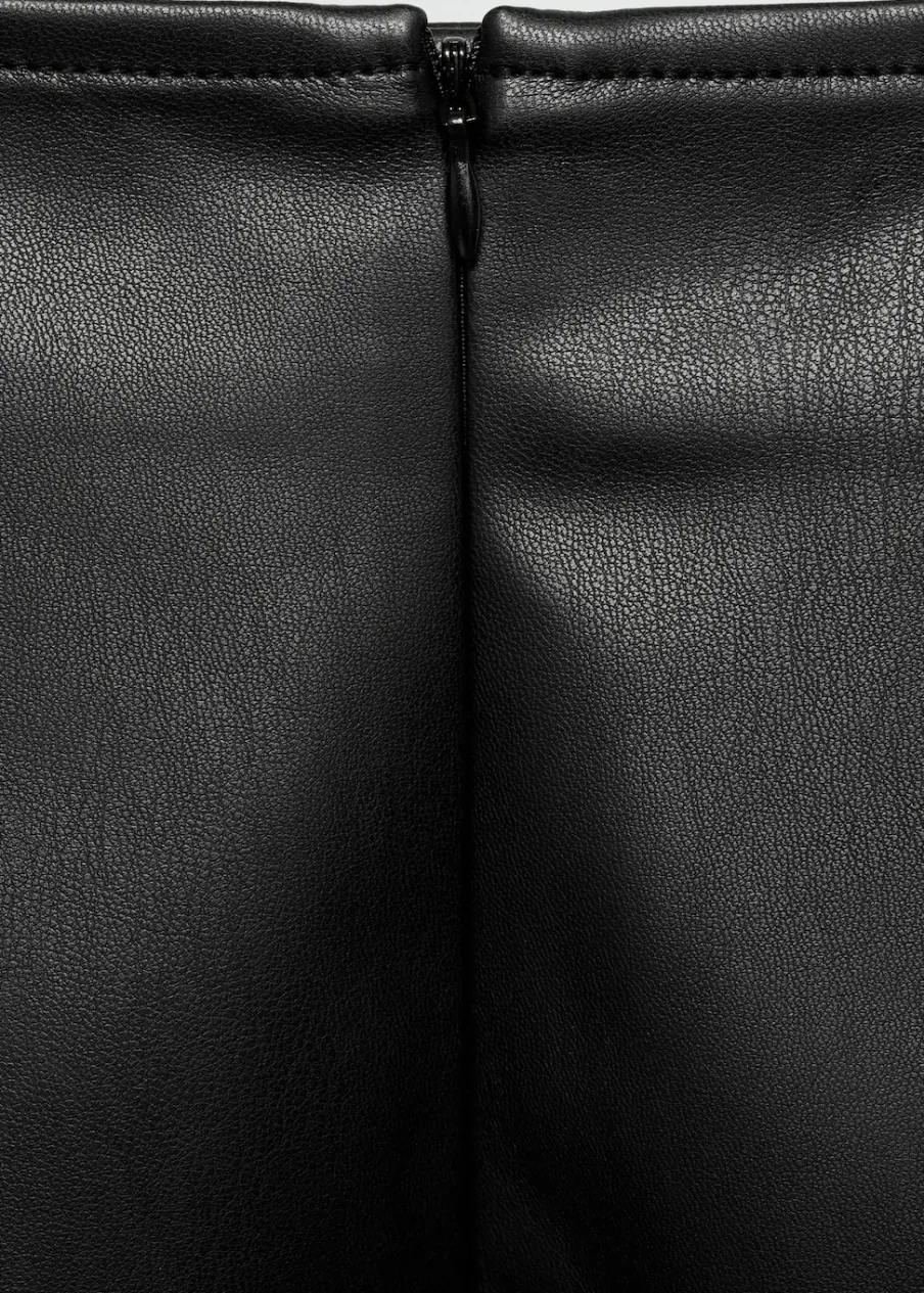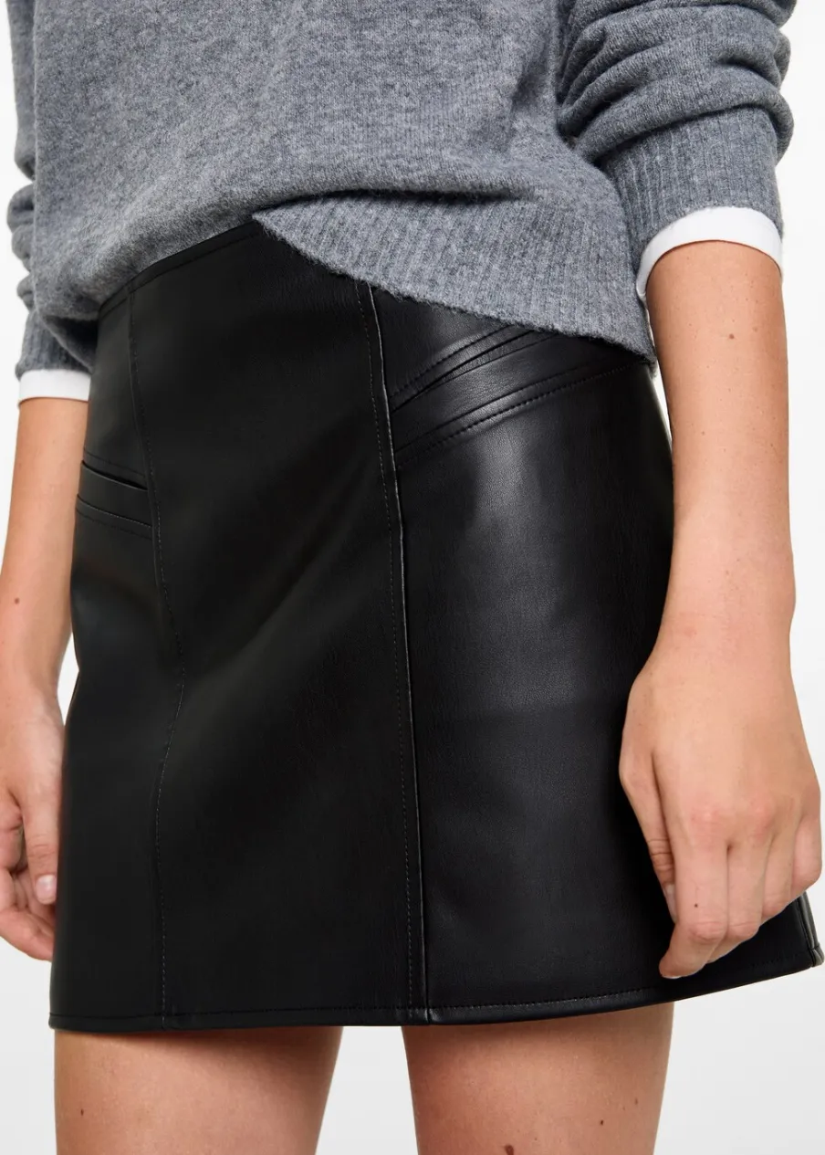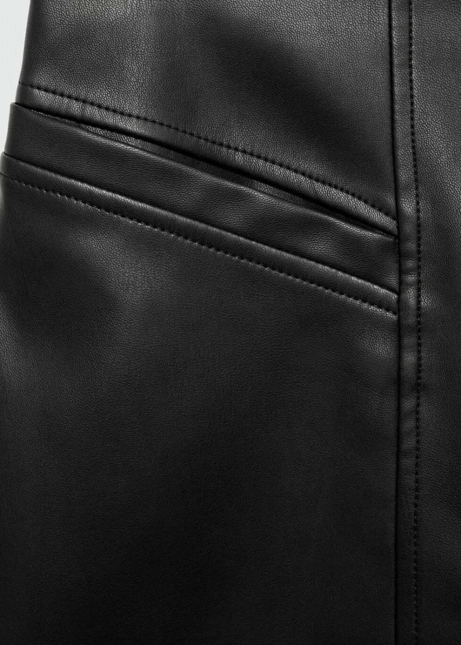 Kolekcja wieczorowa i imprezowa. Efekt skóry. Model prosty. Krótki krój. Dwie kieszenie z patką. Zapięcie z tyłu na suwak.