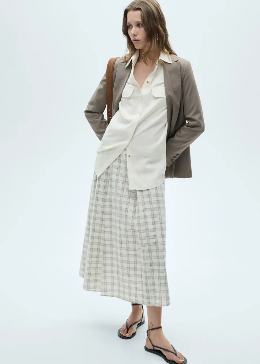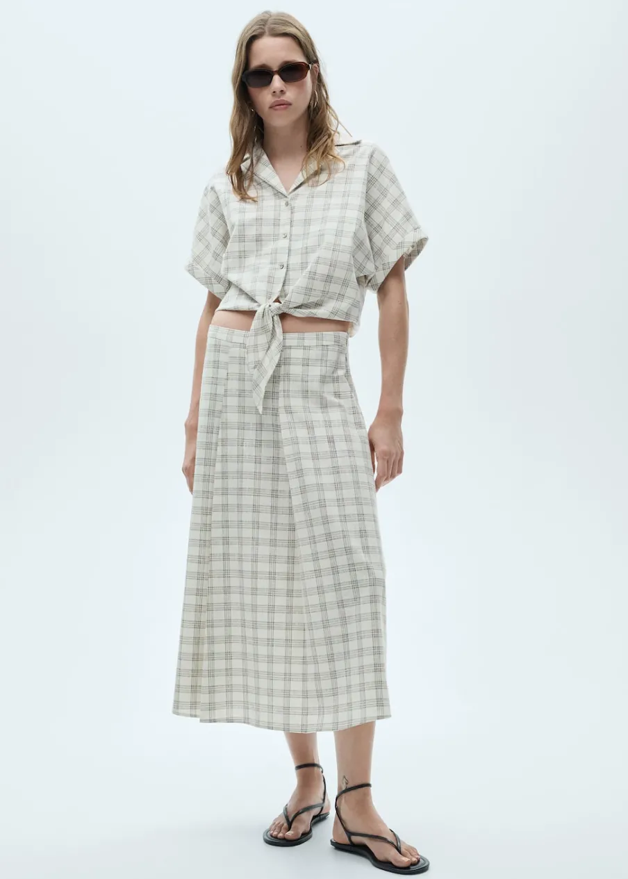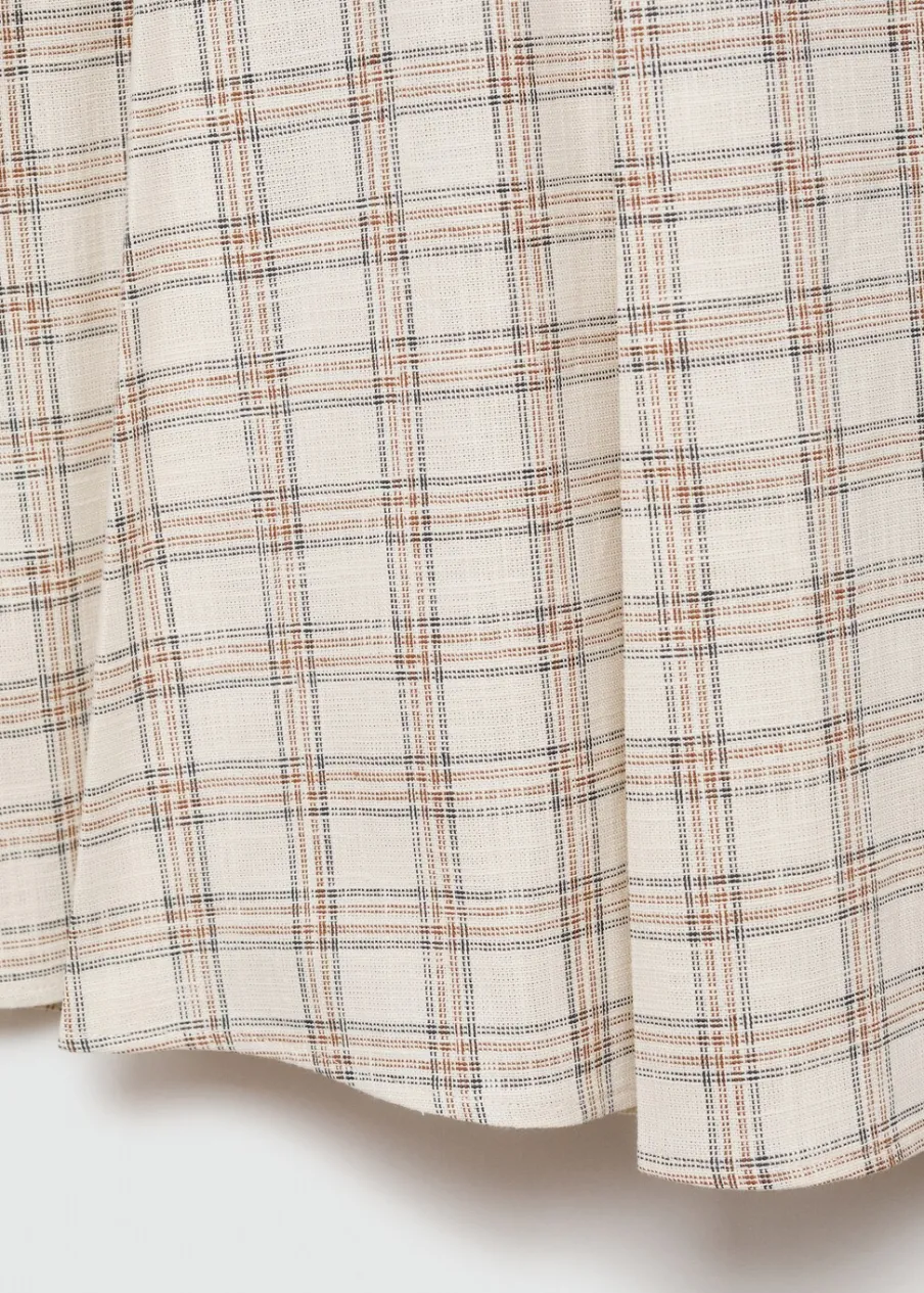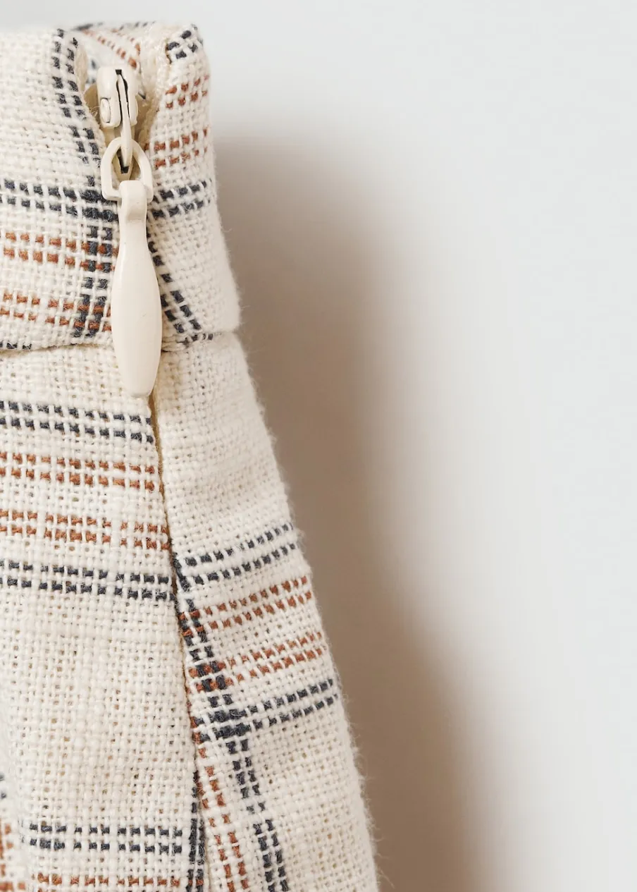 Cienka tkanina. Model evasé. Deseń crop. Wzór w kratę. Podwyższony stan. Ozdobne szwy. Boczne zapięcie na suwak. Bez podszewki. Modelka ma 175 cm wzrostu i nosi rozmiar S/36.