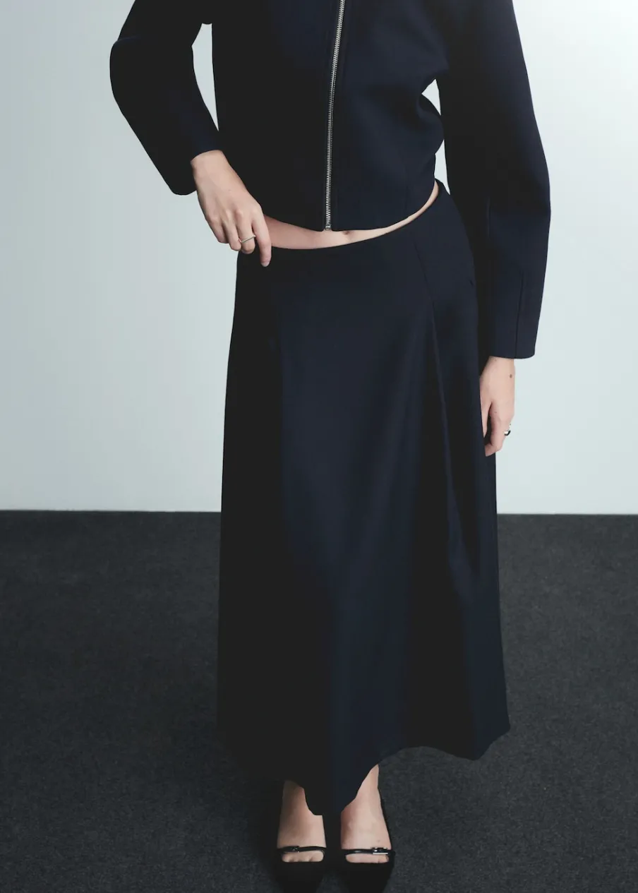 OpisLejąca tkanina. Model długi. Model evasé. Dwie kieszenie boczne. Zapięcie na suwak i haftkę. Detal z zakładkam…