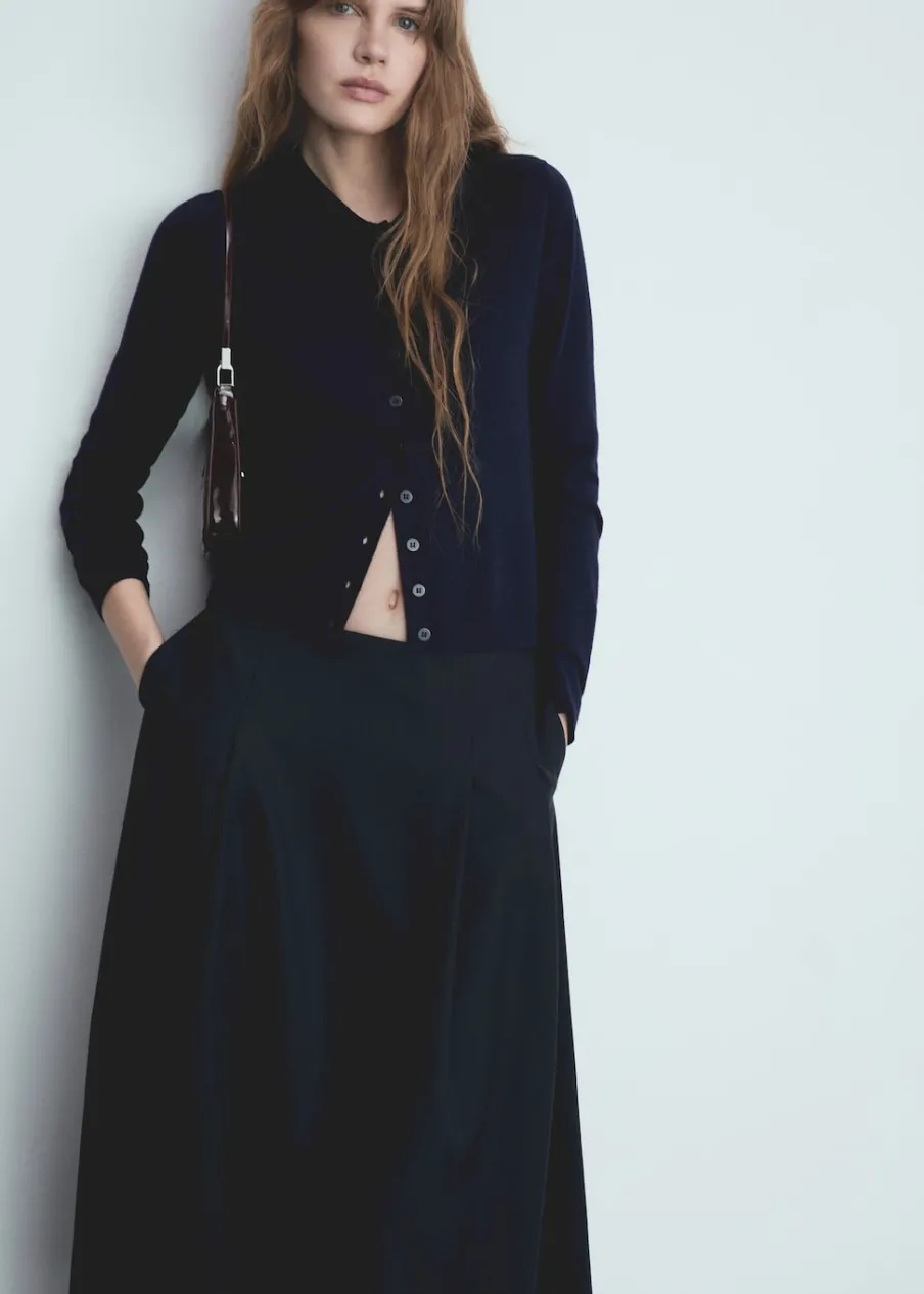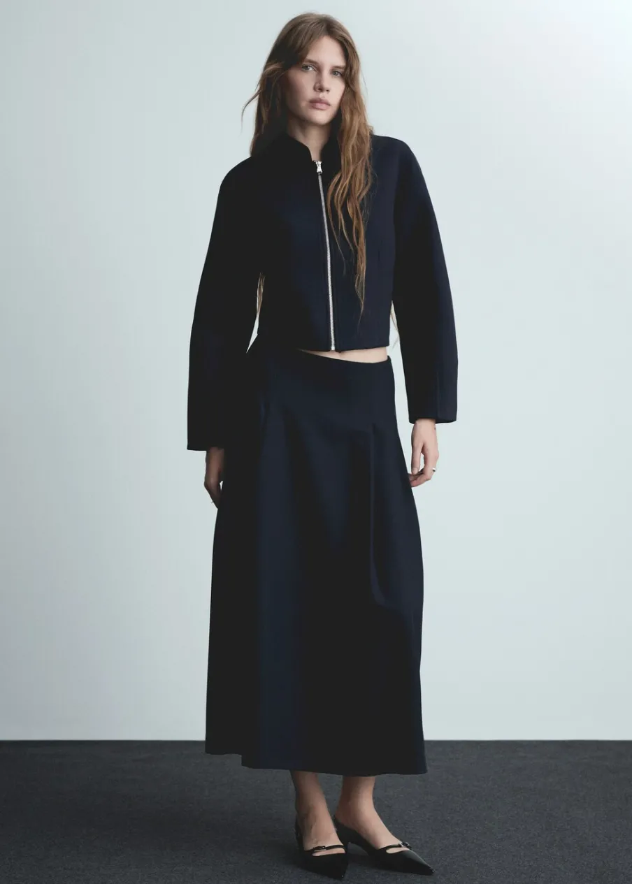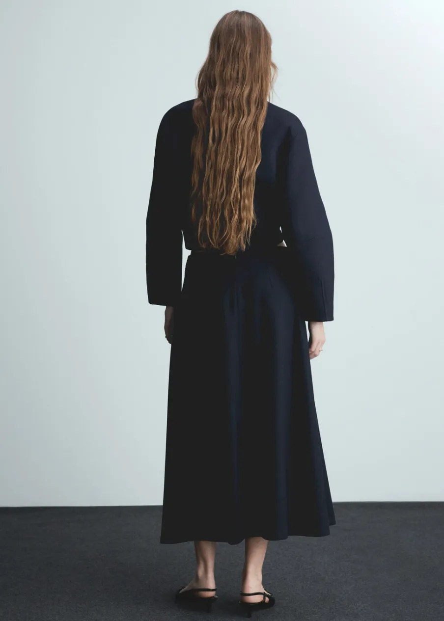 Lejąca tkanina. Model długi. Model evasé. Dwie kieszenie boczne. Zapięcie na suwak i haftkę. Detal z zakładkami. Total look. Modelka ma 178 cm wzrostu i nosi rozmiar S/36.