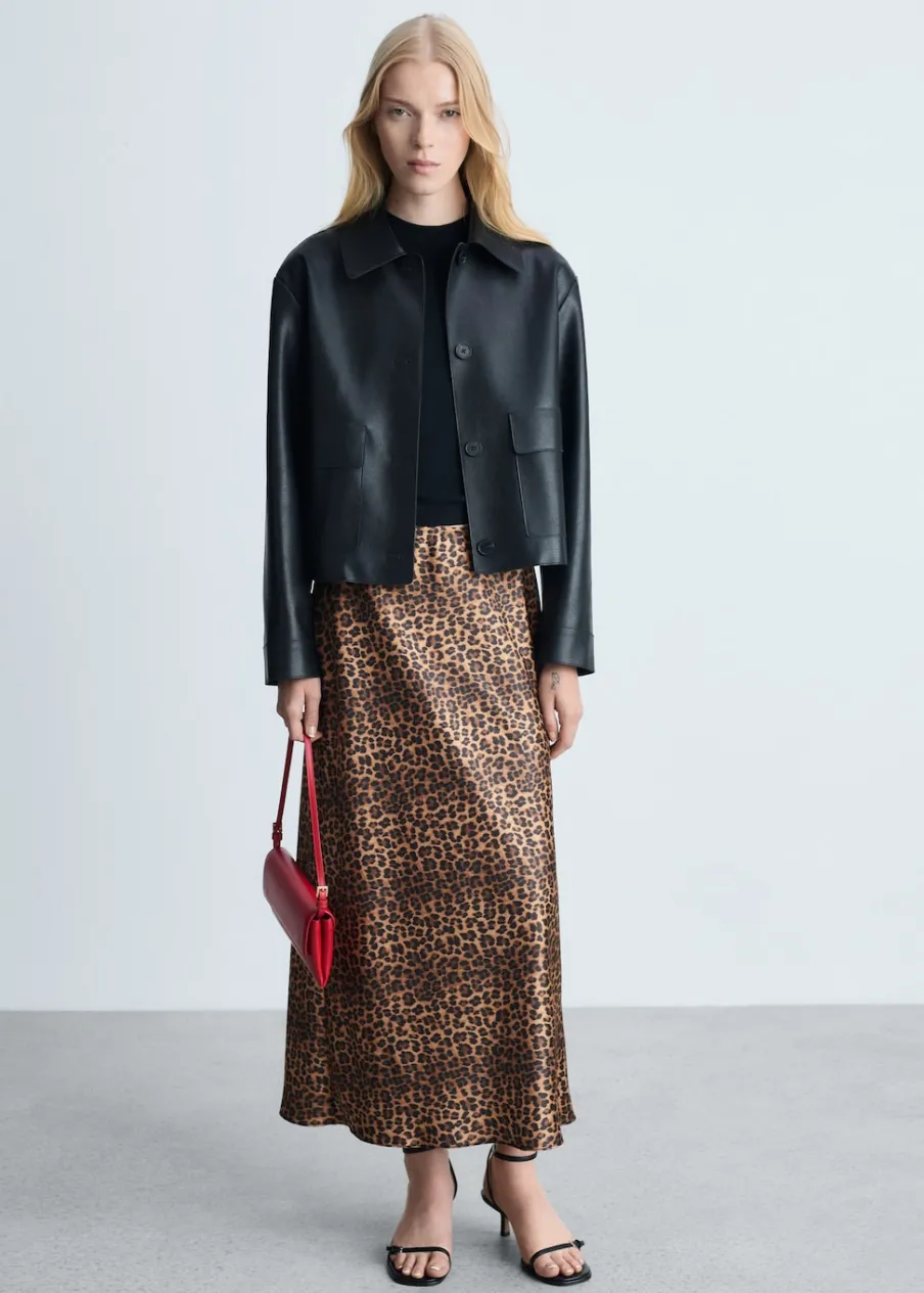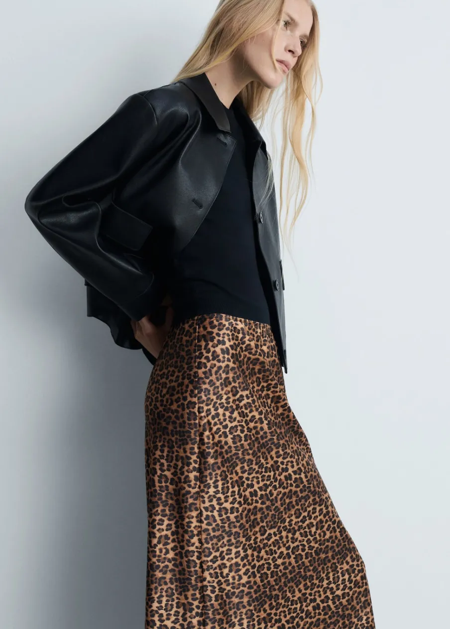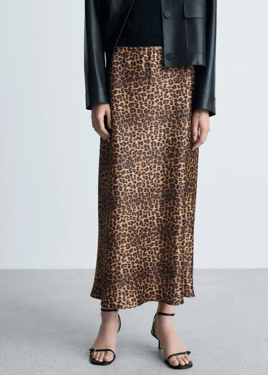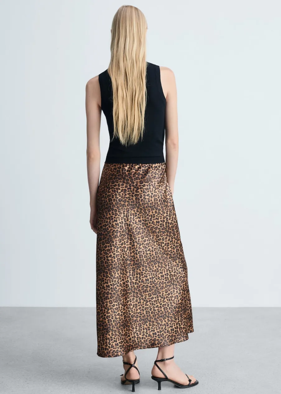 Satynowa tkanina. Średni stan. Model długi. Model prosty. Wzór w lamparcie cętki. Zwierzęcy wzór. Bez zapięcia. Elastyczny pas. Modelka ma 180 cm wzrostu i nosi rozmiar S. Modelka ma 178 cm wzrostu i nosi rozmiar S/36.