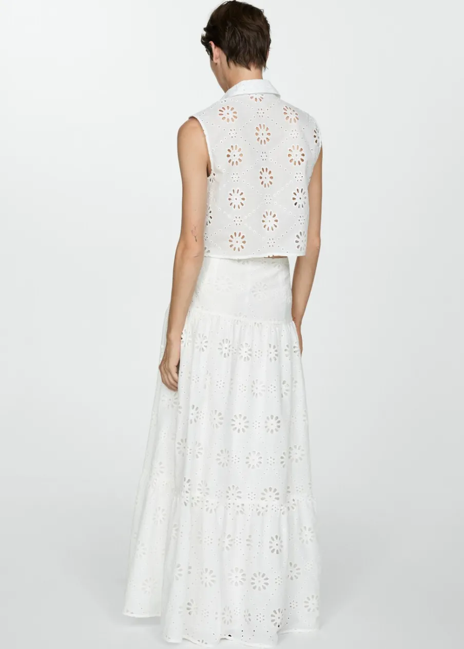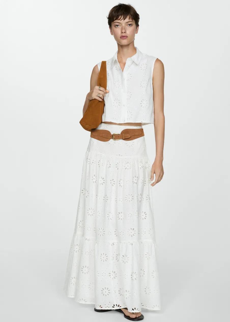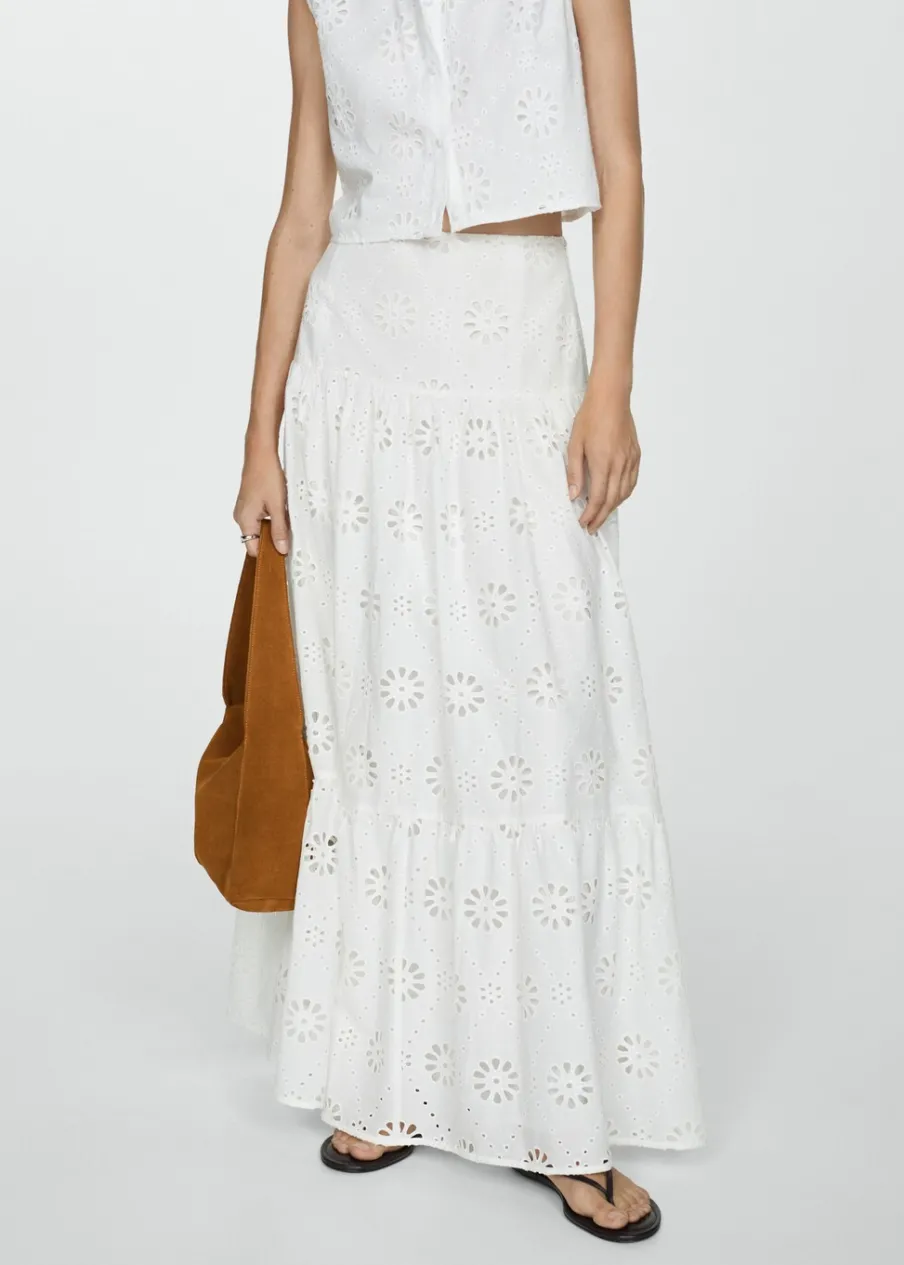 Model evasé. Model długi. Ażurowy model. Podwyższony stan. Boczne zapięcie na suwak. Falbana u dołu. Haftowany motyw. Tkanina z 100% bawełny.