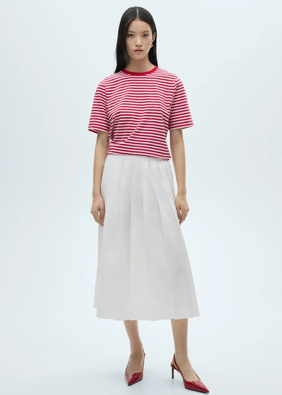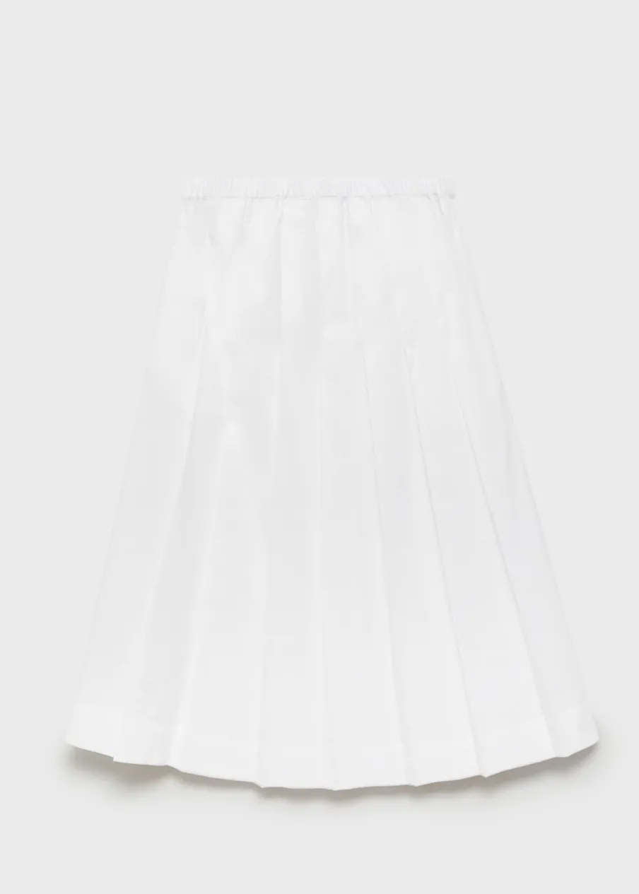 Krój do kolan. Model evasé. Fason z zakładkami. Kryte zapięcie na zamek z boku. Tkanina z 100% bawełny.