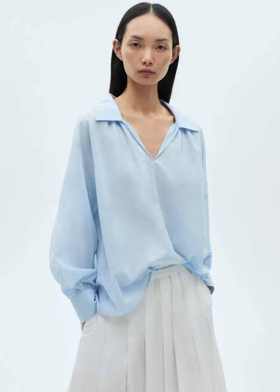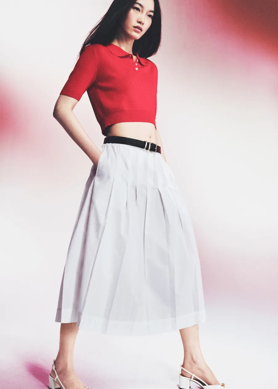 OpisKrój do kolan. Model evasé. Fason z zakładkami. Kryte zapięcie na zamek z boku. Tkanina z 100% bawełny.