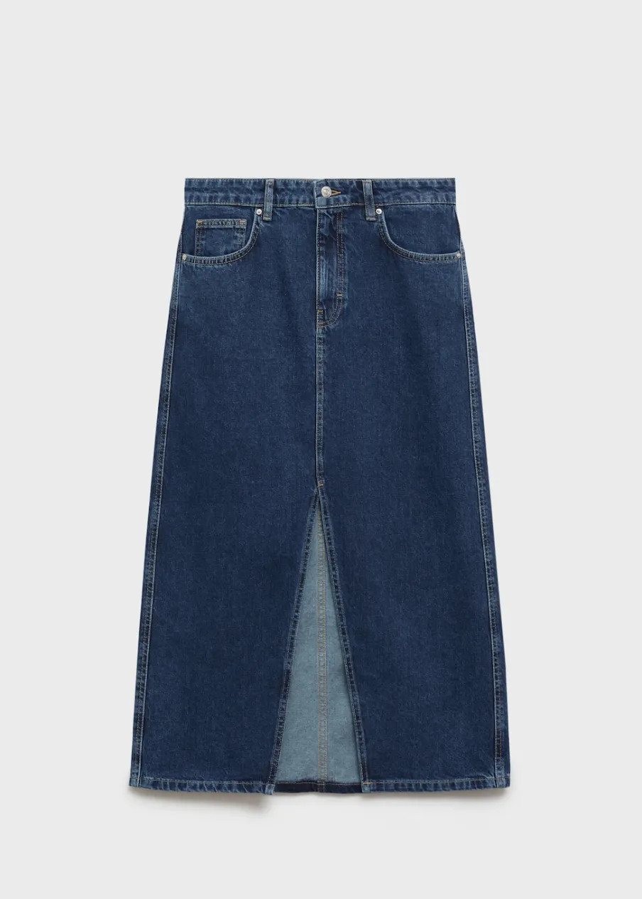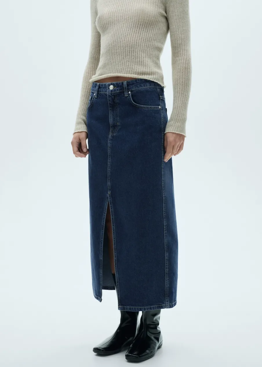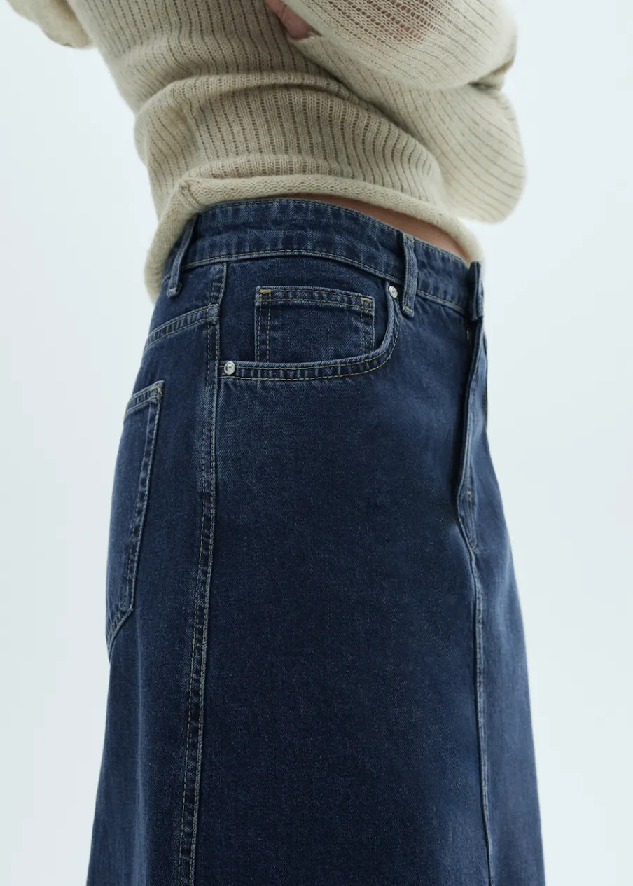 Tkanina bawełniana w dżinsowym stylu. Krój do kolan. Model prosty. Szlufki. Pięć kieszeni. Zapięcie na suwak i guzik. Rozcięcie z przodu u dołu. Modelka ma 178 cm wzrostu i nosi rozmiar S/36.