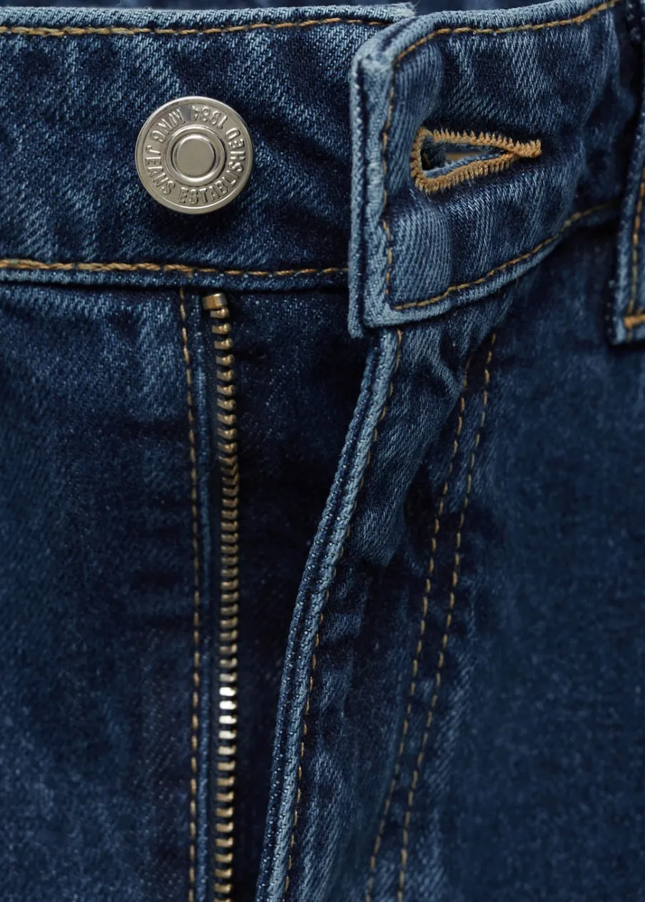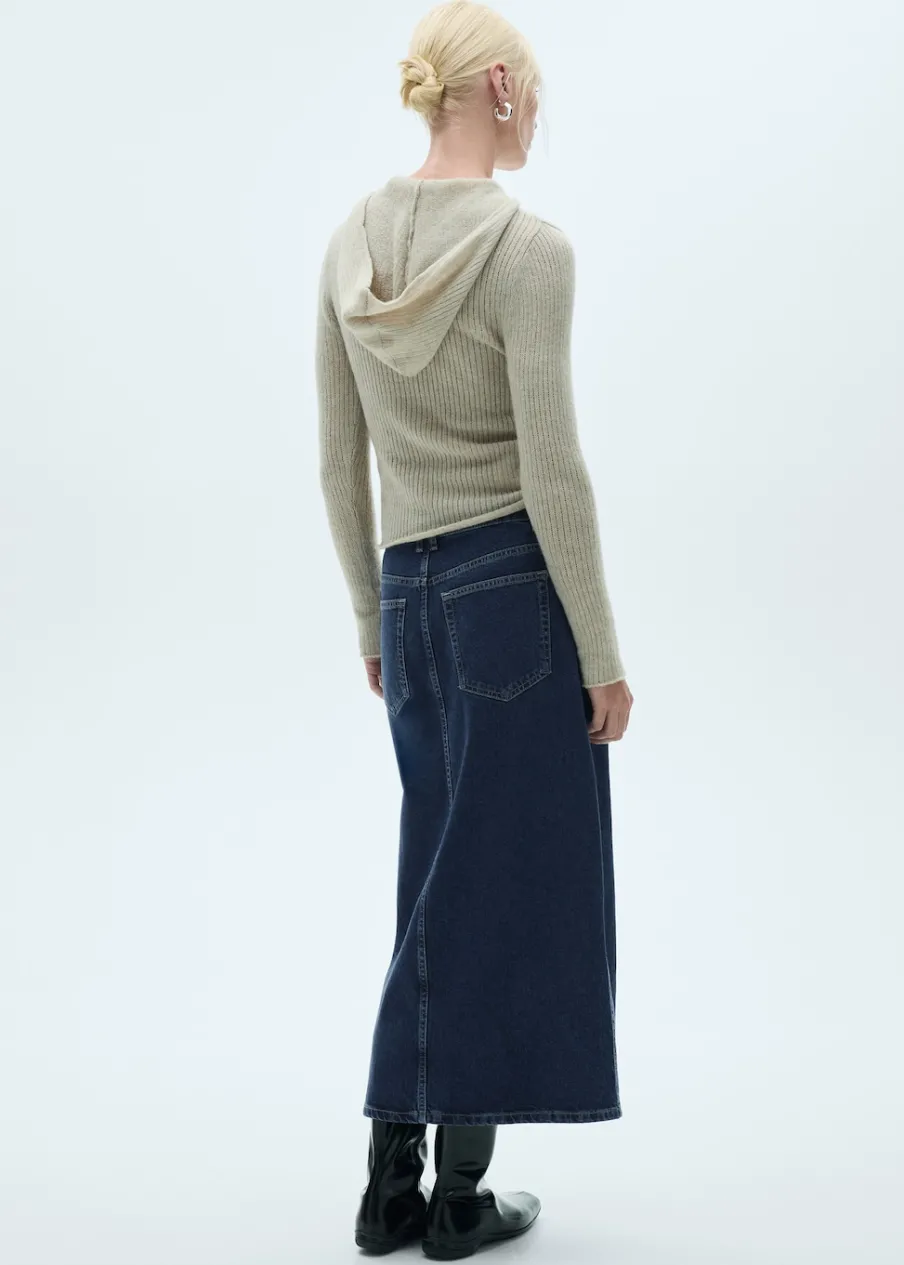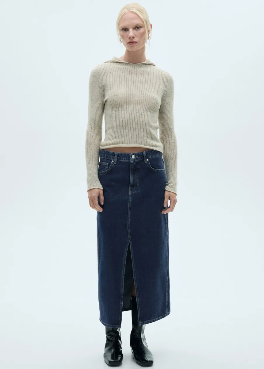 Tkanina bawełniana w dżinsowym stylu. Krój do kolan. Model prosty. Szlufki. Pięć kieszeni. Zapięcie na suwak i guzik. Rozcięcie z przodu u dołu. Modelka ma 178 cm wzrostu i nosi rozmiar S/36.