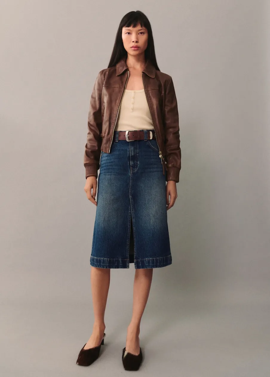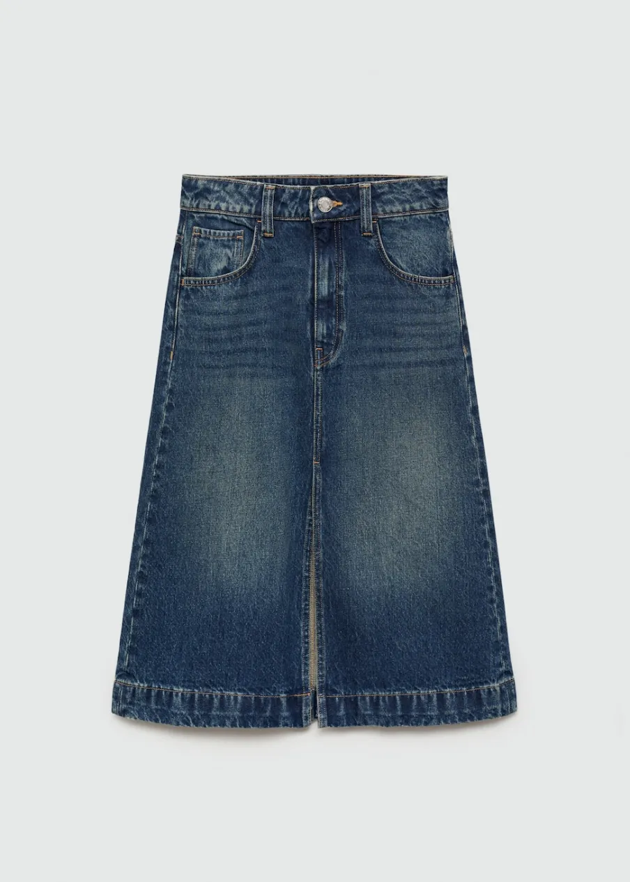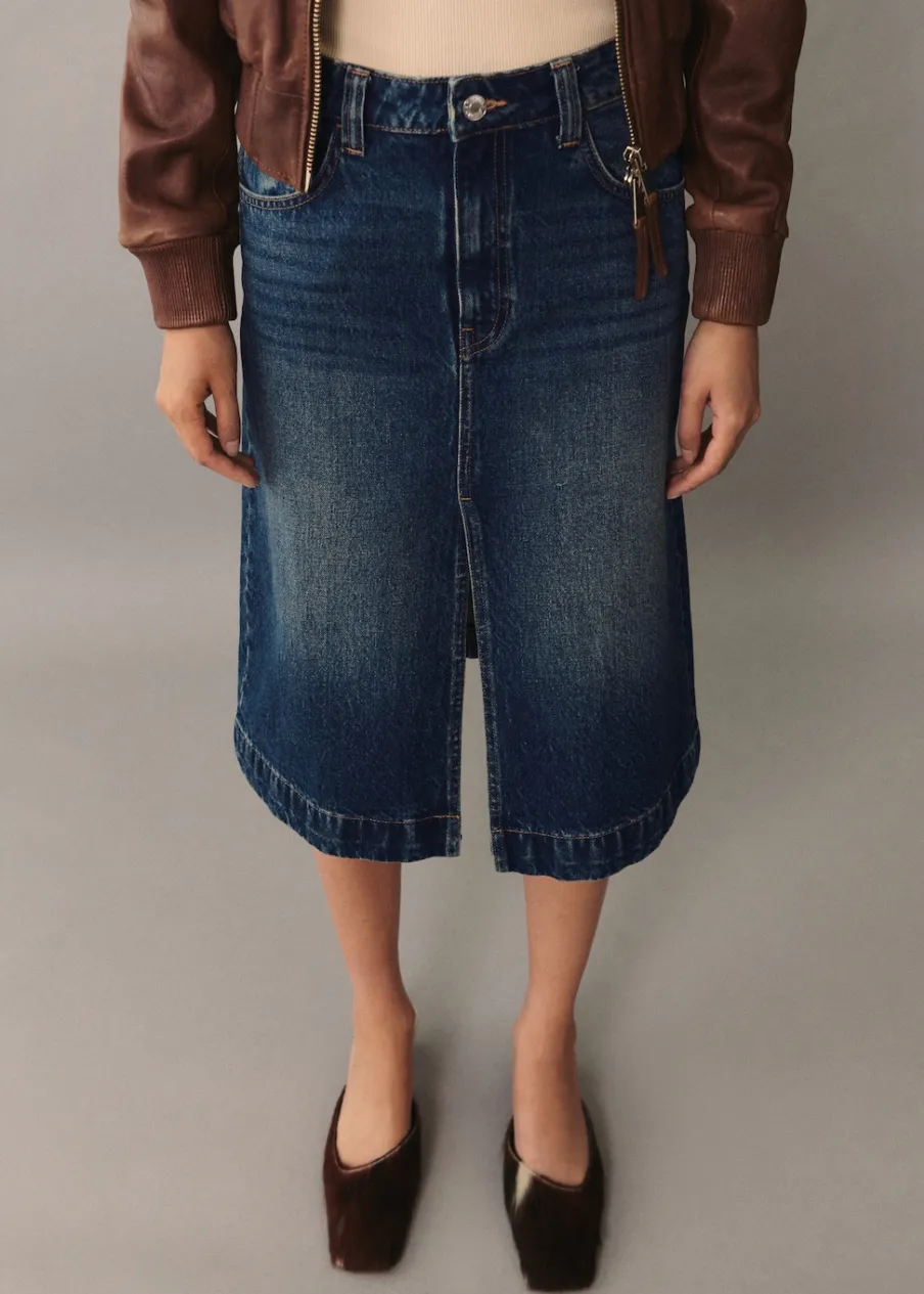 Tkanina bawełniana w dżinsowym stylu. Podwyższony stan. Model evasé. Krój do kolan. Pięć kieszeni. Szlufki. Rozcięcie u dołu. Modelka ma 177 cm wzrostu i nosi rozmiar S/36. Zapięcie na zamek i guzik z przodu.