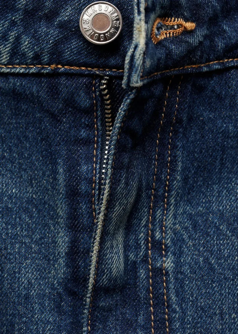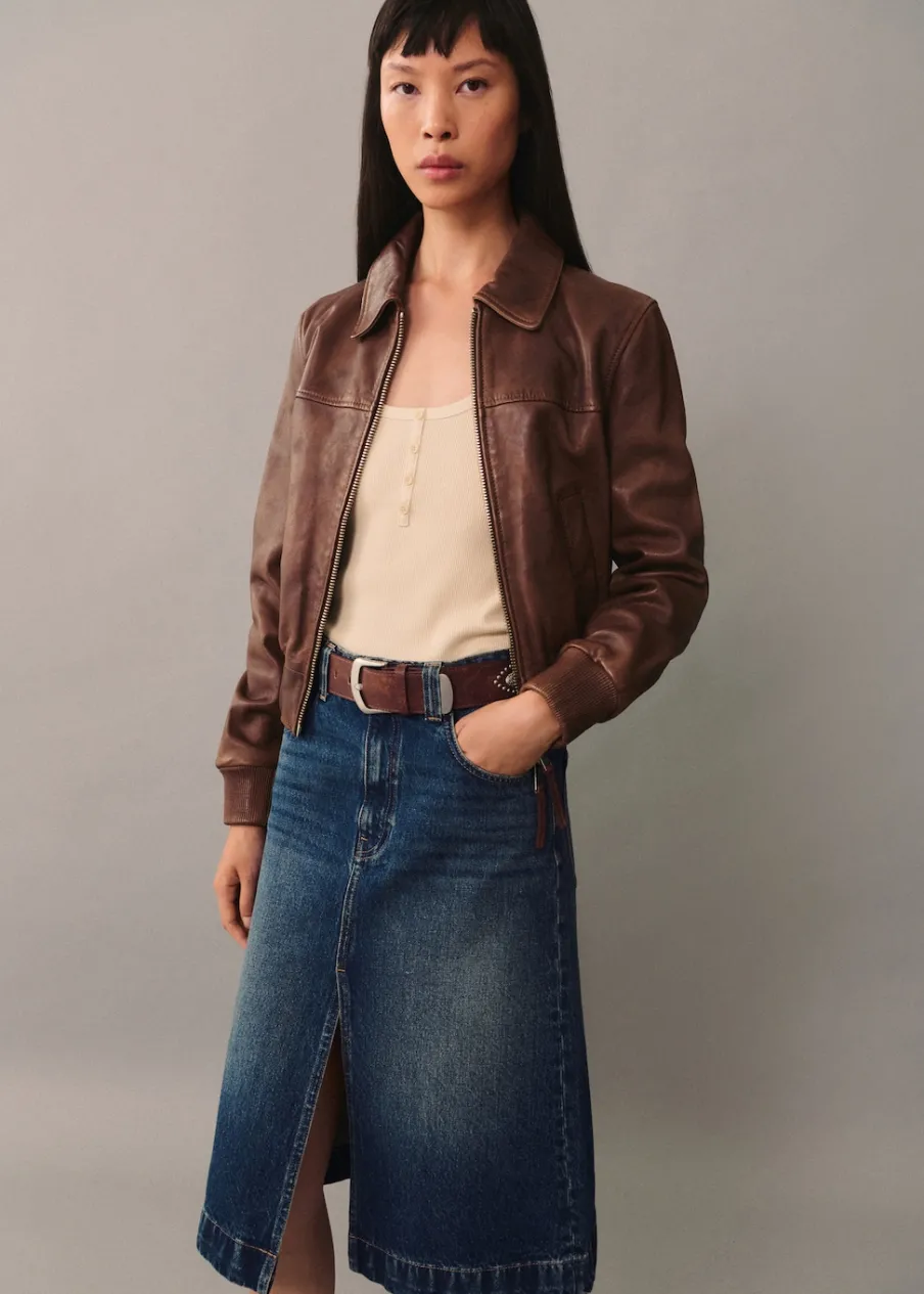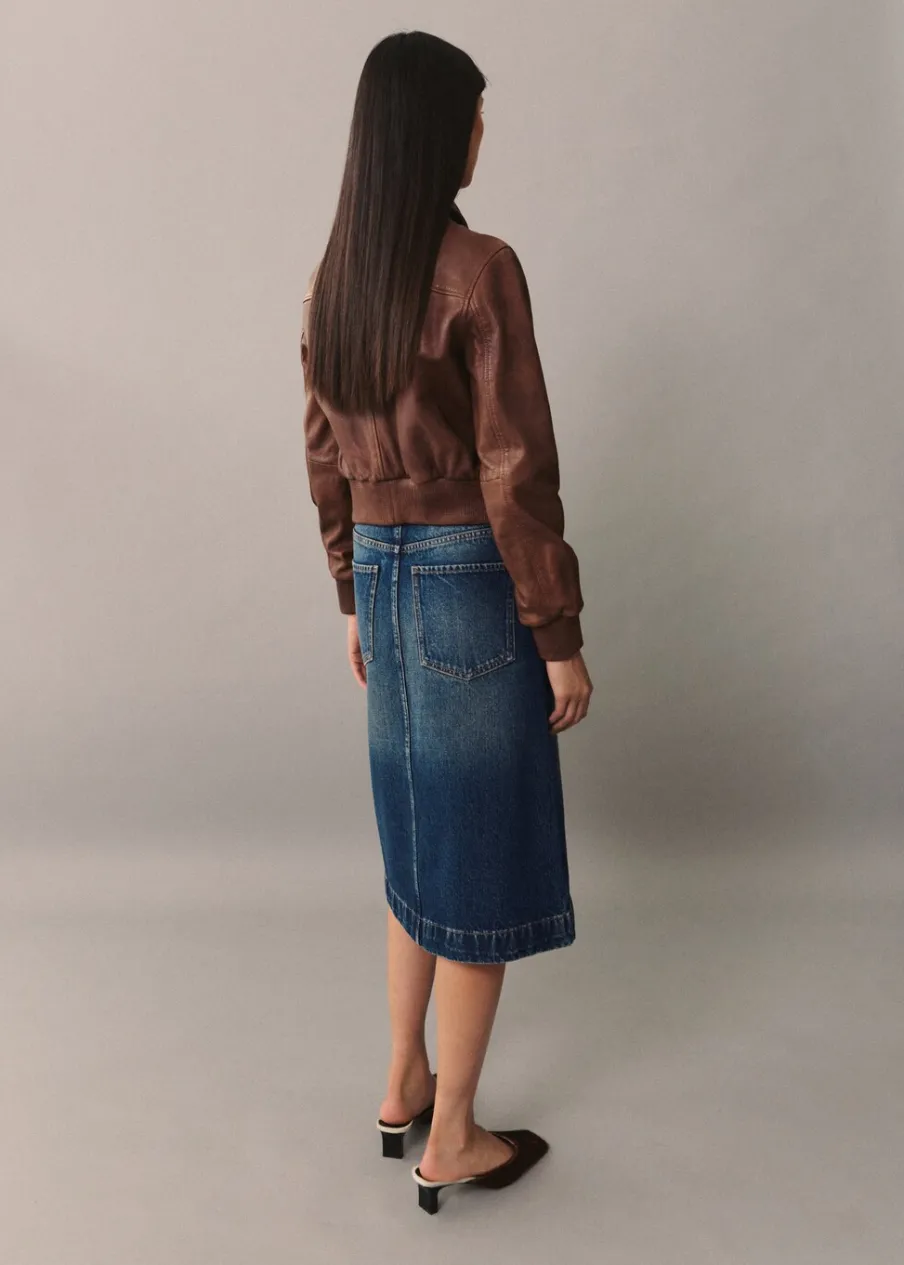 Tkanina bawełniana w dżinsowym stylu. Podwyższony stan. Model evasé. Krój do kolan. Pięć kieszeni. Szlufki. Rozcięcie u dołu. Modelka ma 177 cm wzrostu i nosi rozmiar S/36. Zapięcie na zamek i guzik z przodu.