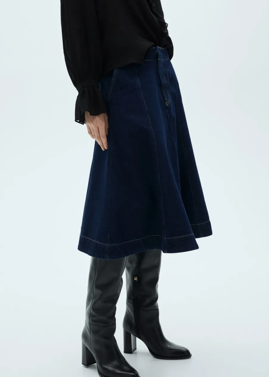 Tkanina bawełniana w dżinsowym stylu. Model evasé. Krój do kolan. Podwyższony stan. Dwie kieszenie boczne. Zapięcie na suwak, guzik i haftki kryte plisą.