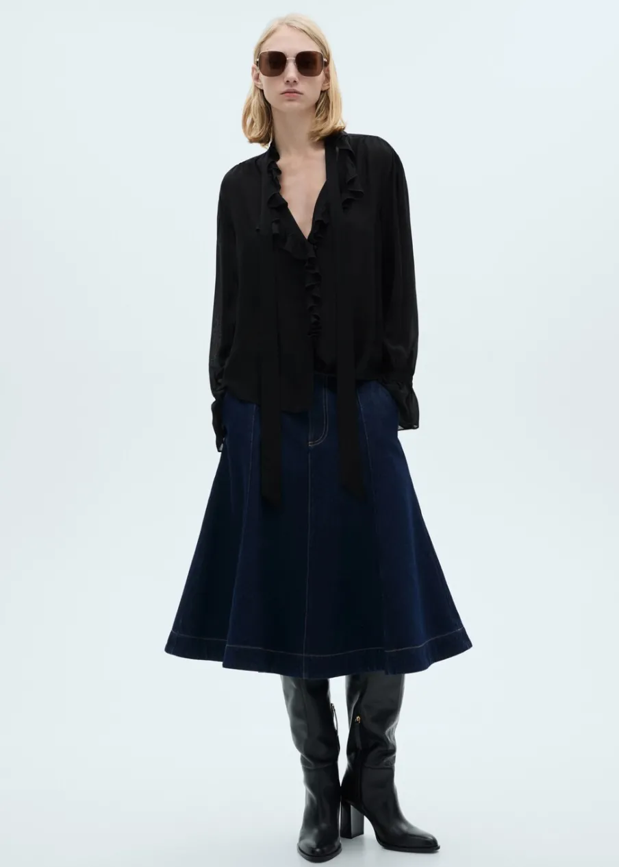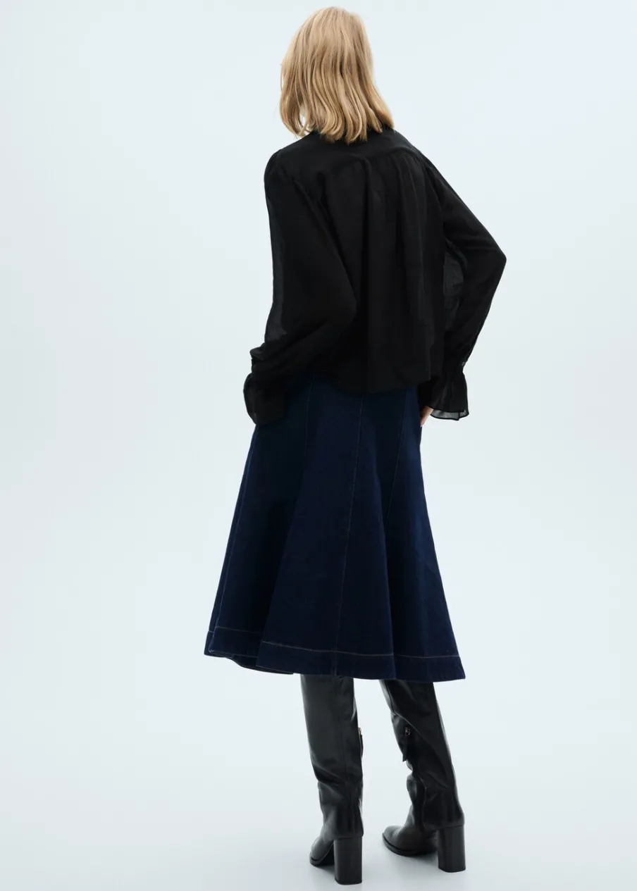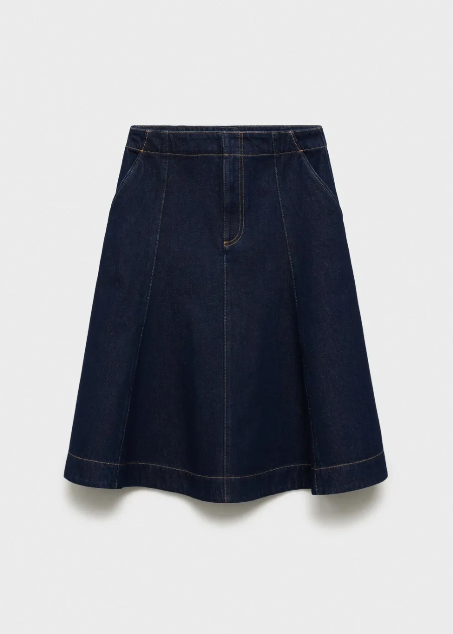 OpisTkanina bawełniana w dżinsowym stylu. Model evasé. Krój do kolan. Podwyższony stan. Dwie kieszenie boczne. Zapi…
