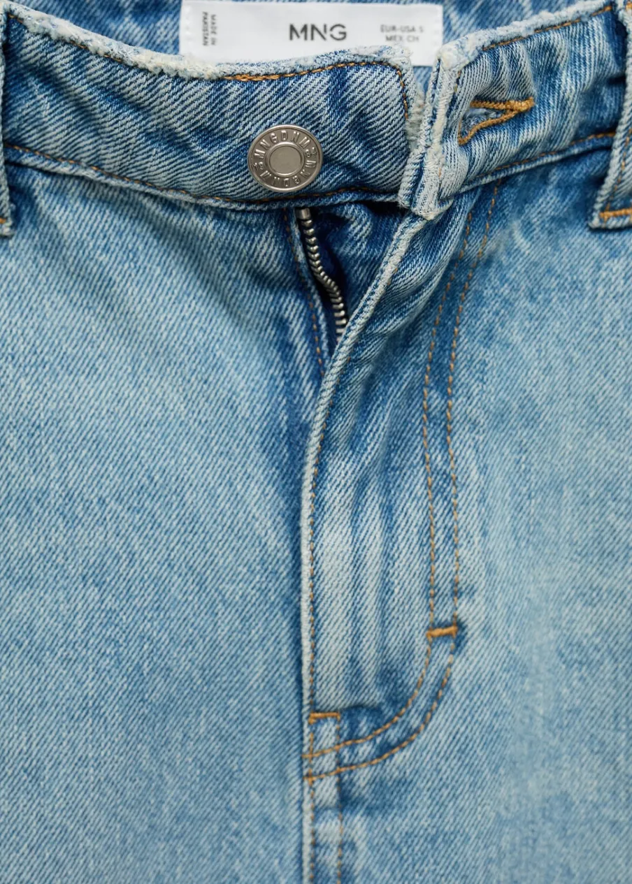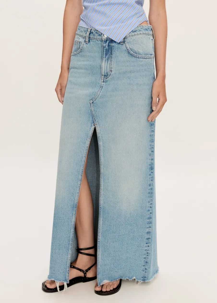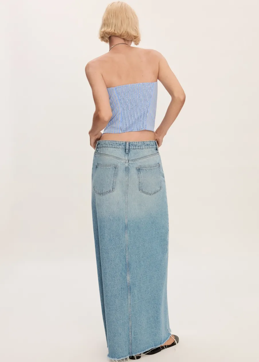 Tkanina bawełniana w dżinsowym stylu. Model długi. Model prosty. Zapięcie na suwak i guzik. Szlufki. Dwie kieszenie z przodu. Ozdobne szwy. Rozcięcie z przodu u dołu. Postrzępione nogawki. Sezon festiwalowy.