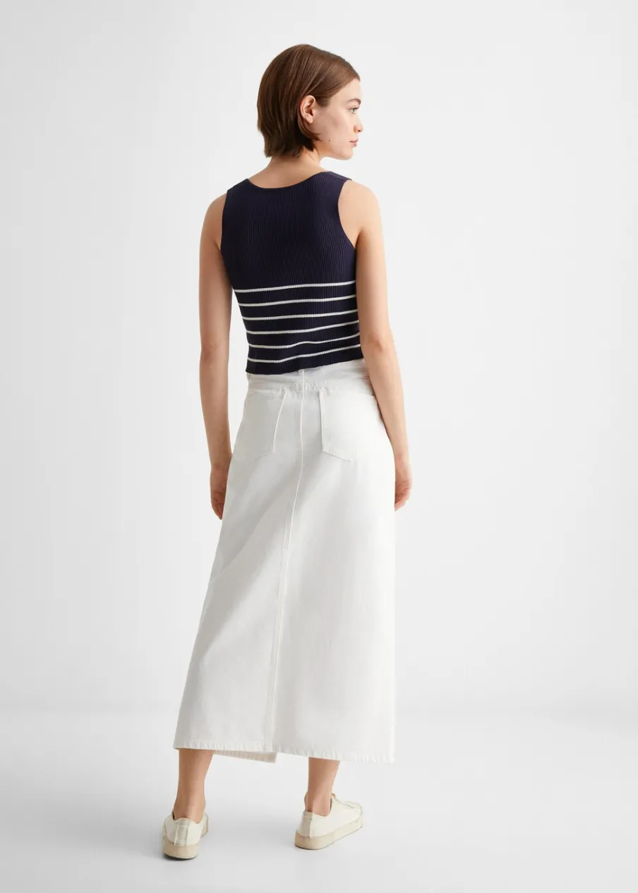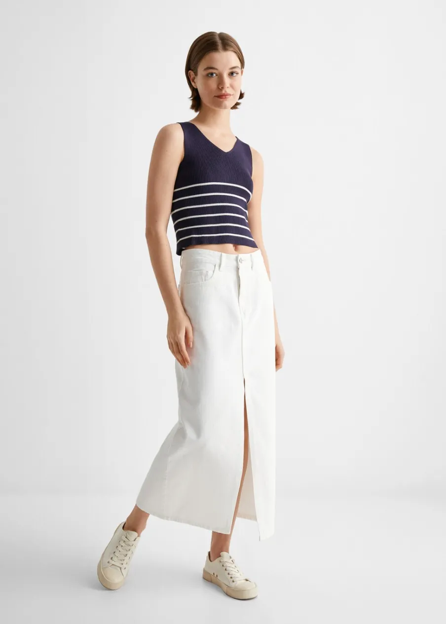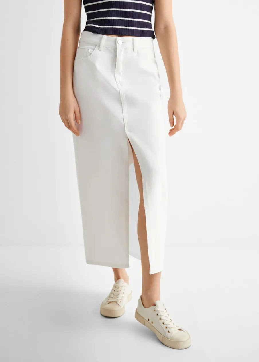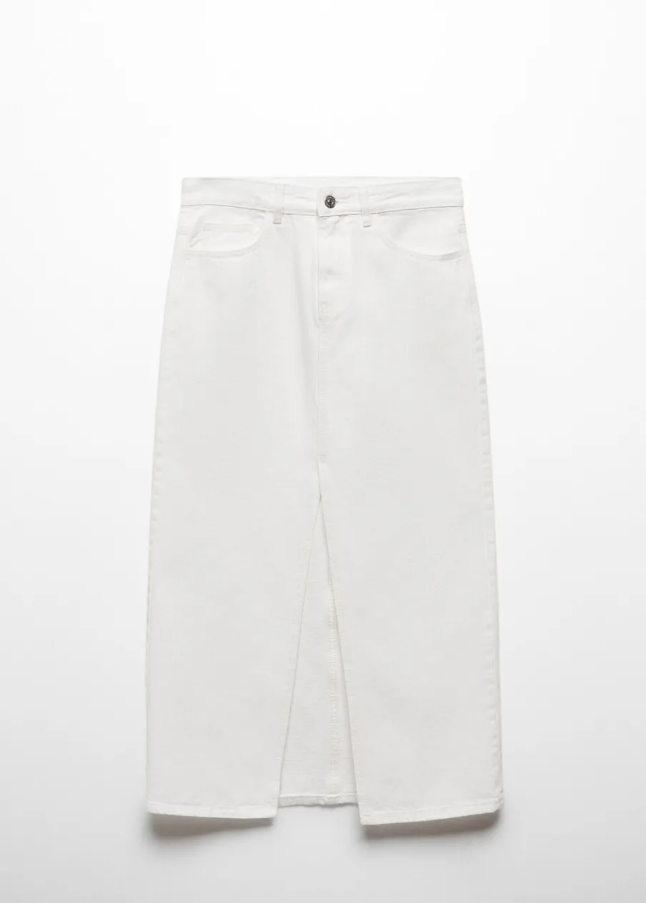 Tkanina bawełniana w dżinsowym stylu. Model prosty. Krój do kolan. Pięć kieszeni. Rozcięcie z przodu u dołu. Zapięcie na suwak i guzik.