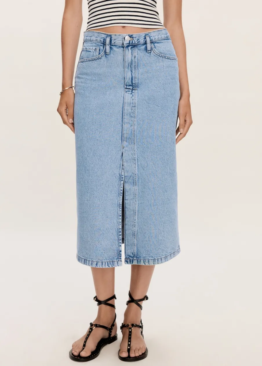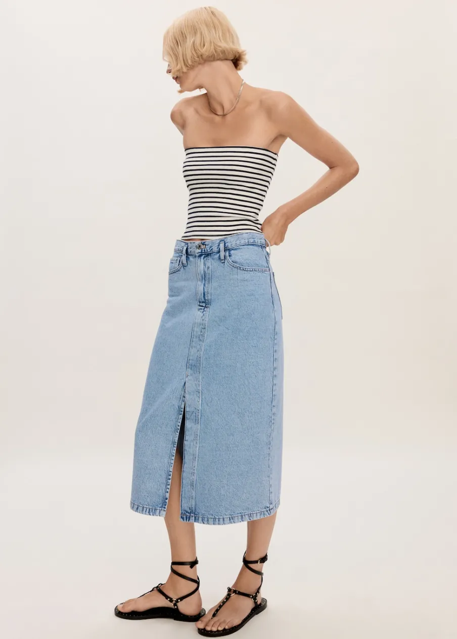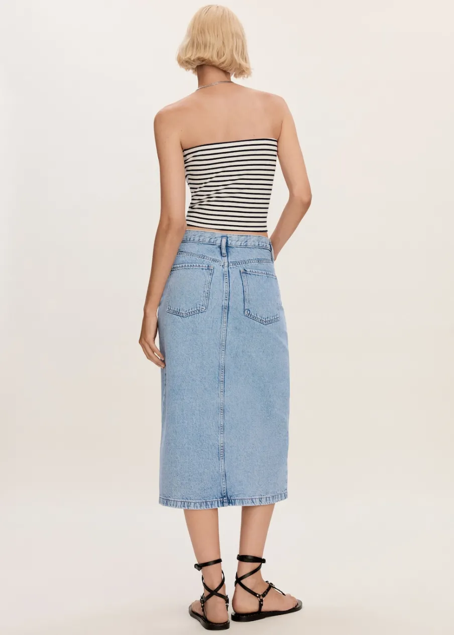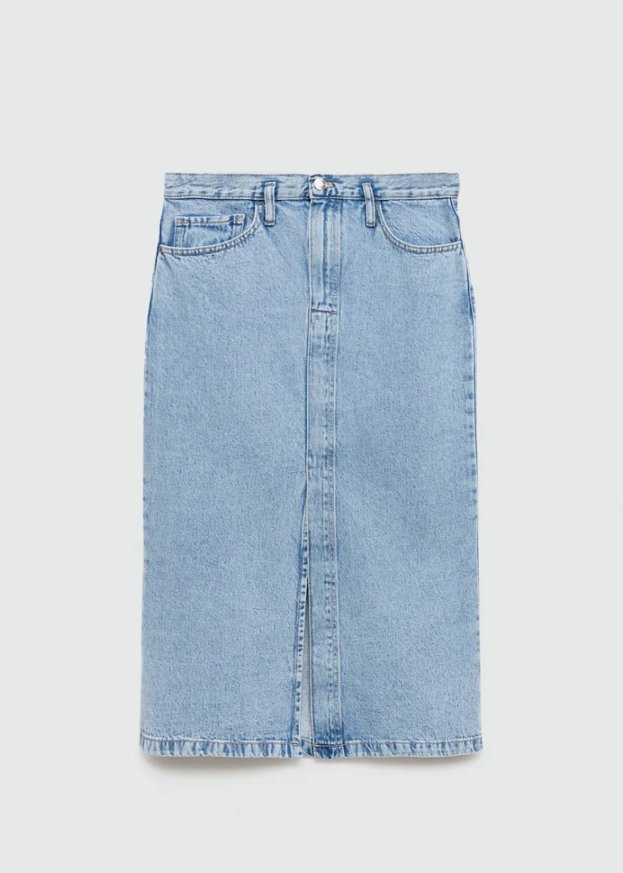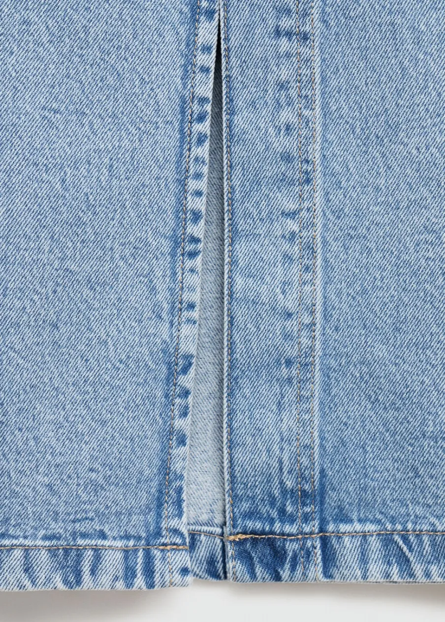 Tkanina bawełniana w dżinsowym stylu. Podwyższony stan. Model prosty. Krój do kolan. Dwie kieszenie z przodu. Kieszeń na bilon. Dwie kieszenie nakładane z tyłu. Szlufki. Zapięcie na suwak i guzik. Rozcięcie z przodu u dołu.