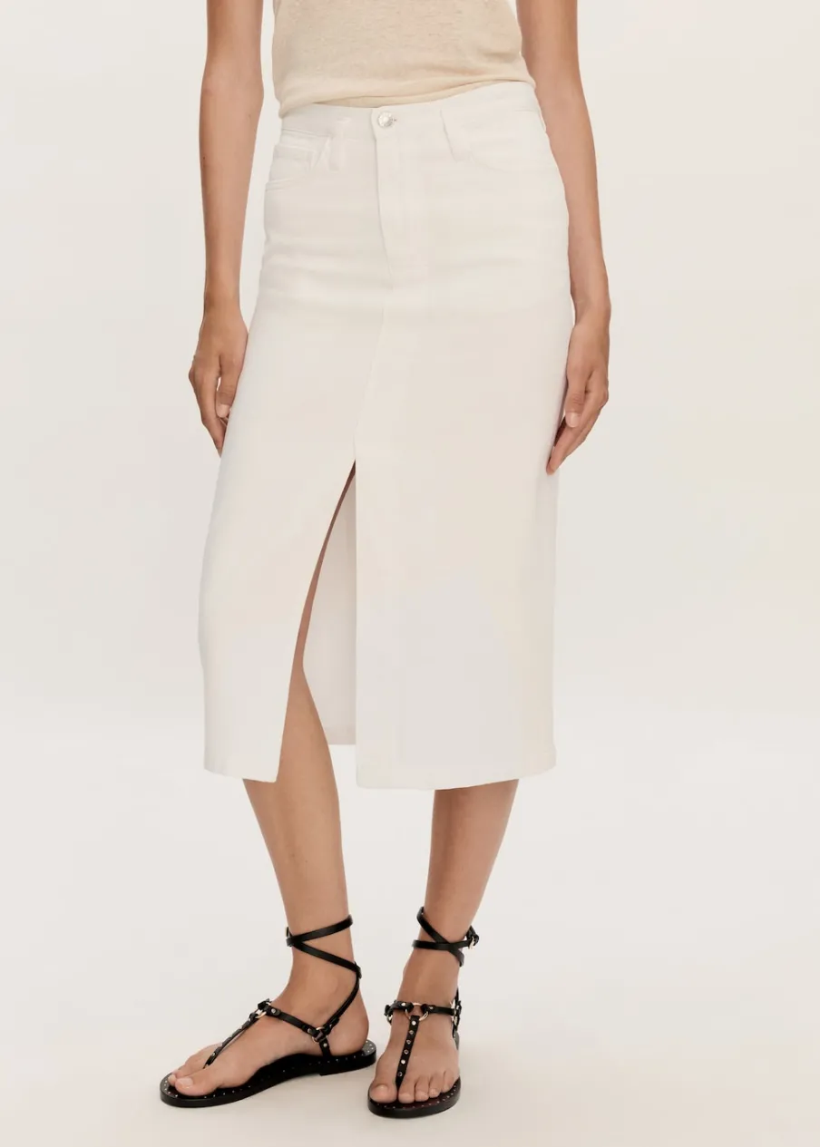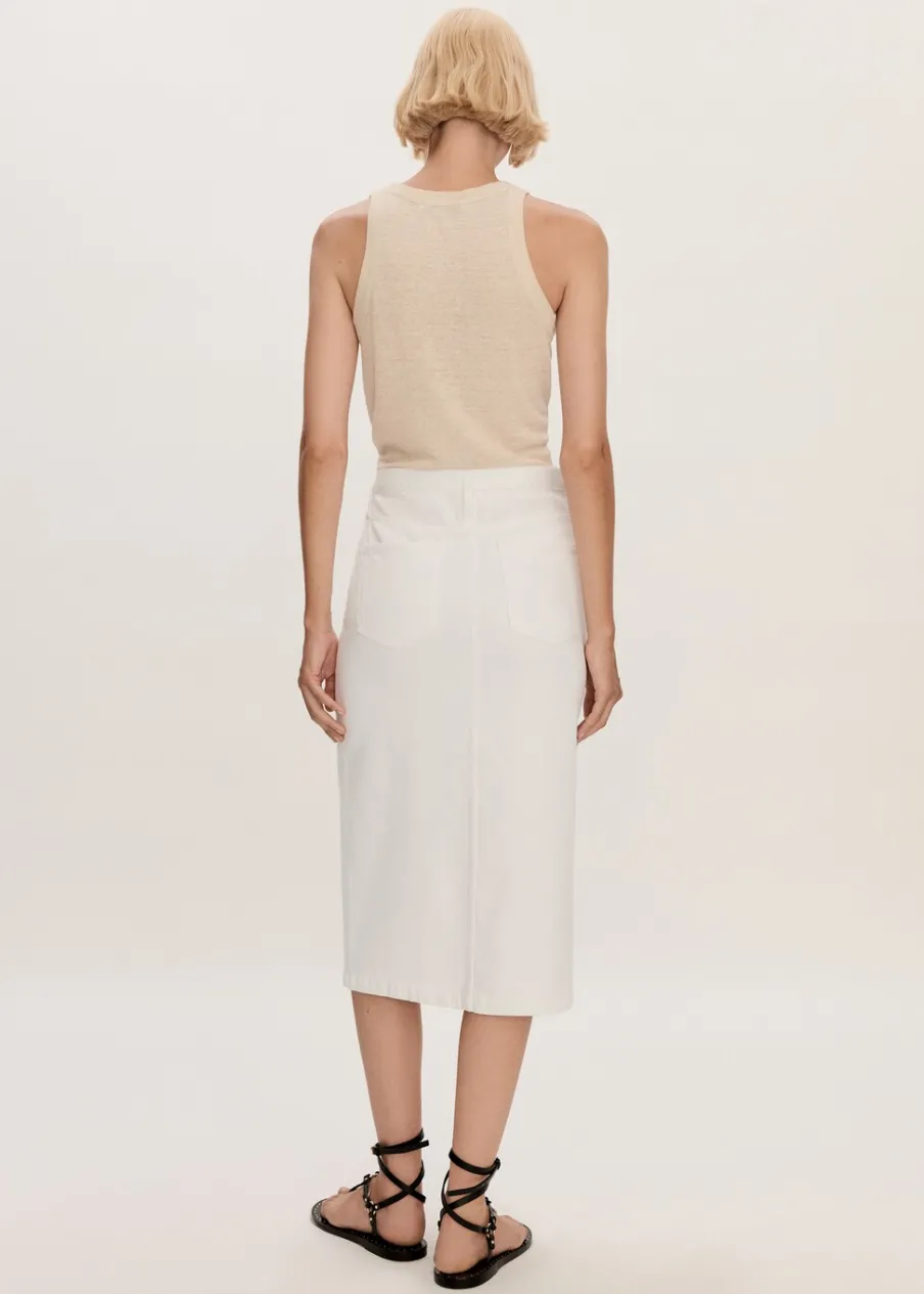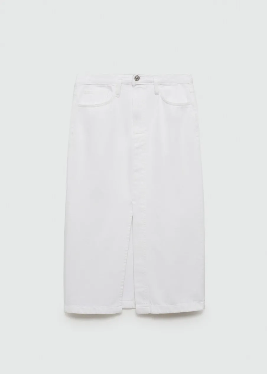 Tkanina bawełniana w dżinsowym stylu. Podwyższony stan. Model prosty. Krój do kolan. Dwie kieszenie z przodu. Kieszeń na bilon. Dwie kieszenie nakładane z tyłu. Szlufki. Zapięcie na suwak i guzik. Rozcięcie z przodu u dołu.