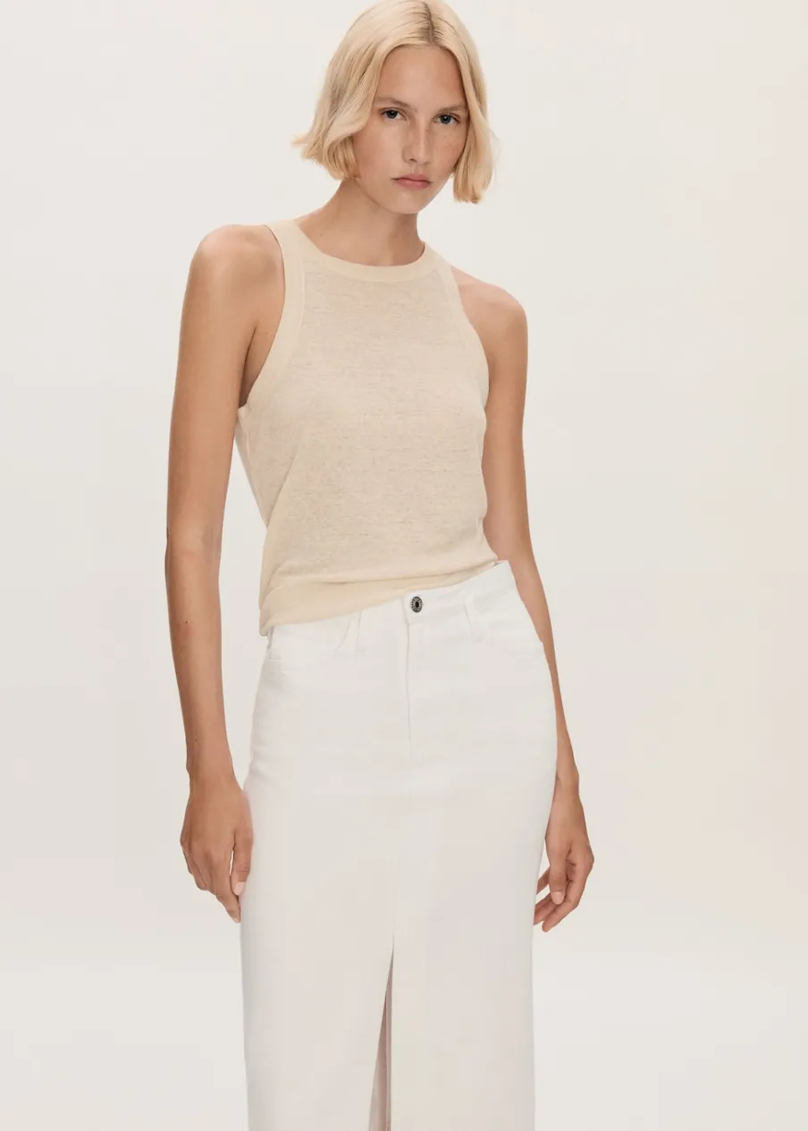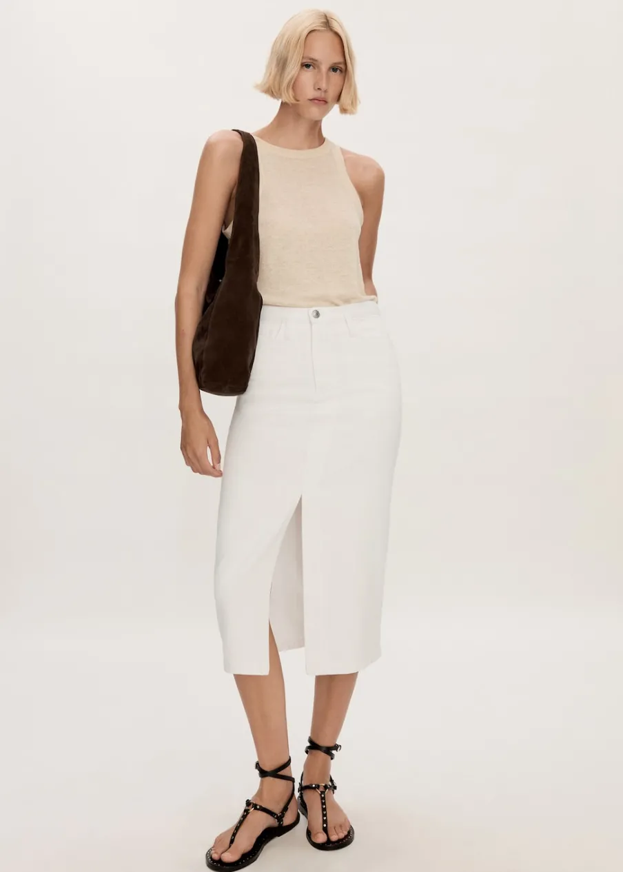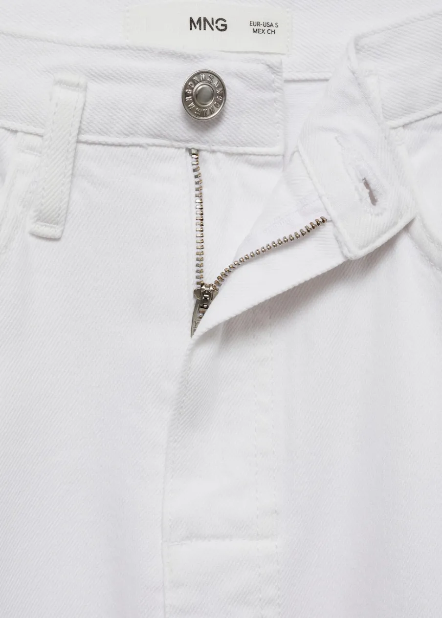 Tkanina bawełniana w dżinsowym stylu. Podwyższony stan. Model prosty. Krój do kolan. Dwie kieszenie z przodu. Kieszeń na bilon. Dwie kieszenie nakładane z tyłu. Szlufki. Zapięcie na suwak i guzik. Rozcięcie z przodu u dołu.