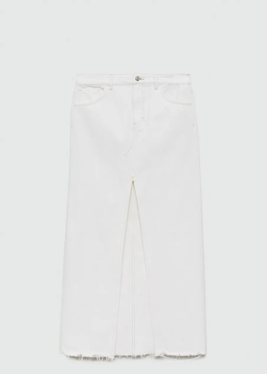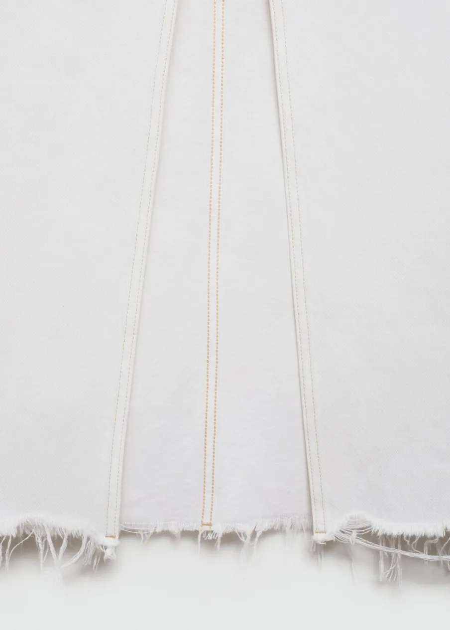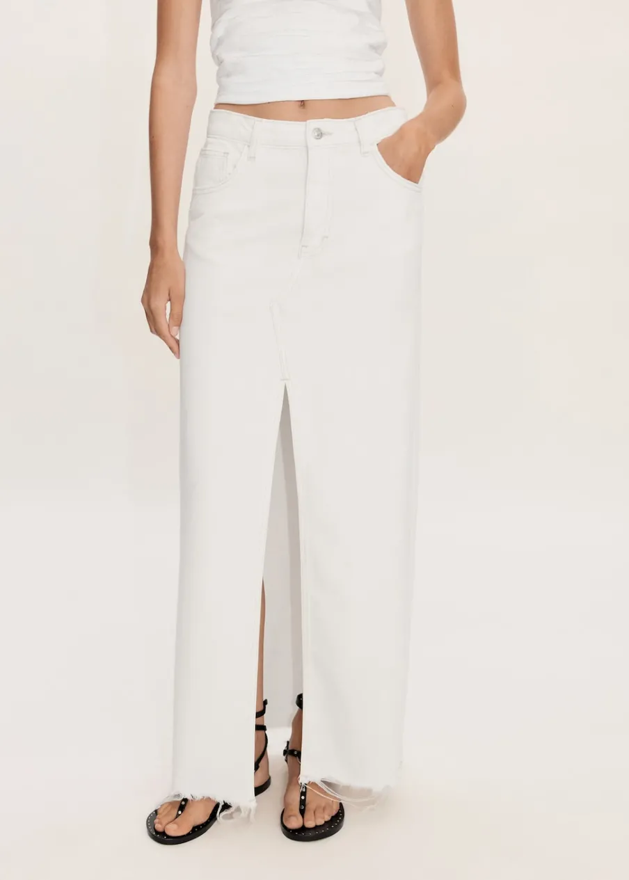 Tkanina bawełniana w dżinsowym stylu. Podwyższony stan. Model prosty. Model długi. Dwie kieszenie z przodu. Kieszeń na bilon. Dwie kieszenie nakładane z tyłu. Szlufki. Zapięcie na suwak i guzik. Rozcięcie z przodu u dołu. Postrzępione nogawki.