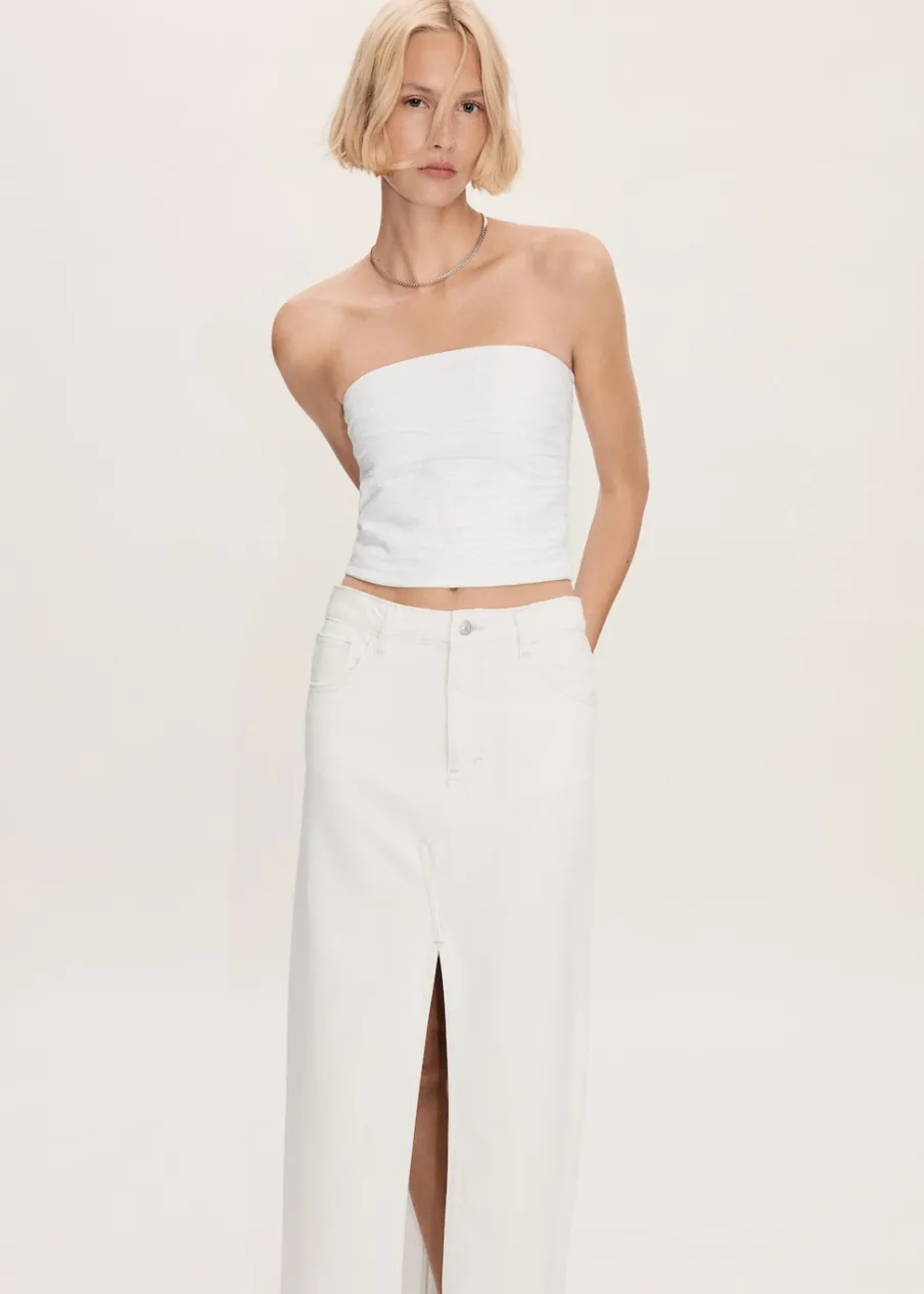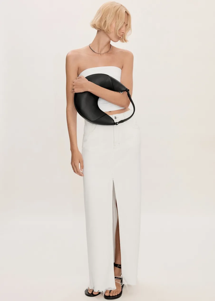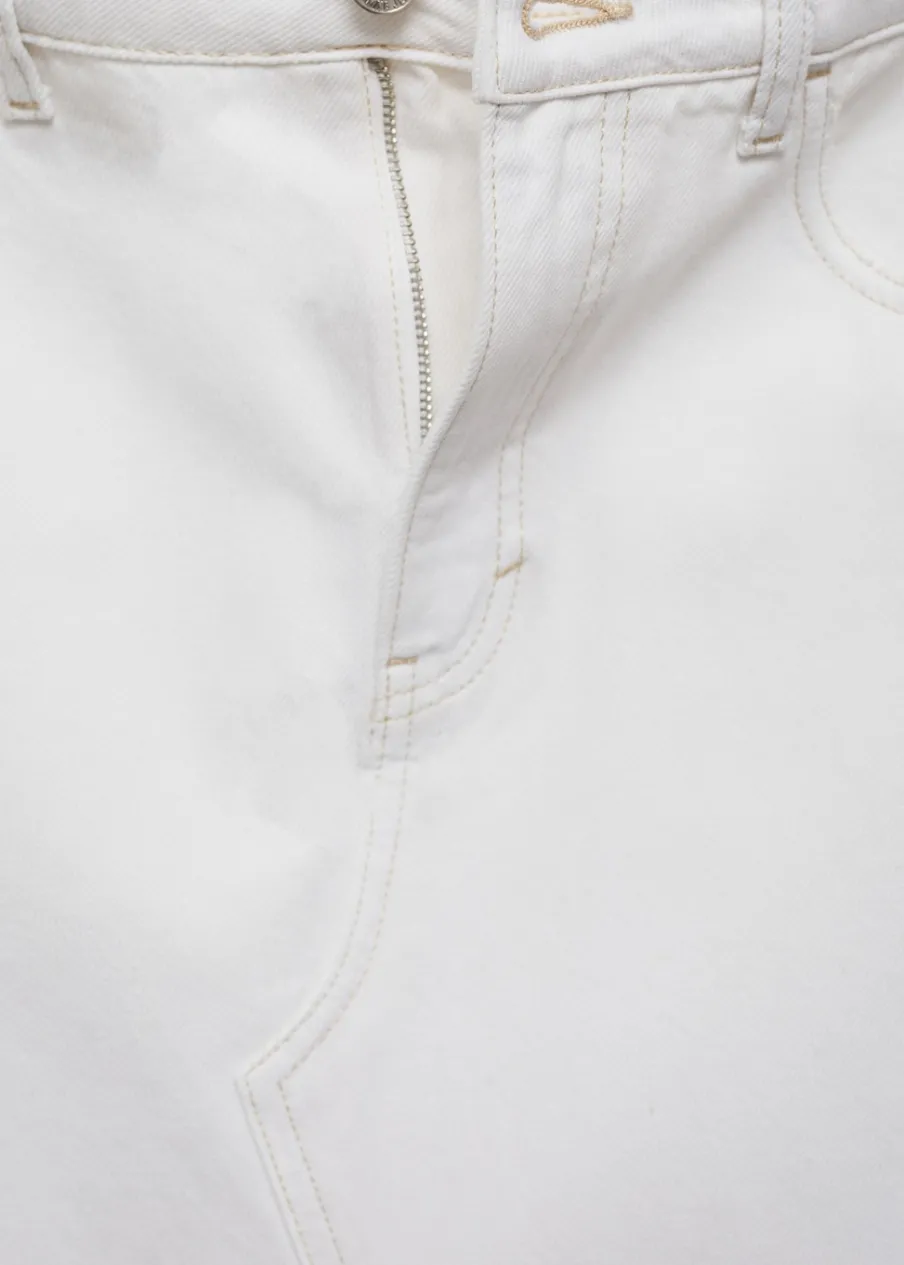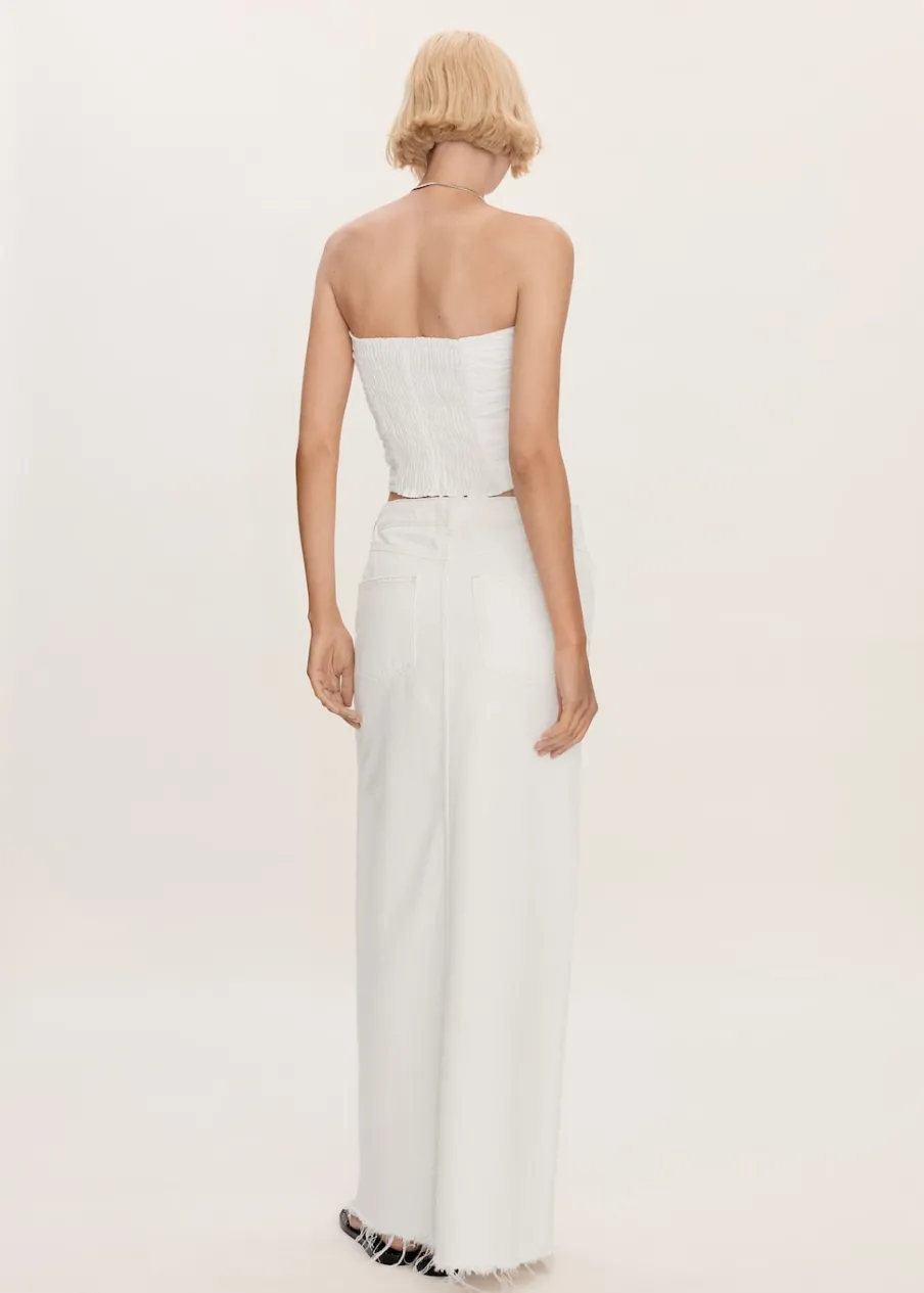 Tkanina bawełniana w dżinsowym stylu. Podwyższony stan. Model prosty. Model długi. Dwie kieszenie z przodu. Kieszeń na bilon. Dwie kieszenie nakładane z tyłu. Szlufki. Zapięcie na suwak i guzik. Rozcięcie z przodu u dołu. Postrzępione nogawki.