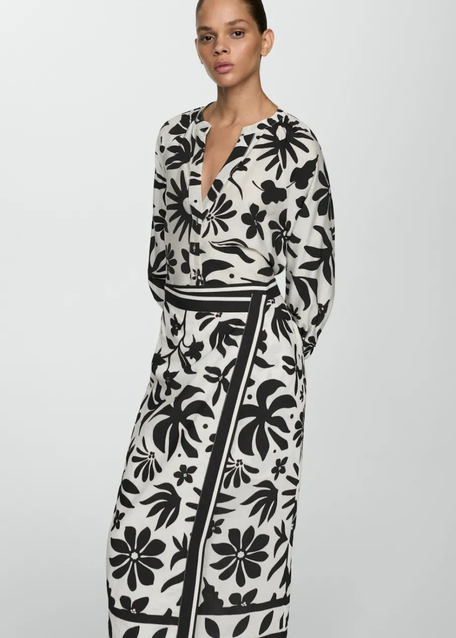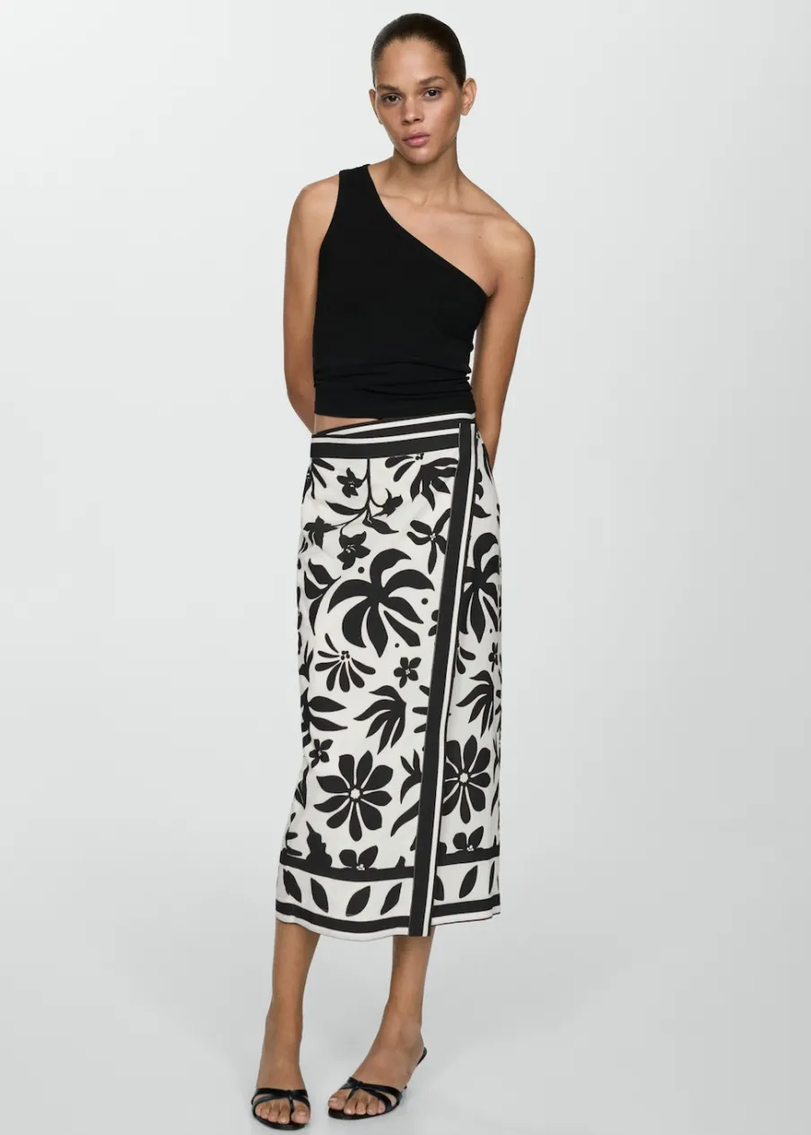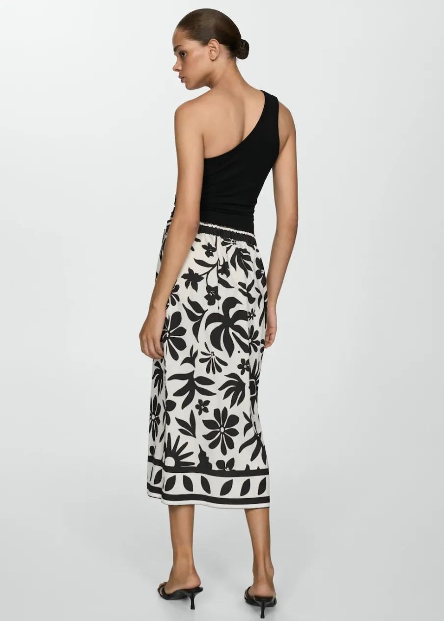 Lejąca tkanina. Podwyższony stan. Krój do kolan. Model prosty. Model zakładany. Kwiatowy wzór. Zapięcie na metalowy zacisk.