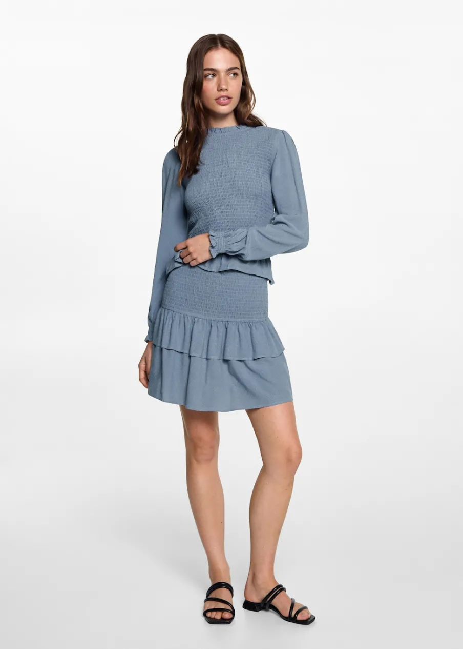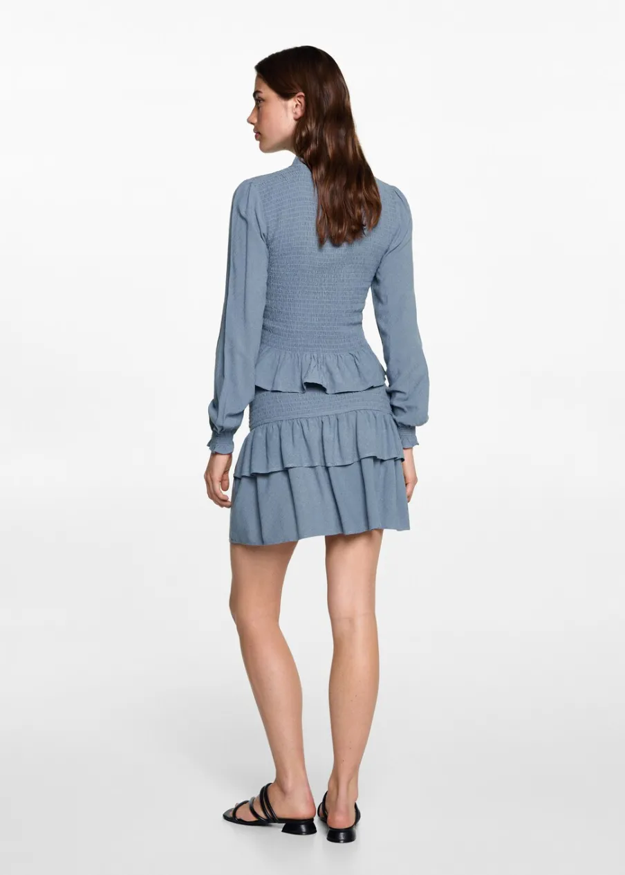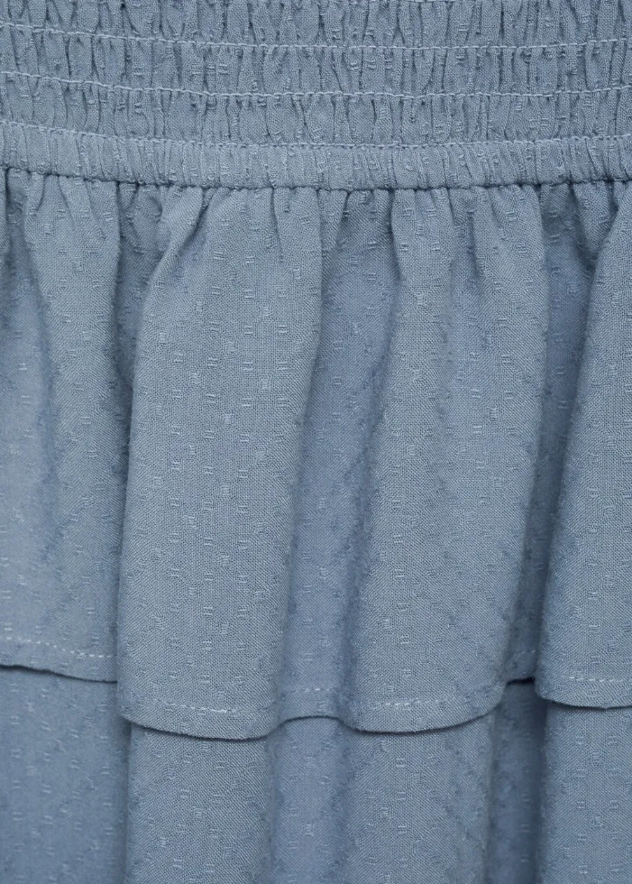 Dostępny zestaw total look. Model prosty. Marszczona talia. Z falbanami. Krótki krój. Modelka ma 172 cm wzrostu i nosi rozmiar M. Tkanina z wiskozy.