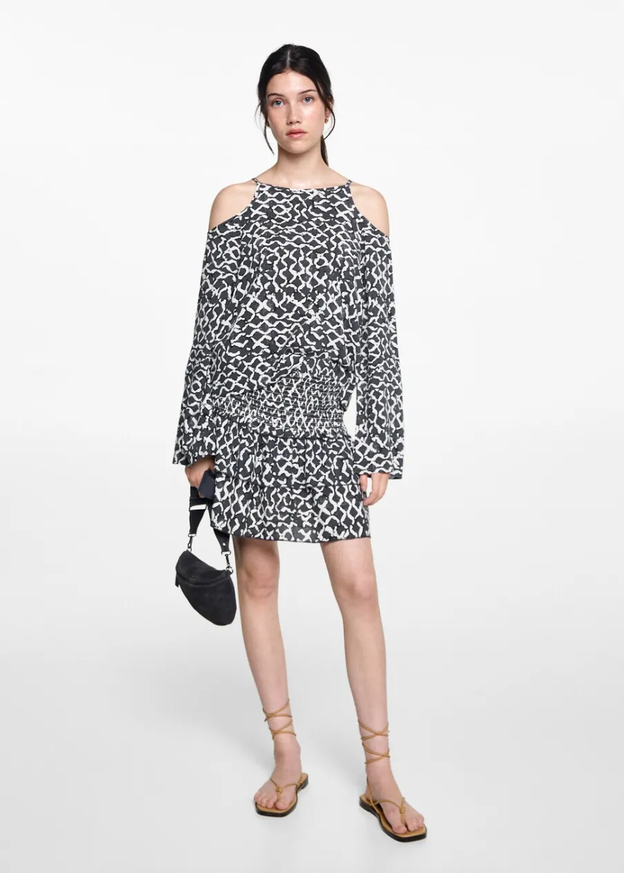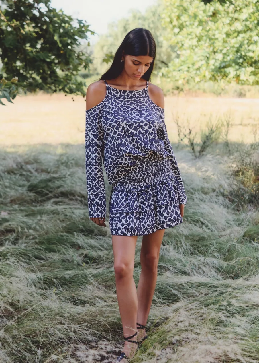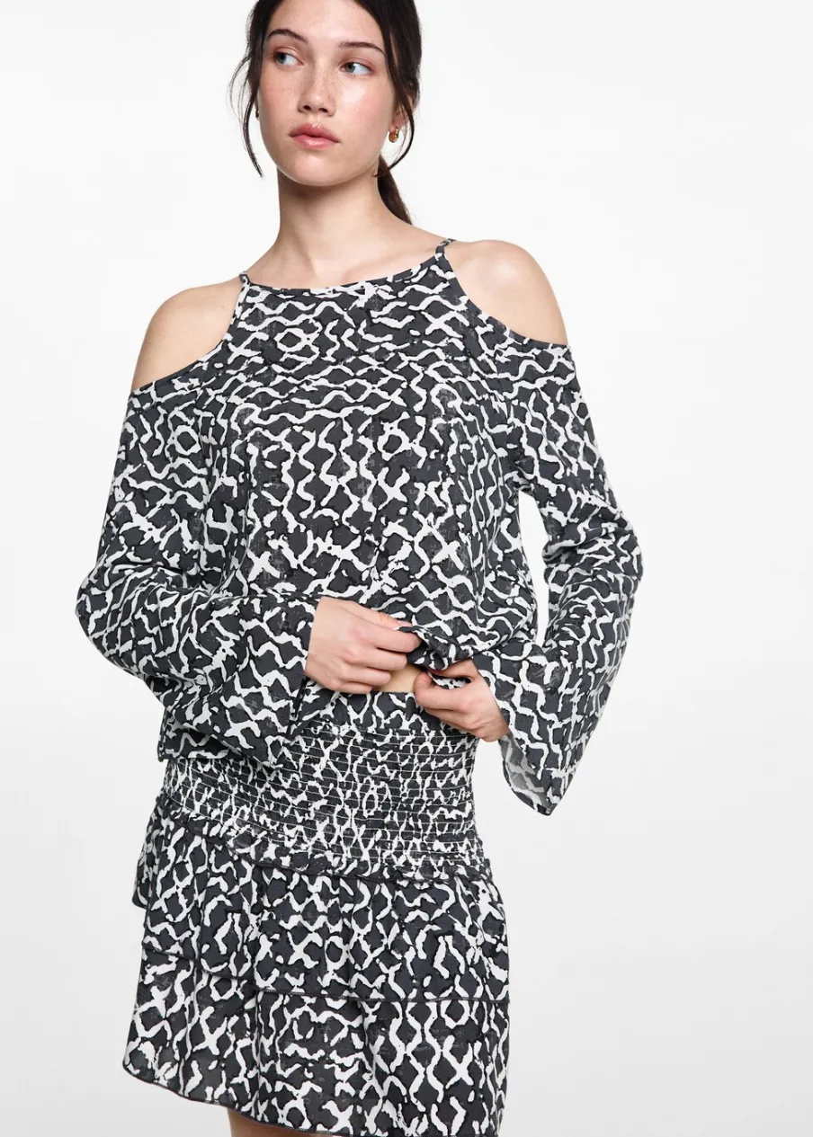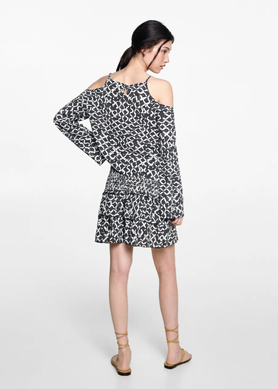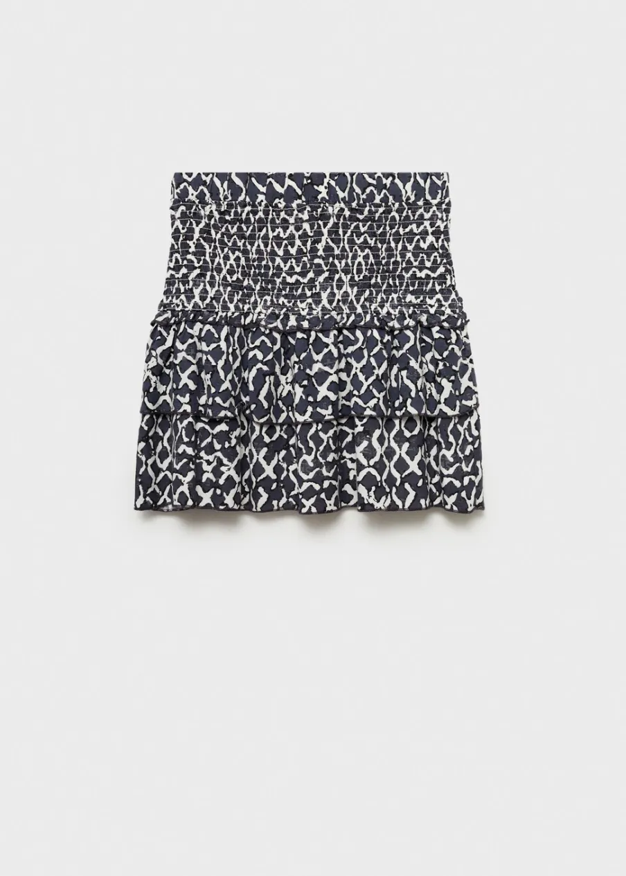 Model prosty. Ozdobne marszczenie. Elastyczny pas. Model z falbankami. Dostępny zestaw total look. Modelka ma 172 cm wzrostu i nosi rozmiar M. Nadruk. Tkanina z wiskozy.